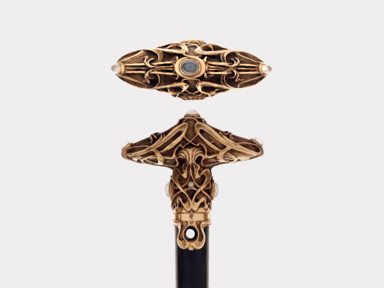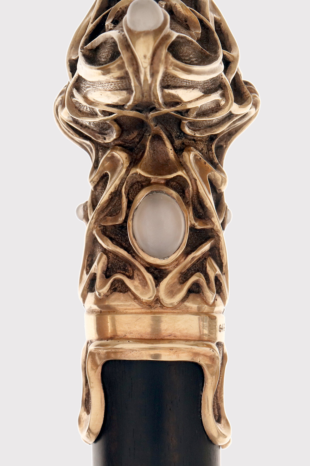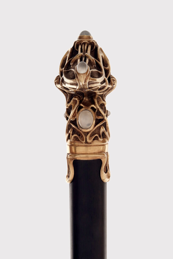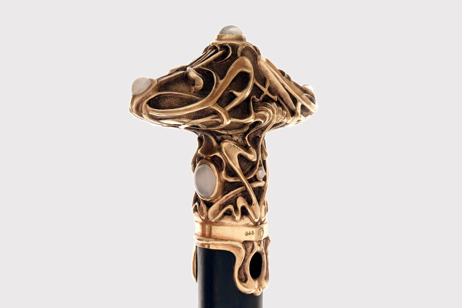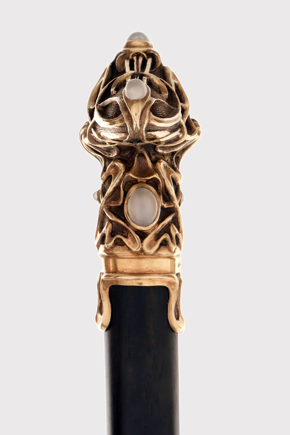 Bastone da passeggio in stile Art Nouveau: pomolo a forma di T, progettato ed eseguito da Georg Anton Scheid, in argento con pietre di luna cabochon. Una spettacolare gabbia Jugendstil, proporzionata, composta da nastri ondulati a rilievo in argento lucido, in contrasto con il fondo scuro delicatamente martellato. Il pomolo simmetrico, ricco di movimento ritmico, è impreziosito, davanti e dietro, terminali e parte superiore, da cabochon di pietre di luna. Al termina del manico, integrato sotto la fascia, si trova un occhiello per il cordino da polso. Canna in legno di ebano con puntale in metallo. Firmato Georg Anton Scheid, Vienna, Austria circa 1905.