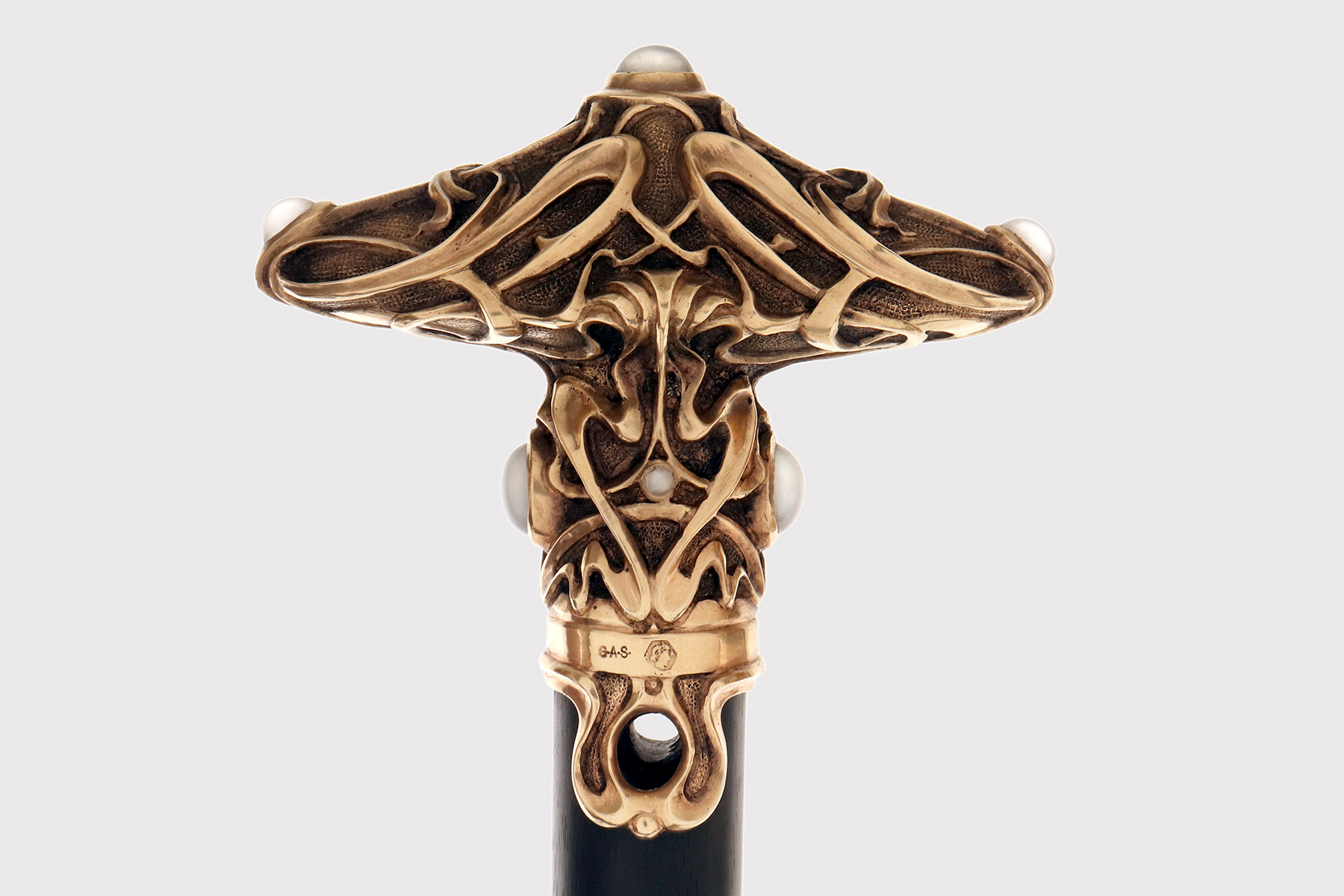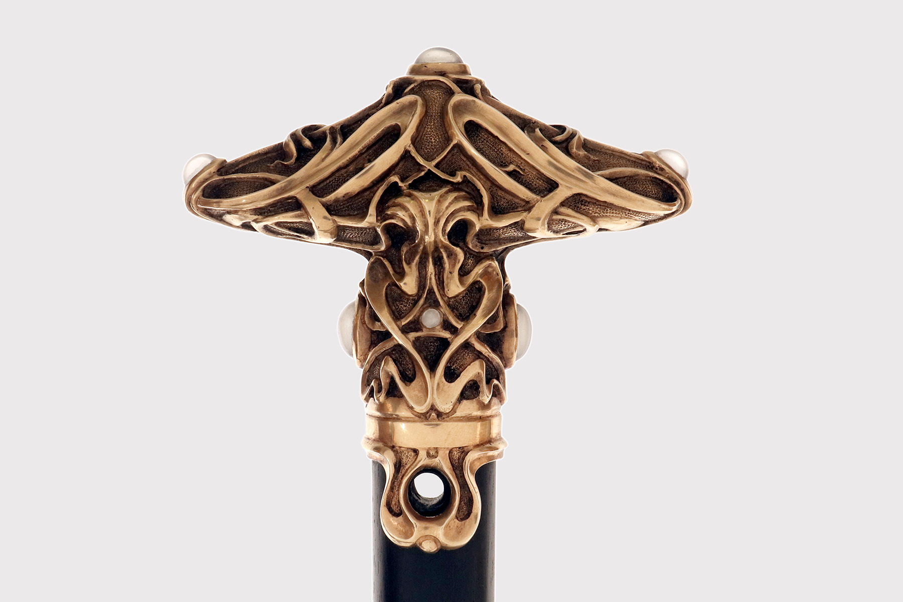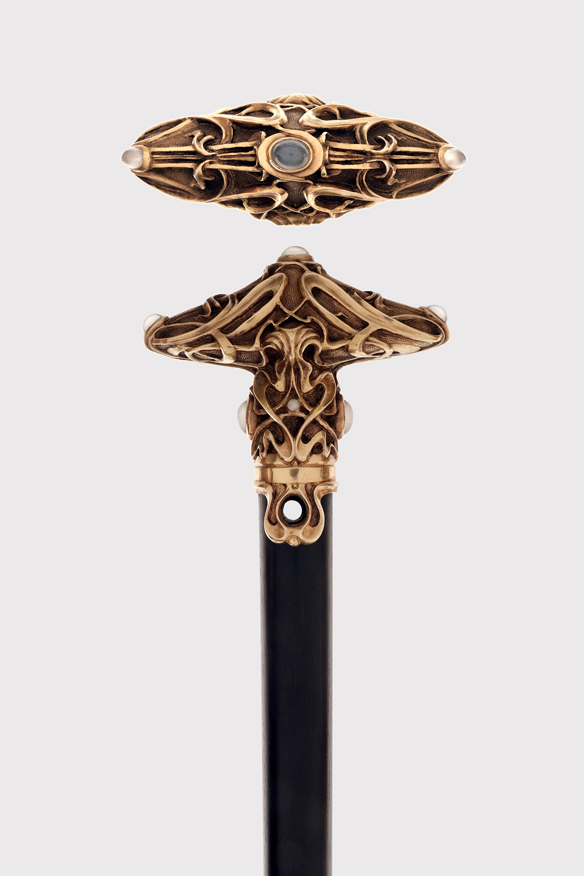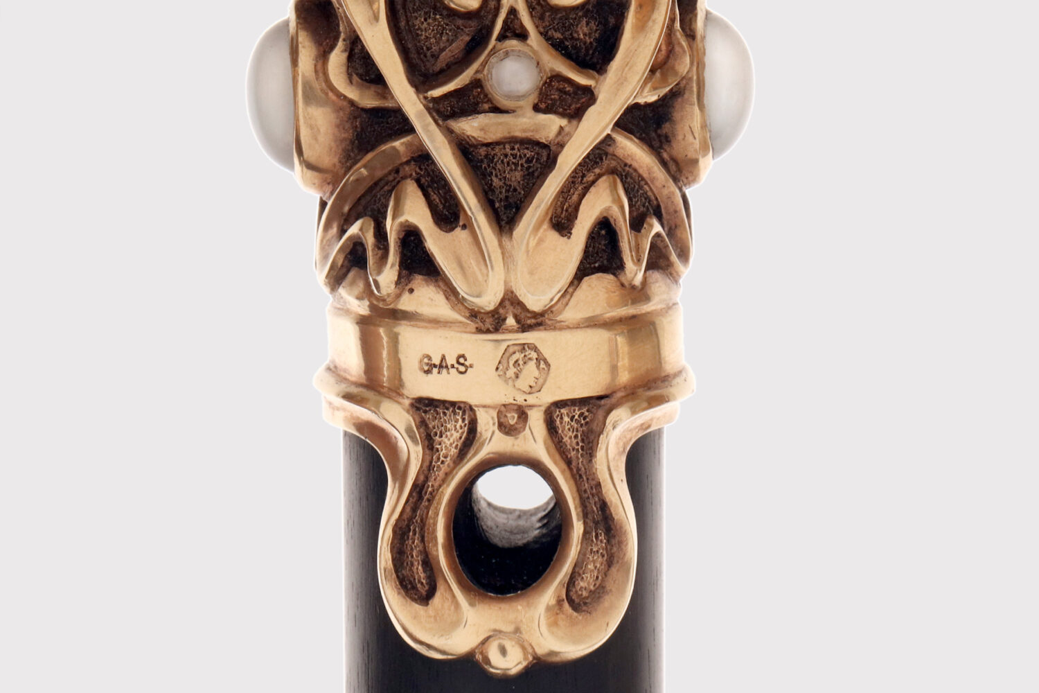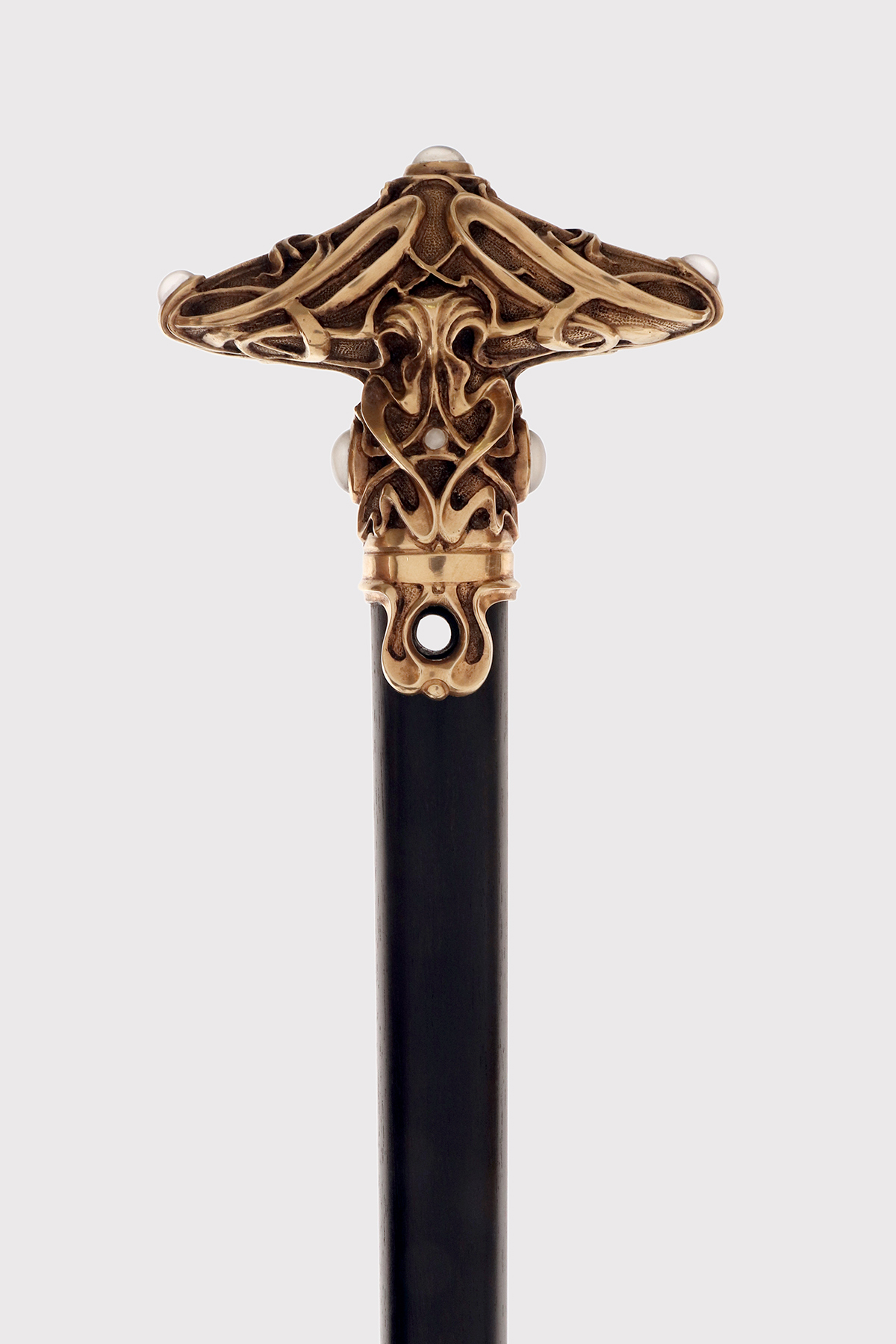Bastone da passeggio in stile Art Nouveau: pomolo a forma di T, progettato ed eseguito da Georg Anton Scheid, in argento con pietre di luna cabochon. Una spettacolare gabbia Jugendstil, proporzionata, composta da nastri ondulati a rilievo in argento lucido, in contrasto con il fondo scuro delicatamente martellato. Il pomolo simmetrico, ricco di movimento ritmico, è impreziosito, davanti e dietro, terminali e parte superiore, da cabochon di pietre di luna. Al termina del manico, integrato sotto la fascia, si trova un occhiello per il cordino da polso. Canna in legno di ebano con puntale in metallo. Firmato Georg Anton Scheid, Vienna, Austria circa 1905.