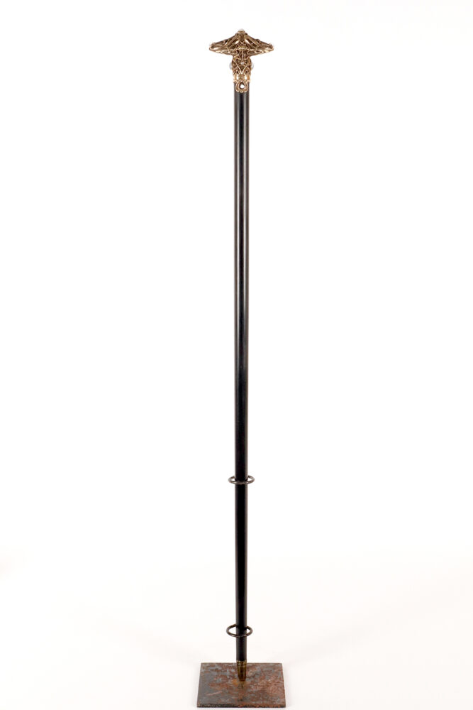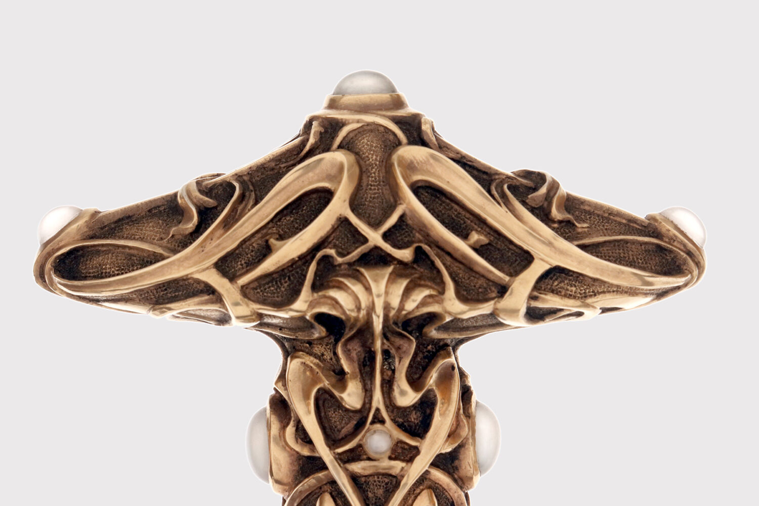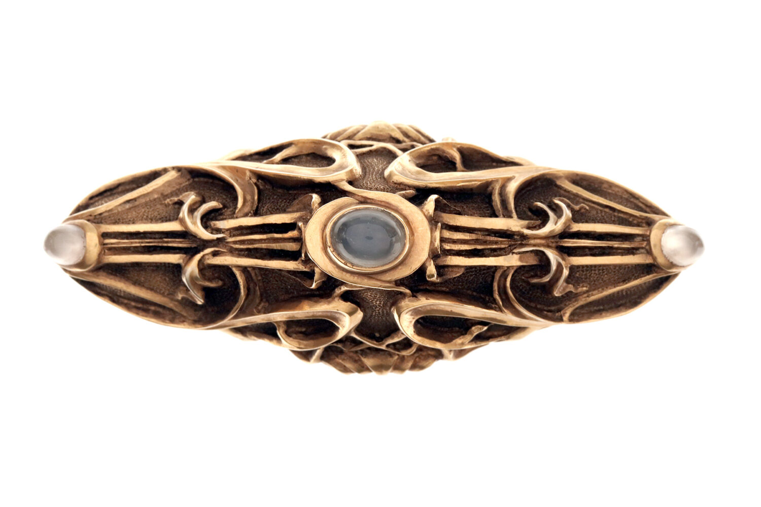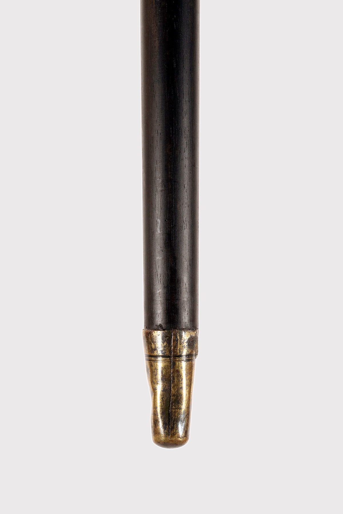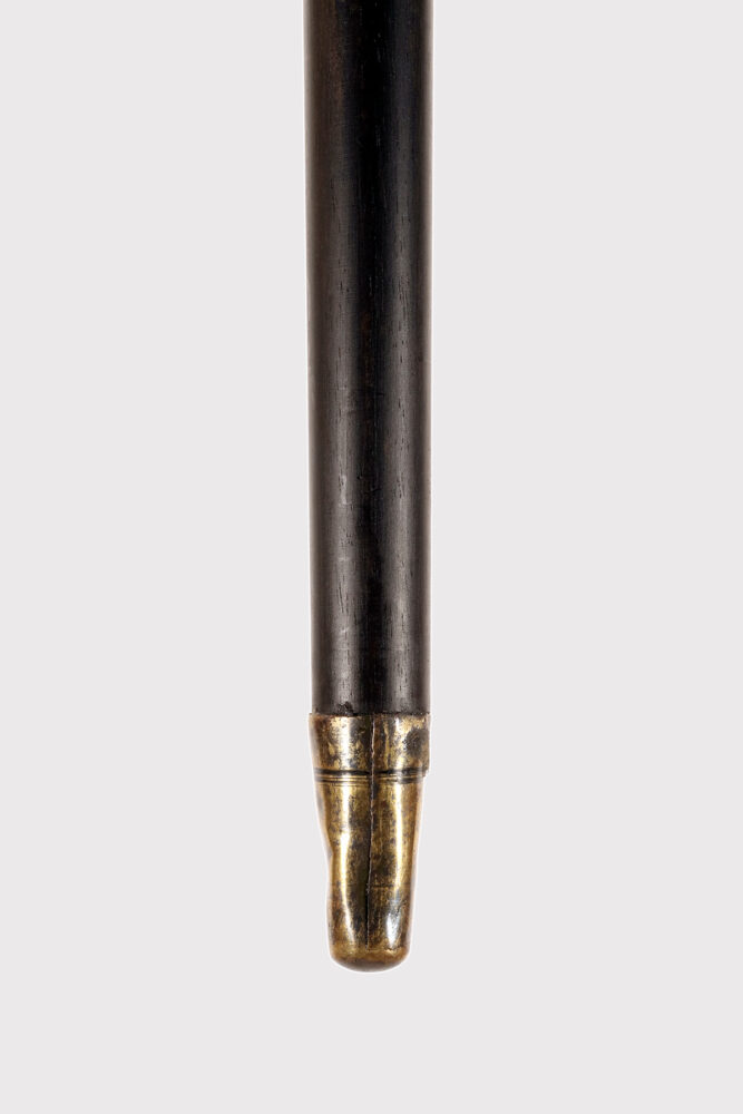 Bastone da passeggio in stile Art Nouveau: pomolo a forma di T, progettato ed eseguito da Georg Anton Scheid, in argento con pietre di luna cabochon. Una spettacolare gabbia Jugendstil, proporzionata, composta da nastri ondulati a rilievo in argento lucido, in contrasto con il fondo scuro delicatamente martellato. Il pomolo simmetrico, ricco di movimento ritmico, è impreziosito, davanti e dietro, terminali e parte superiore, da cabochon di pietre di luna. Al termina del manico, integrato sotto la fascia, si trova un occhiello per il cordino da polso. Canna in legno di ebano con puntale in metallo. Firmato Georg Anton Scheid, Vienna, Austria circa 1905.