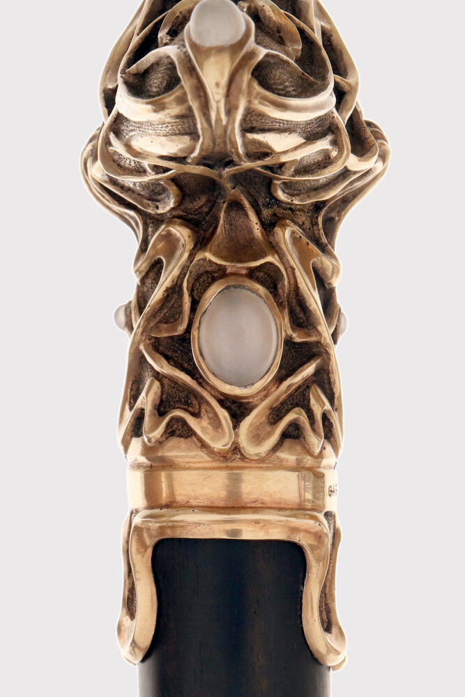 Bastone da passeggio Jugendstil, argento con impugnatura in pietre di luna, firmato Georg Anton Scheid, Vienna, Austria 1905.