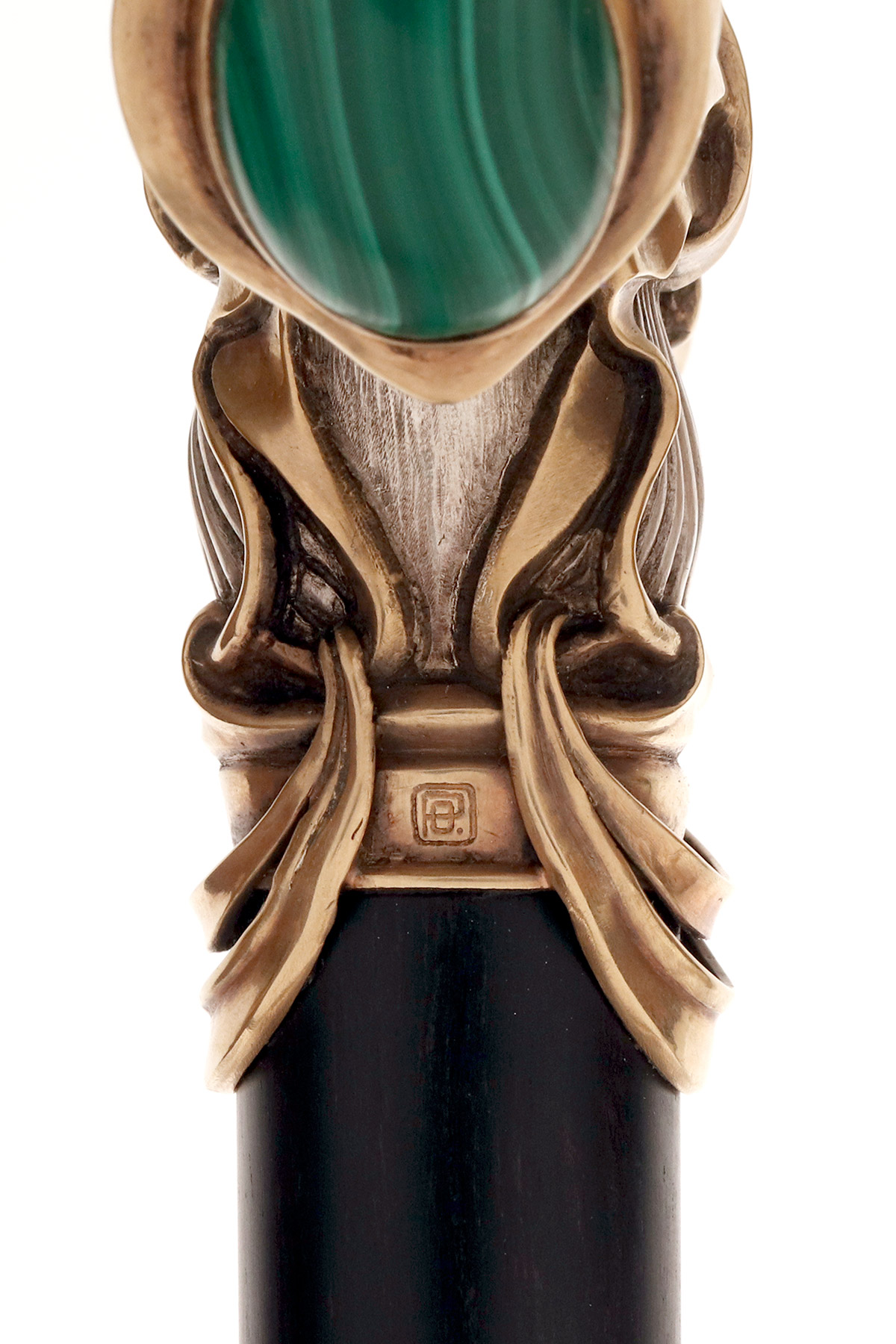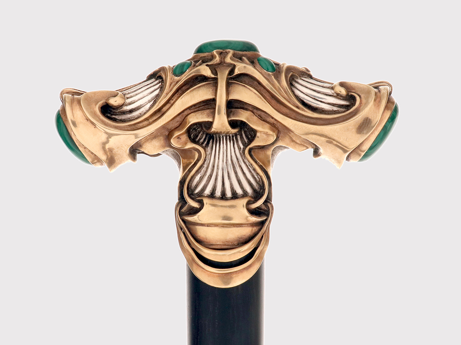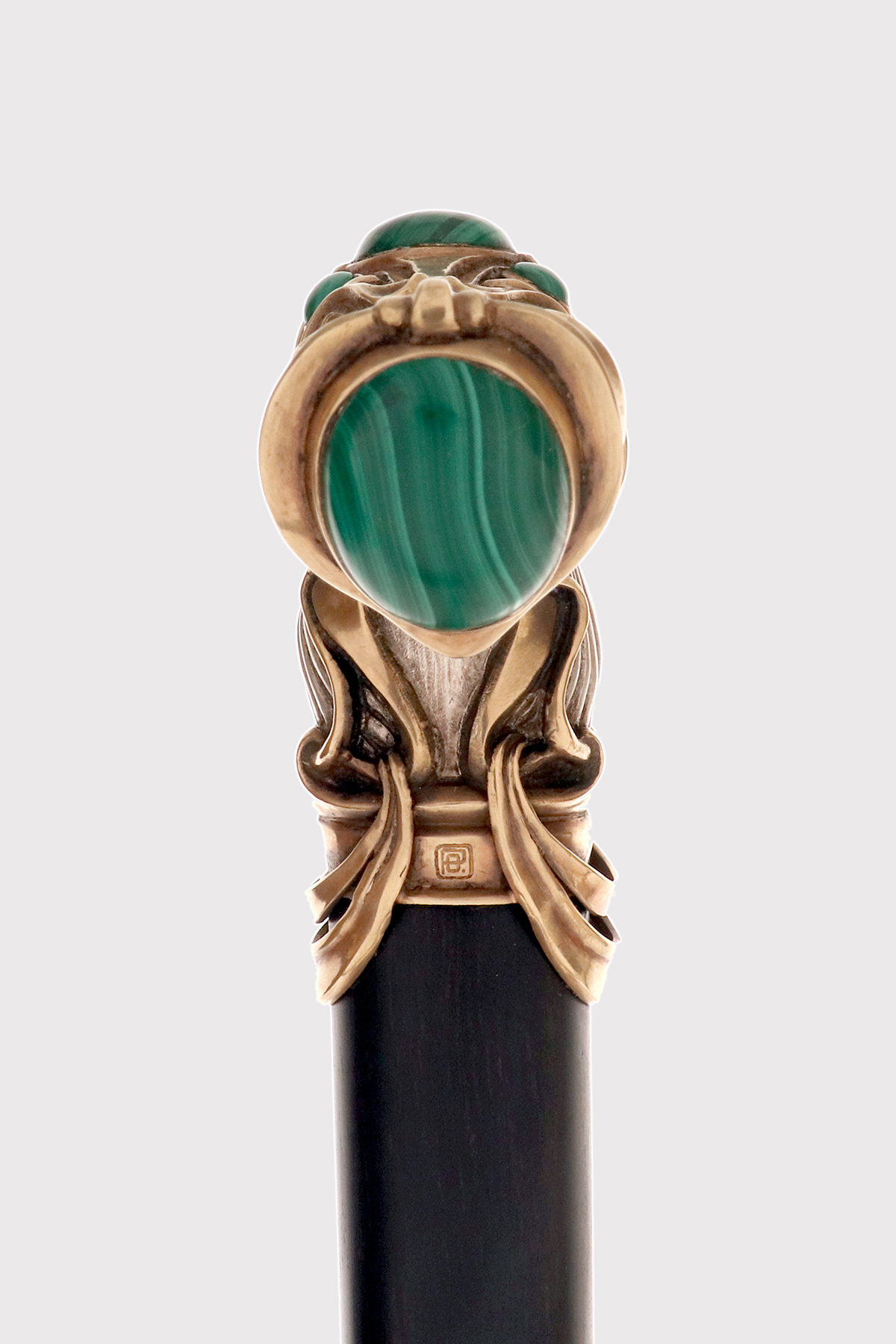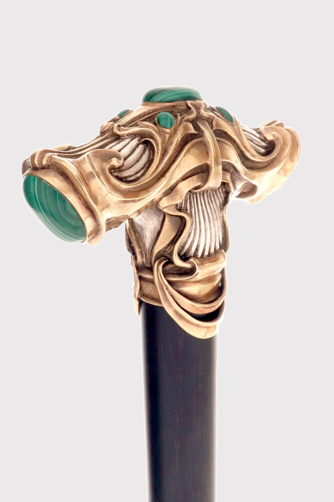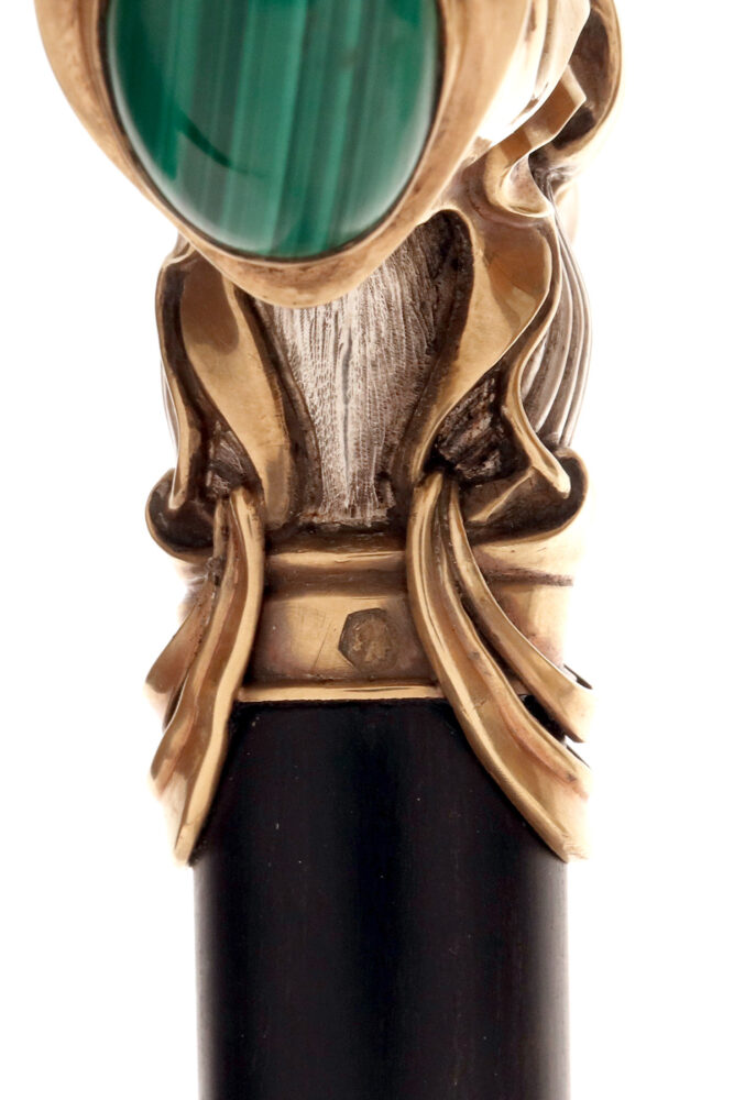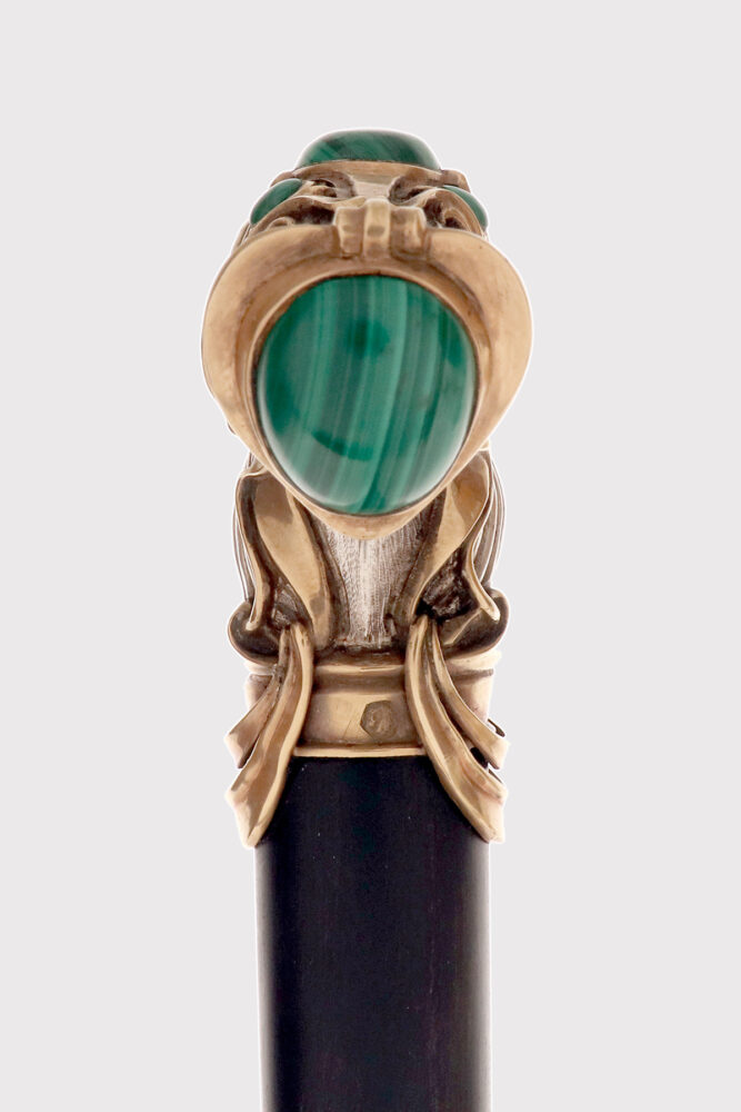 Bastone da passeggio Jugendstil, impugnatura in argento con pietre cabochon in malachite, firmato Otto Prutscher, Vienna, Austria 1920.