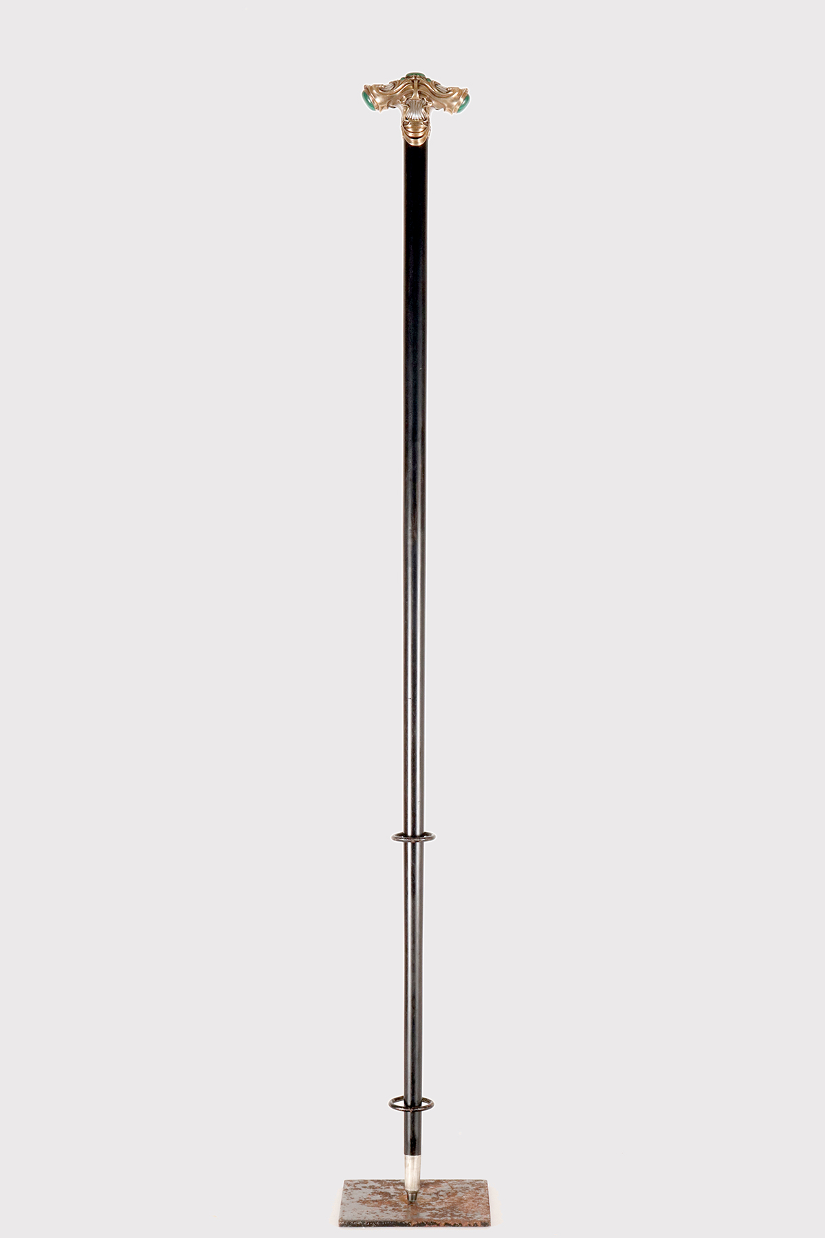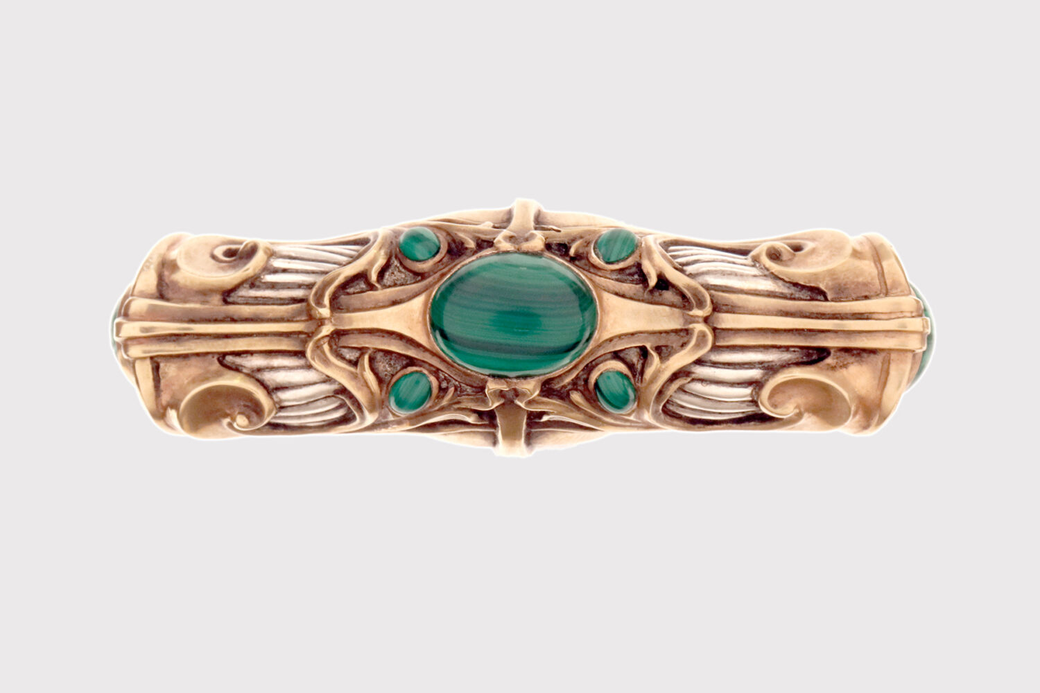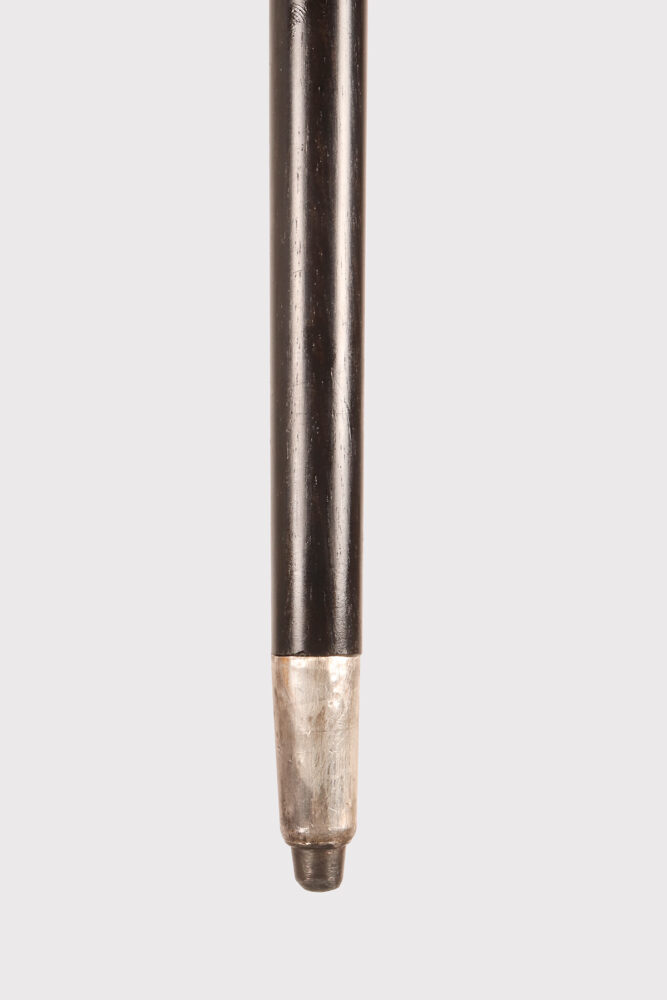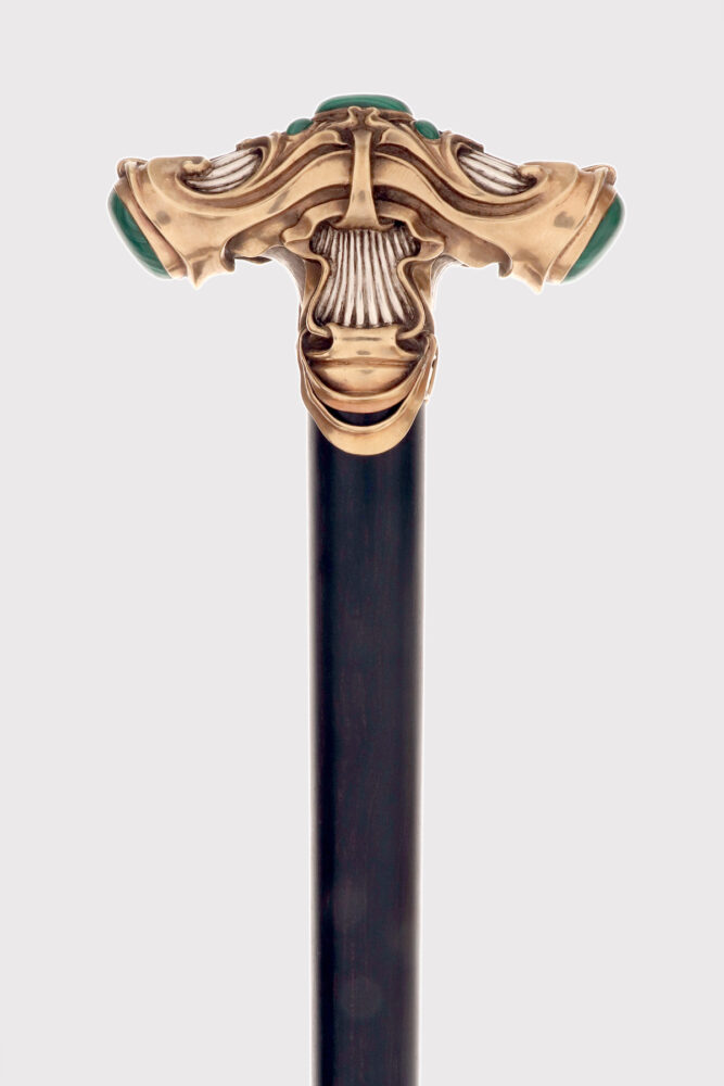 Bastone da passeggio in stile Art Nouveau: pomolo a forma di T, progettato ed eseguito da Otto Prutscher, in argento con pietre di malachite cabochon. Un pomolo molto bene eseguito che integra le linee aggraziate dell’Art Nouveau viennese, lo Jugendtstil, evidenziate in gran parte dall’oro rosa, con le linee più geometriche dell’Art Decò che stava per emergere, come si nota nel fondo in argento rigato. La parte superiore ovale in malachite è circondata da quattro pietre di malachite a forma di goccia, e ogni terminale ha un ovale in malachite cabochon di forma ovale, il tutto incastonato in argento dorato. Canna in legno di ebano con puntale in metallo. Firmato Otto Prutscher, Vienna, Austria circa 1920.
