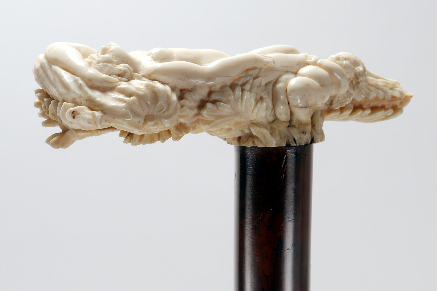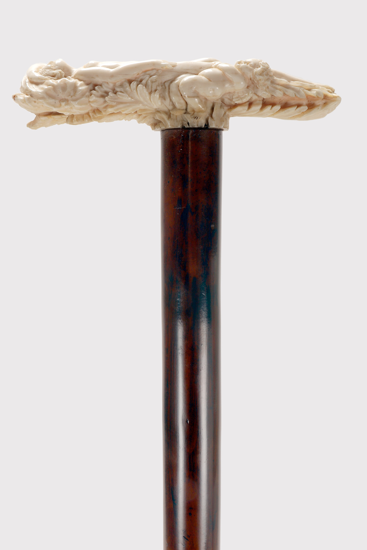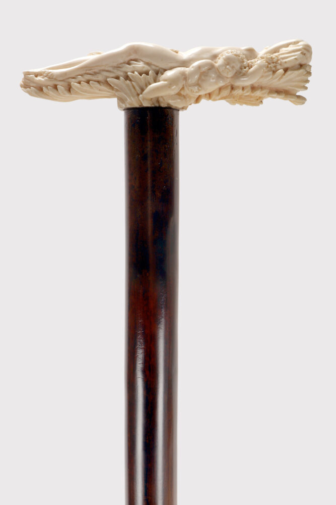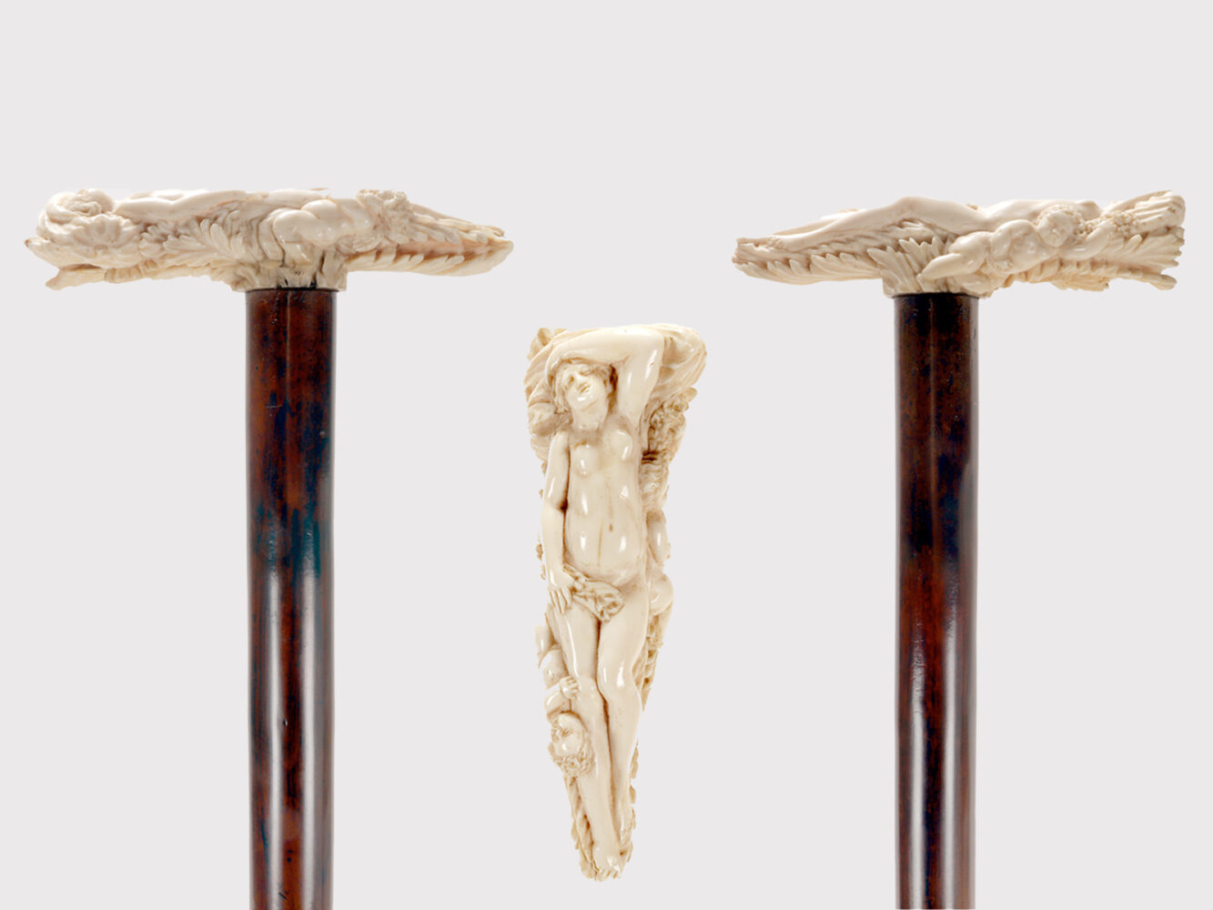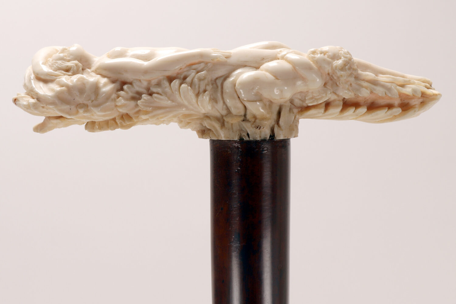 Bastone da passeggio: raro pomolo in avorio di grosse dimensioni finemente intagliato di Gerard van Opstal (circa 1600-1668)), uno dei più giovani scultori in avorio del XVII secolo, che eccelleva in intagli magistralmente realizzati con temi mitologici, allegorici e baccanali. Raffigura una donna nuda sdraiata, in posa profondamente sensuale e riflessiva, mentre i bambini hanno capelli spettinati ed espressioni petulanti, persino irascibili (in contrasto con i cherubini idealizzati e angelici creati dai suoi contemporanei). Canna in legno di malacca. Puntale in metallo. Van Opstal studiò a Bruxelles, poi lavorò ad Anversa, prima che il cardinale Richelieu lo invitasse a Parigi nel 1642, dove rimase per il resto della sua vita. Fu legato alla corte di Luigi XIV (1638-1715); il re era un grande ammiratore dei bassorilievi in avorio di van Opstal, di cui ne possedeva 17 nella sua collezione. Van Opstal lavorò anche la pietra e il marmo e realizzò numerose sculture architettoniche, tra cui commissioni per il Palais du Louvre e il Palais des Tuileries. Nel 1648 contribuí a fondare l’Académie Royale de Peinture et de Sculpture. Fiandre metà del XVII secolo. Cfr.: Catherine Dike e Guy Bezzaz, La Canne Objet d’Art, Les Éditions de l’Amateur, Parigi, 1988, p. 132-133. Roberta Maneker, Vertical Art The Enduring Beauty of Antique Canes and Walking Sticks, Hudson Hills Press LLC, Manchester, Vermont, 2008, p. 176, didascalia n. 135