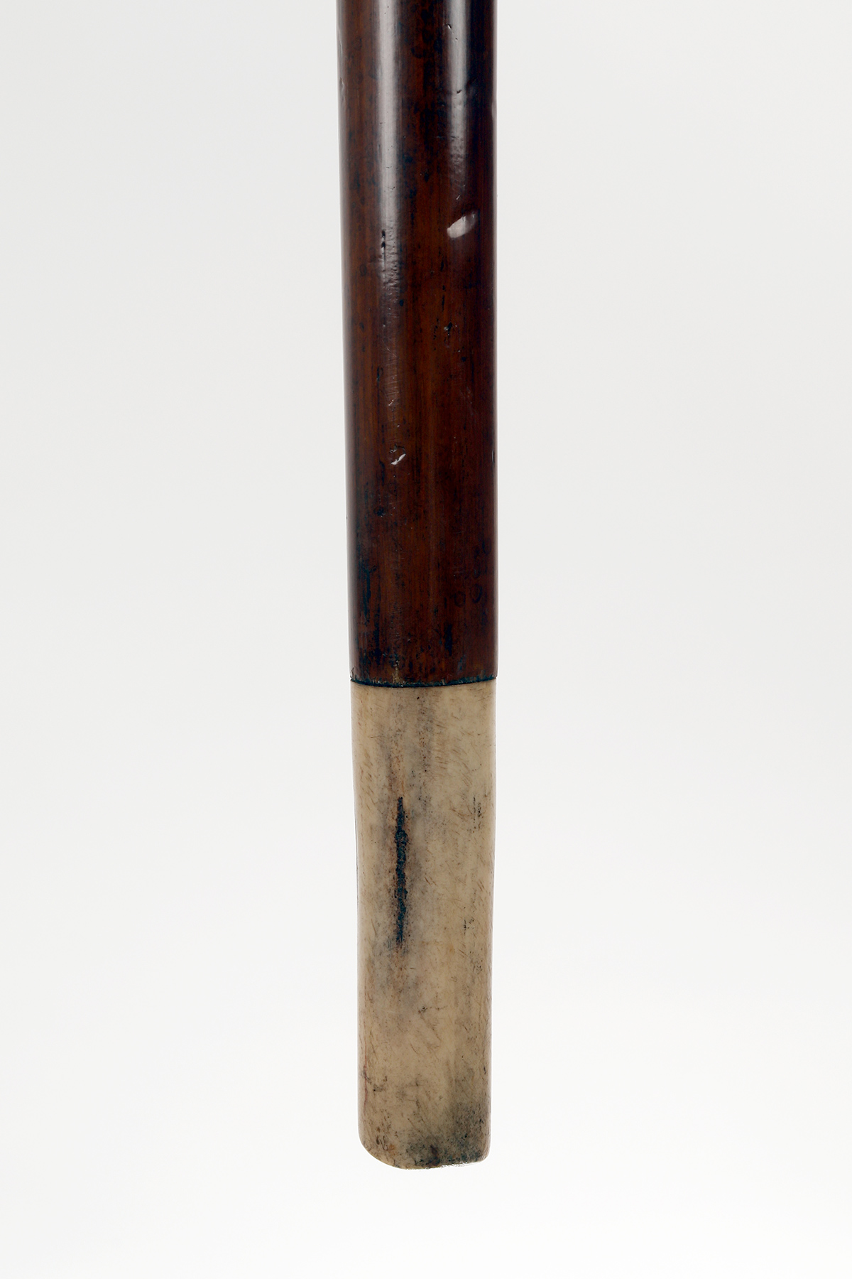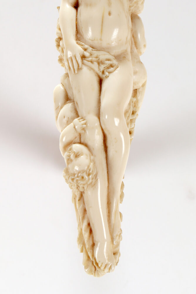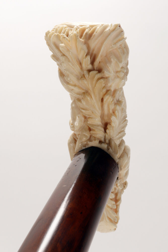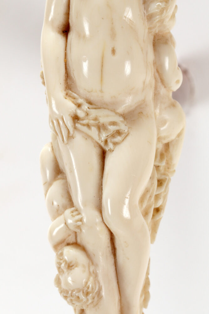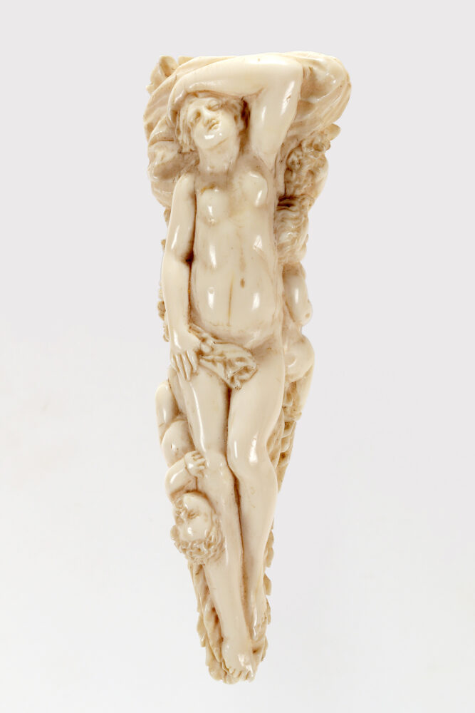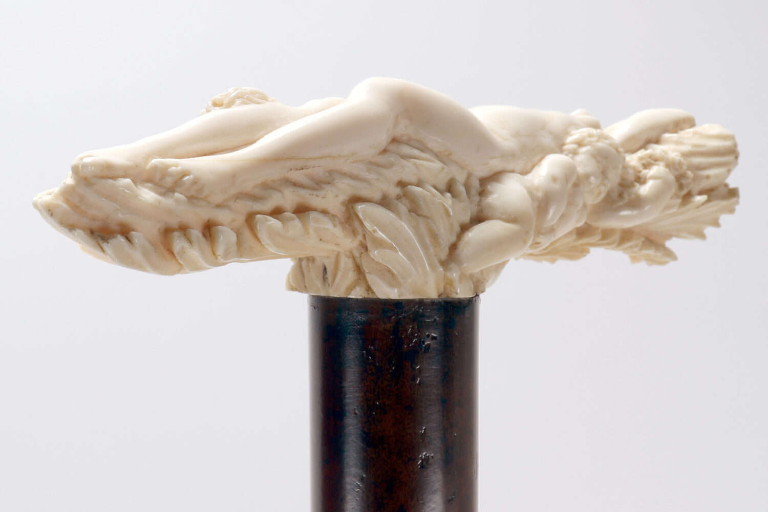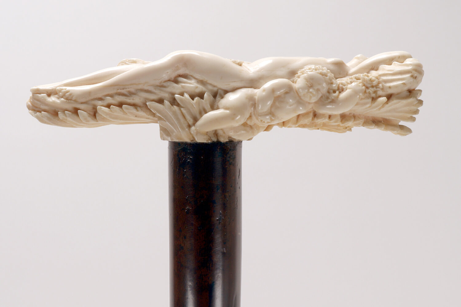 Bastone da passeggio: raro pomolo in avorio di grosse dimensioni finemente intagliato di Gerard van Opstal (circa 1600-1668)), uno dei più giovani scultori in avorio del XVII secolo, che eccelleva in intagli magistralmente realizzati con temi mitologici, allegorici e baccanali. Raffigura una donna nuda sdraiata, in posa profondamente sensuale e riflessiva, mentre i bambini hanno capelli spettinati ed espressioni petulanti, persino irascibili (in contrasto con i cherubini idealizzati e angelici creati dai suoi contemporanei). Canna in legno di malacca. Puntale in metallo. Van Opstal studiò a Bruxelles, poi lavorò ad Anversa, prima che il cardinale Richelieu lo invitasse a Parigi nel 1642, dove rimase per il resto della sua vita. Fu legato alla corte di Luigi XIV (1638-1715); il re era un grande ammiratore dei bassorilievi in avorio di van Opstal, di cui ne possedeva 17 nella sua collezione. Van Opstal lavorò anche la pietra e il marmo e realizzò numerose sculture architettoniche, tra cui commissioni per il Palais du Louvre e il Palais des Tuileries. Nel 1648 contribuí a fondare l’Académie Royale de Peinture et de Sculpture. Fiandre metà del XVII secolo. Cfr.: Catherine Dike e Guy Bezzaz, La Canne Objet d’Art, Les Éditions de l’Amateur, Parigi, 1988, p. 132-133. Roberta Maneker, Vertical Art The Enduring Beauty of Antique Canes and Walking Sticks, Hudson Hills Press LLC, Manchester, Vermont, 2008, p. 176, didascalia n. 135