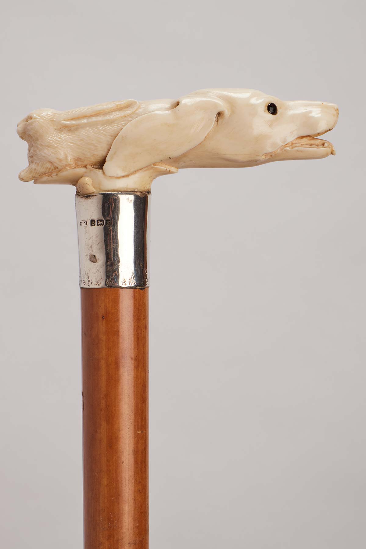 Ivory carved handle T shape, depicting an hunting dog head and a hare. Silver ring. Sulphur glass eyes. Malacca wood shaft. Metal ferule. UK 1890