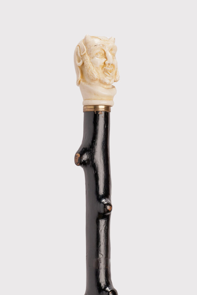 Walking stick: ivory carved handle. The handle depicts a caricatural face of Mephistopheles. Ebonized fruitwood shaft rustic shape. Silver ring. Metal ferrule. England circa 1870. (SHIP TO EU ONLY)