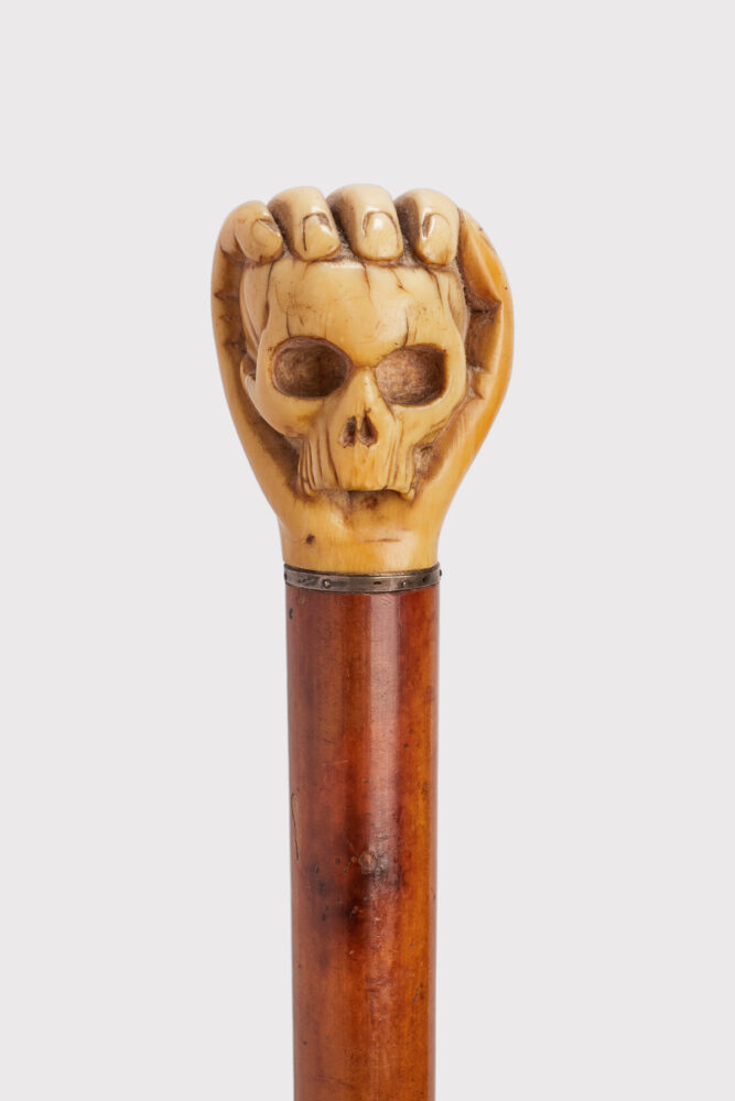 Walking stick: ivory carved handle, depicting a Memento Mori, a hand holding a skull. Malacca wood shaft. Silver ring. Horne ferrule. Germany 1860 ca.