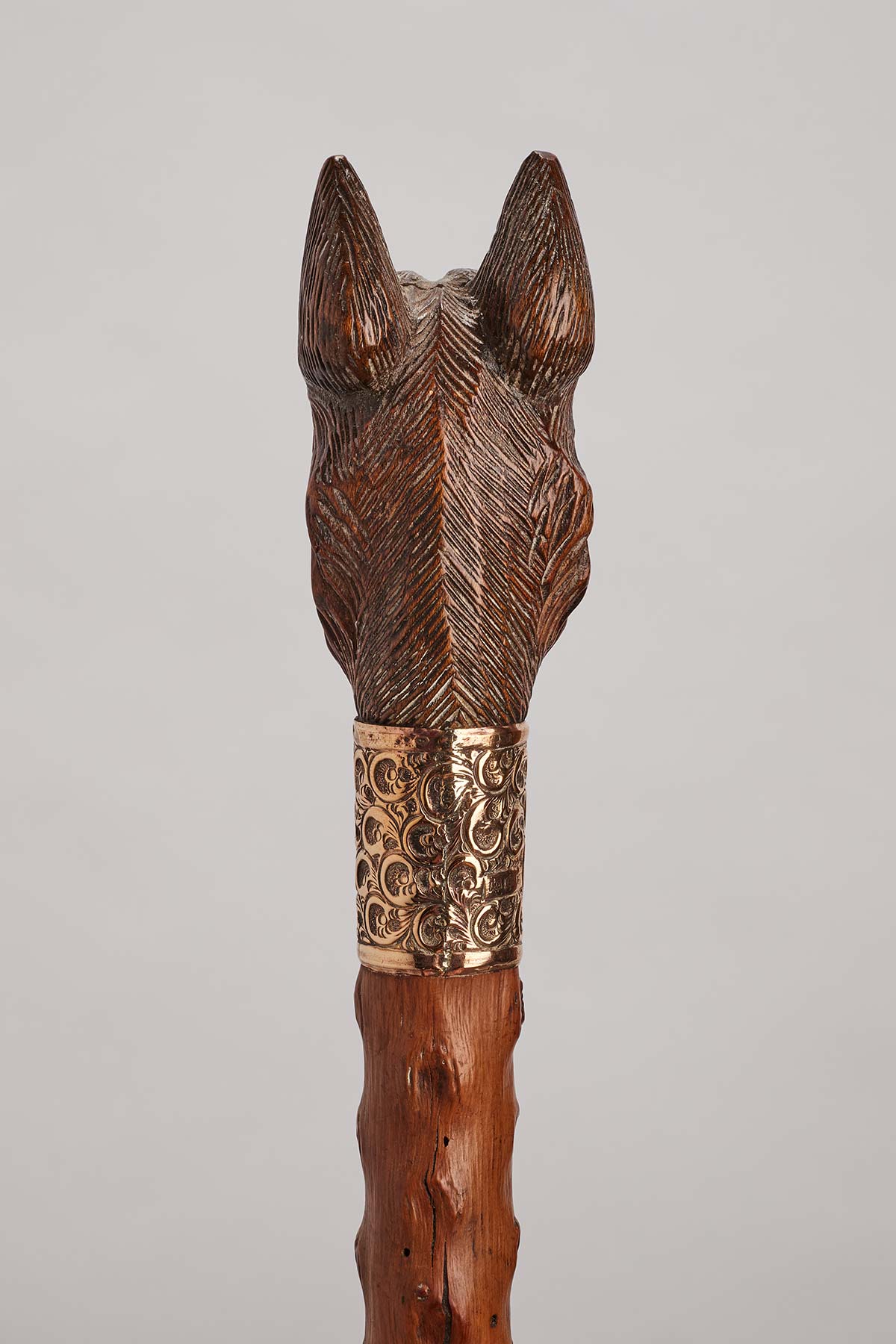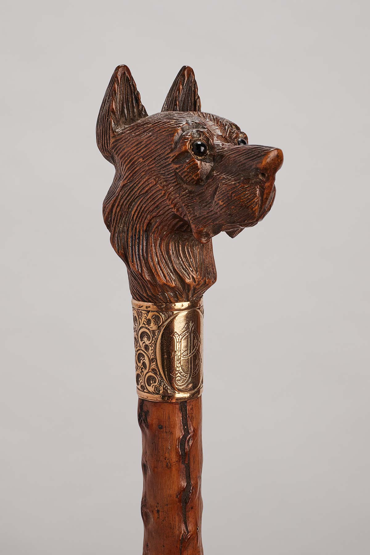 Bastone d’arte popolare: pomolo in legno finemente intagliato raffigurante una testa di cane Pastore Tedesco, occhi in vetro sulfureo. Fascia in argento dorata. Canna in legno di biancospino con puntale in metallo. Austria circa 1890.