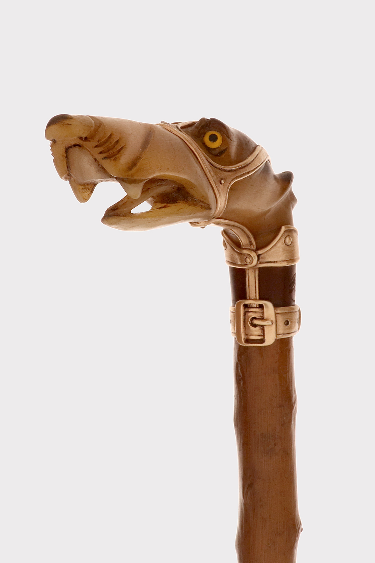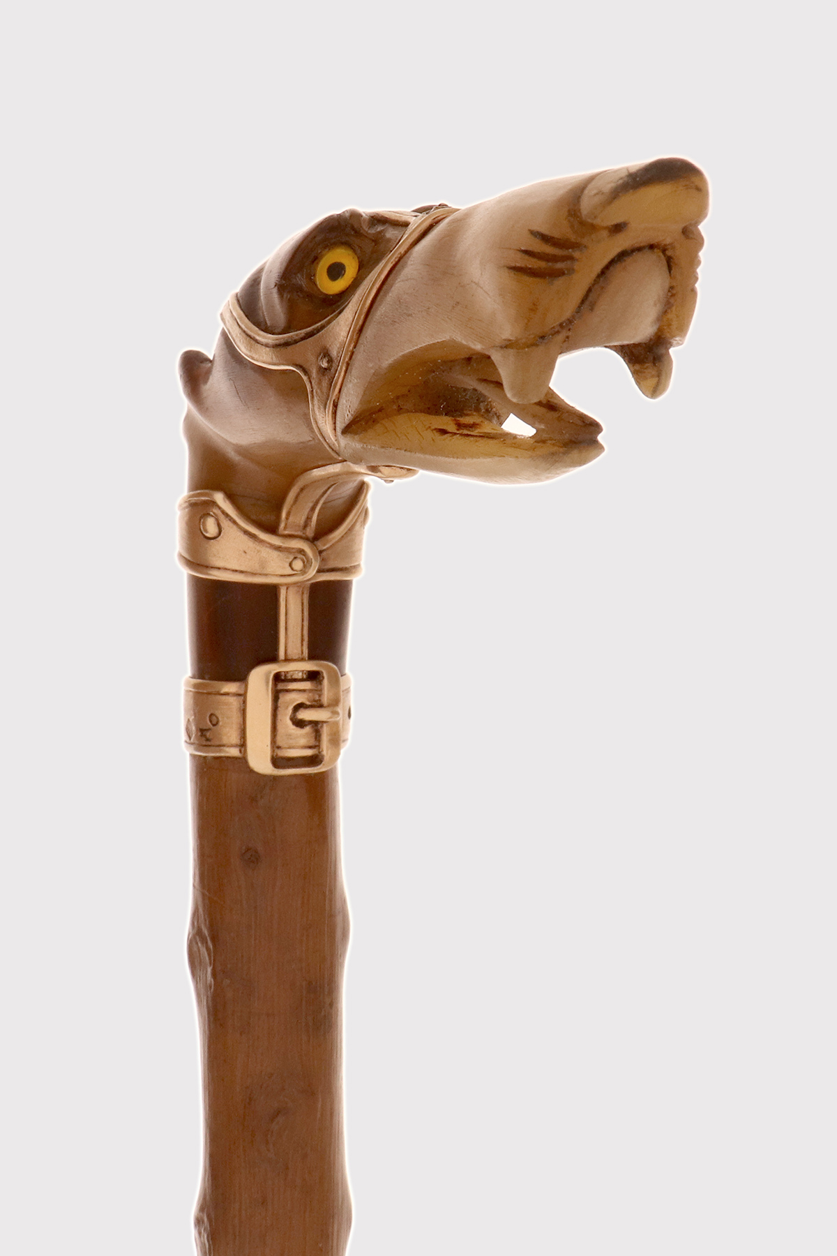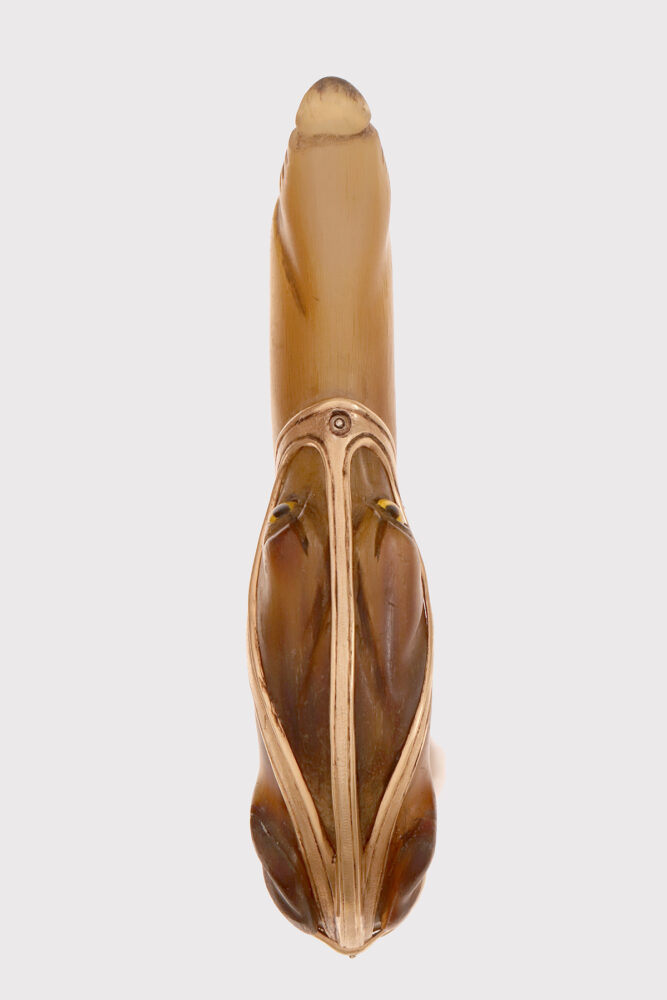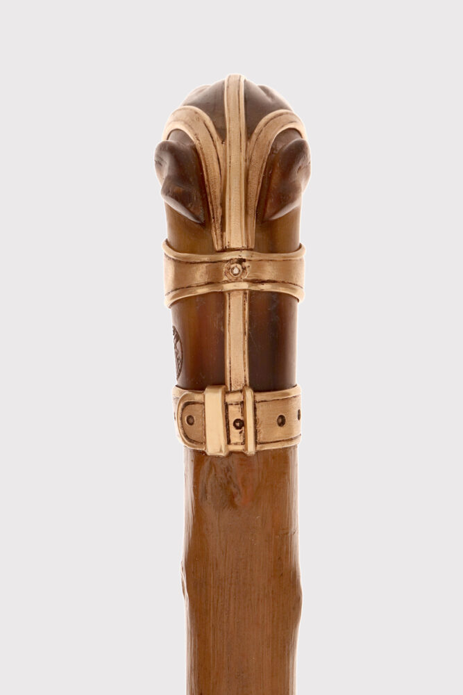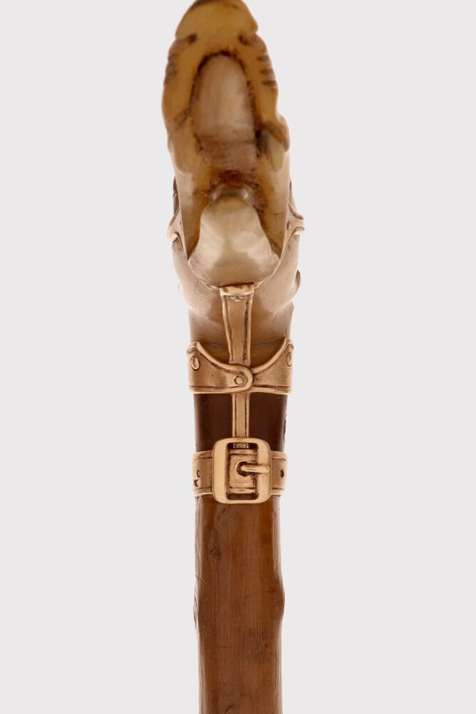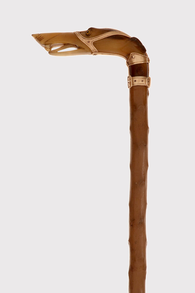 Bastone d’arte popolare: Il pomolo è realizzato in corno di cervo scolpito raffigurante la testa di un cane levriere con occhi in vetro sulfureo, la lingua estesa tra gli incisivi. Il collare in argento dorato e la cinghia della museruola sotto le orecchie sono cesellate con borchie per simulare una museruola-collare in pelle. Canna in legno di biancospino. Puntale in metallo. Disegnato da Manuel Orazi e realizzato da Émile Saint-Yves per la Maison Moderne, Parigi Francia circa 1900.