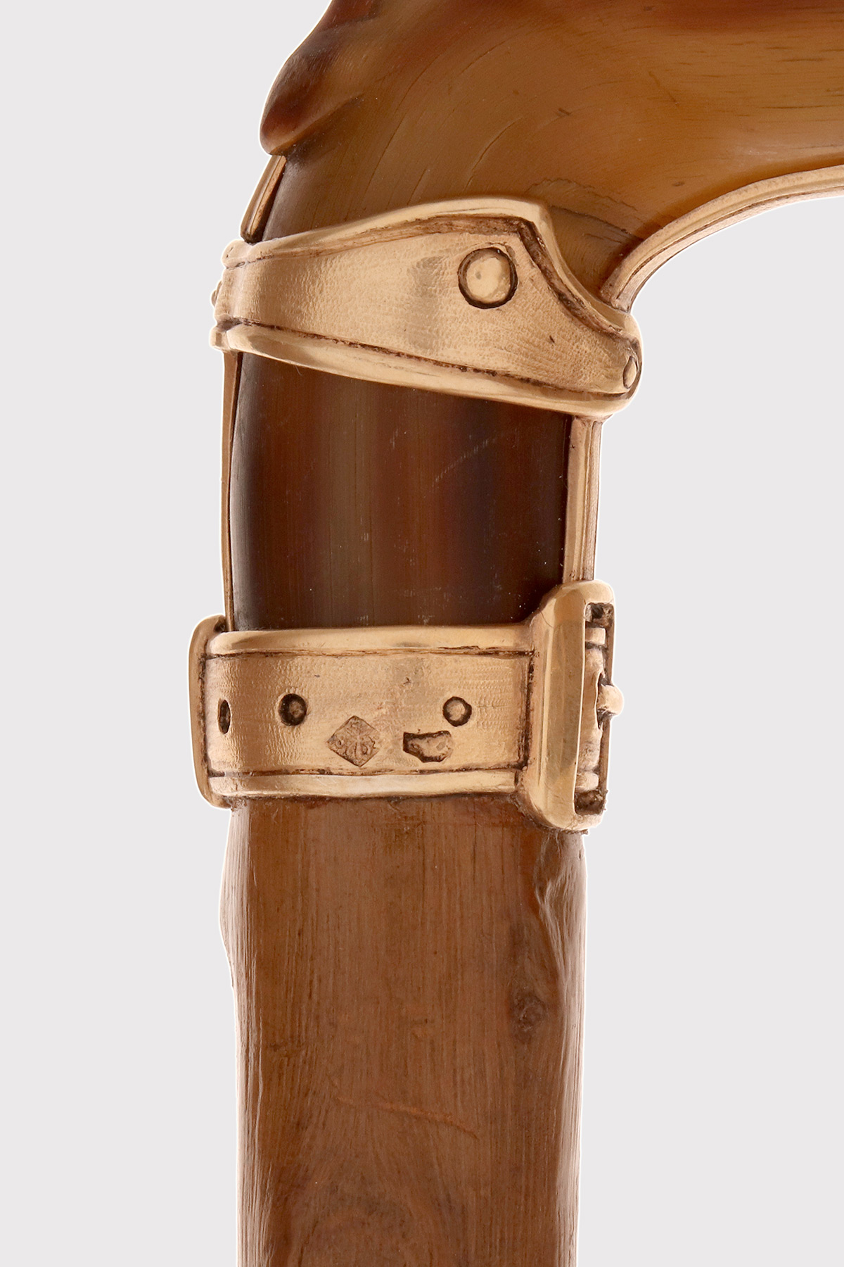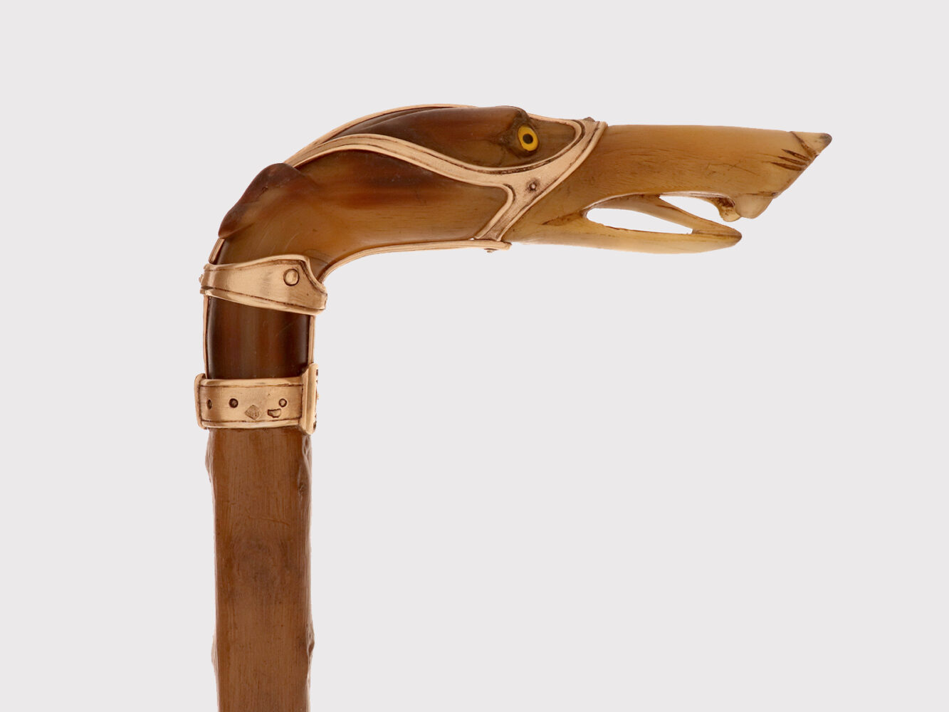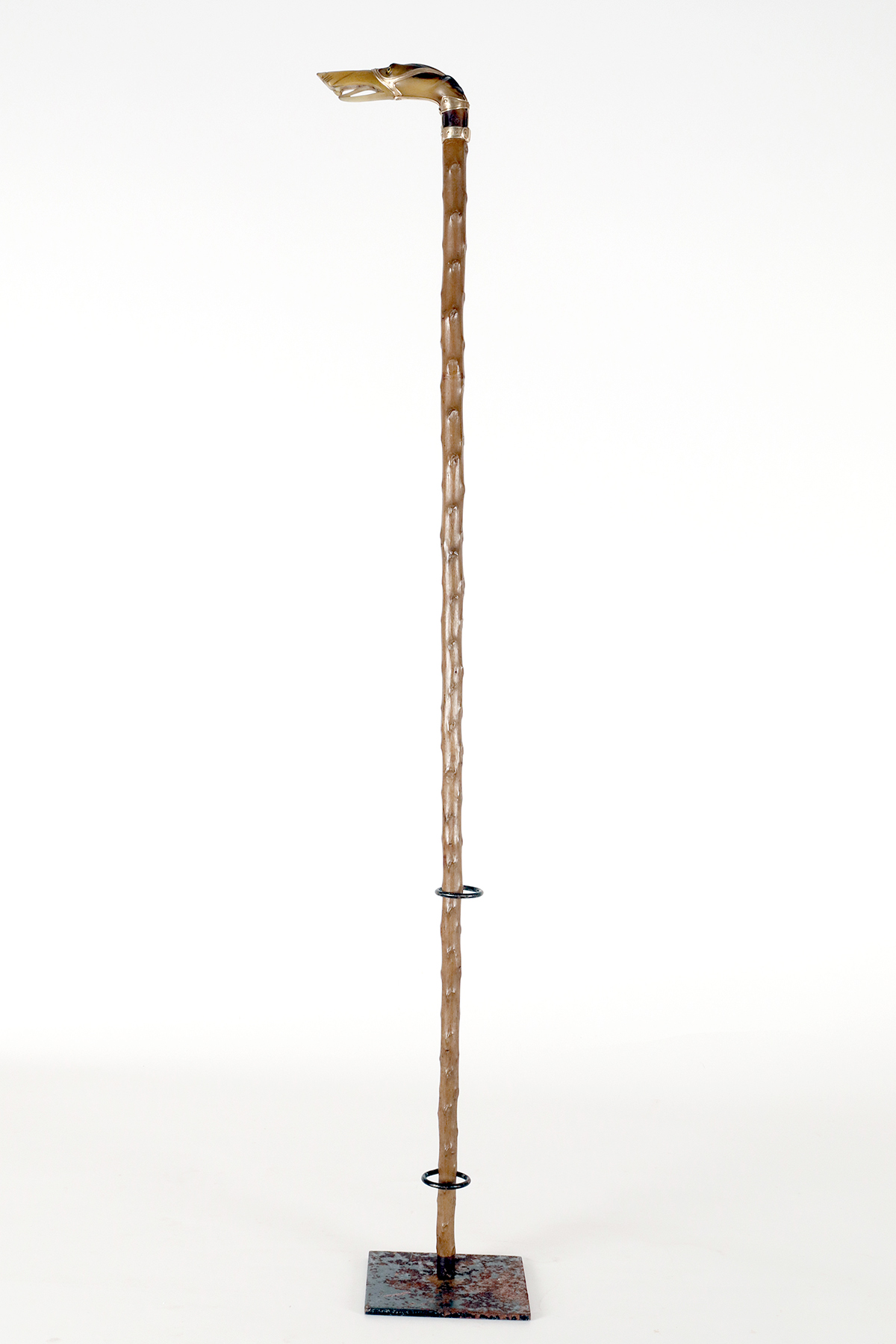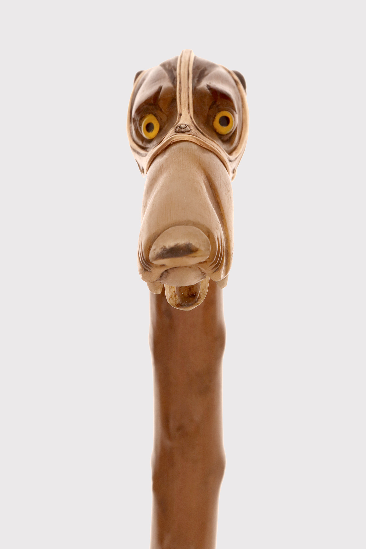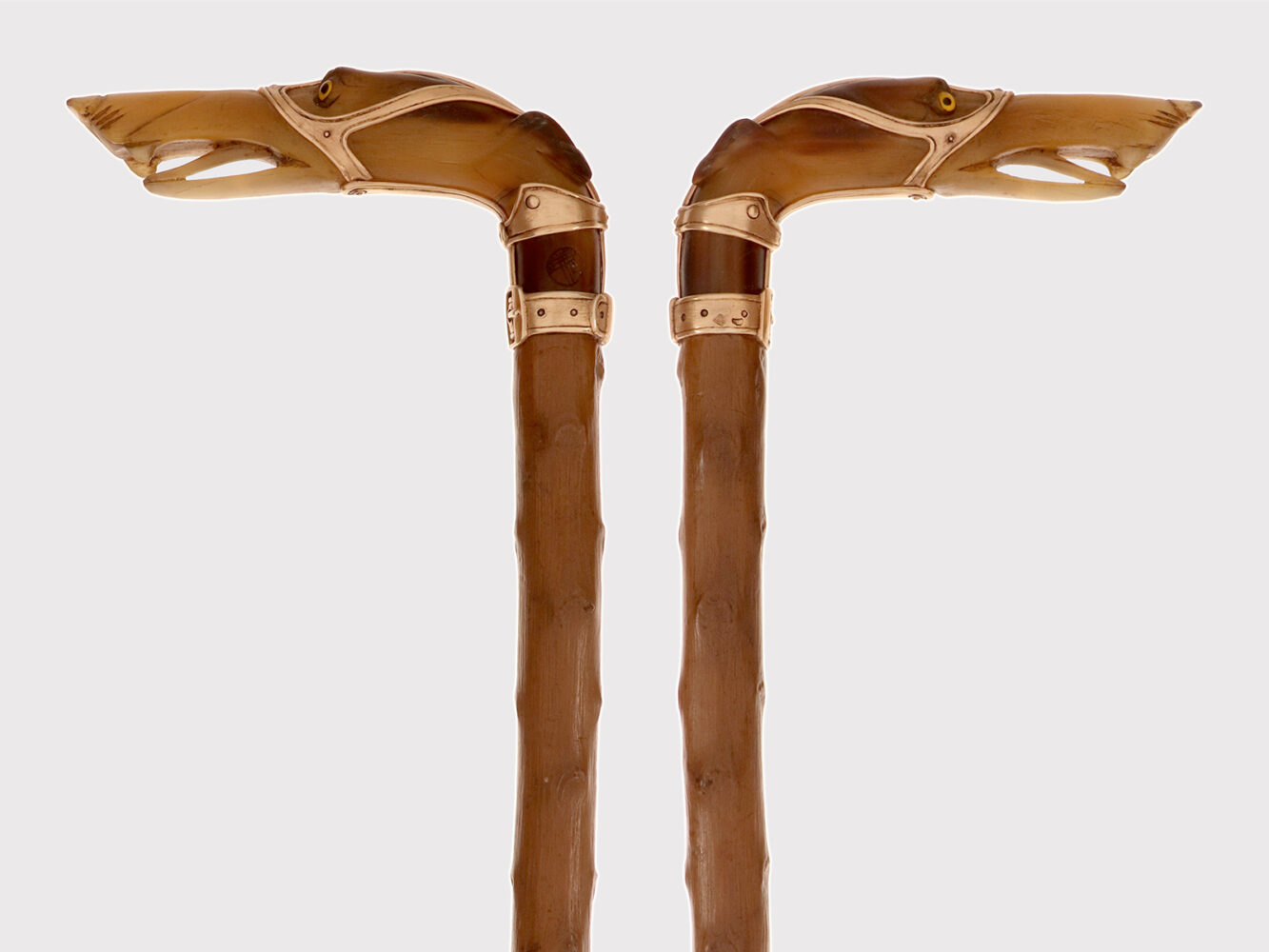 Bastone d’arte popolare: Il pomolo è realizzato in corno di cervo scolpito raffigurante la testa di un cane levriere con occhi in vetro sulfureo, la lingua estesa tra gli incisivi. Il collare in argento dorato e la cinghia della museruola sotto le orecchie sono cesellate con borchie per simulare una museruola-collare in pelle. Canna in legno di biancospino. Puntale in metallo. Disegnato da Manuel Orazi e realizzato da Émile Saint-Yves per la Maison Moderne, Parigi Francia circa 1900.