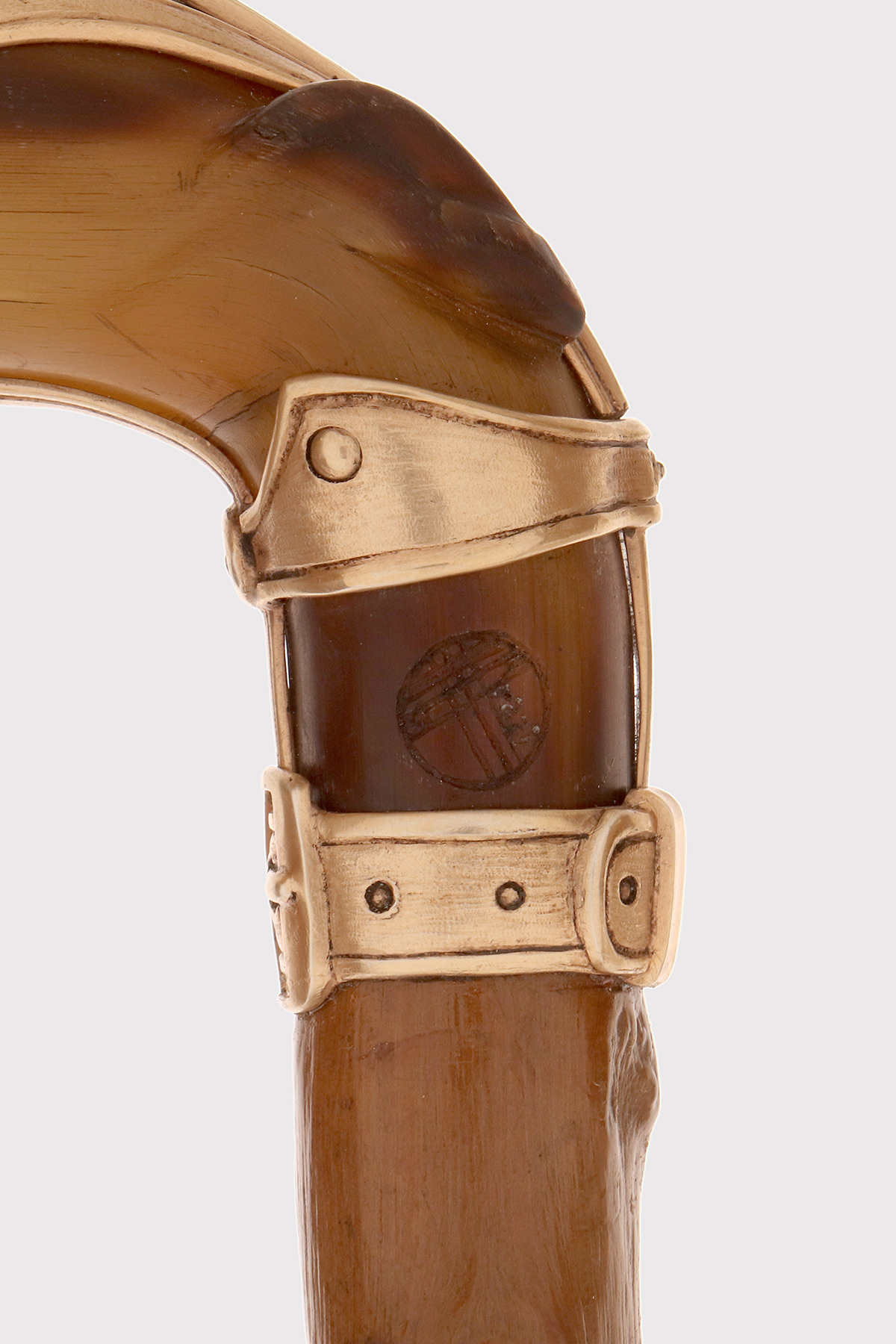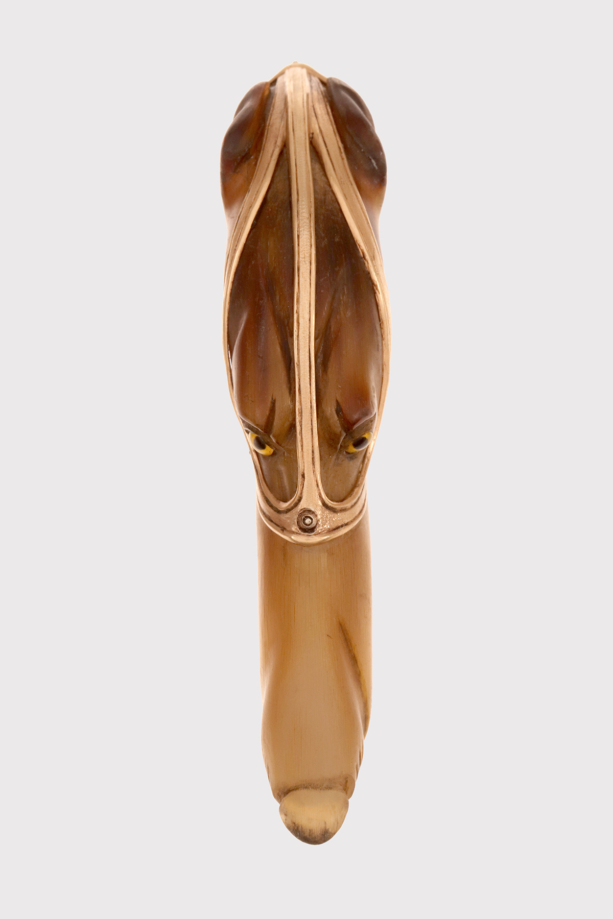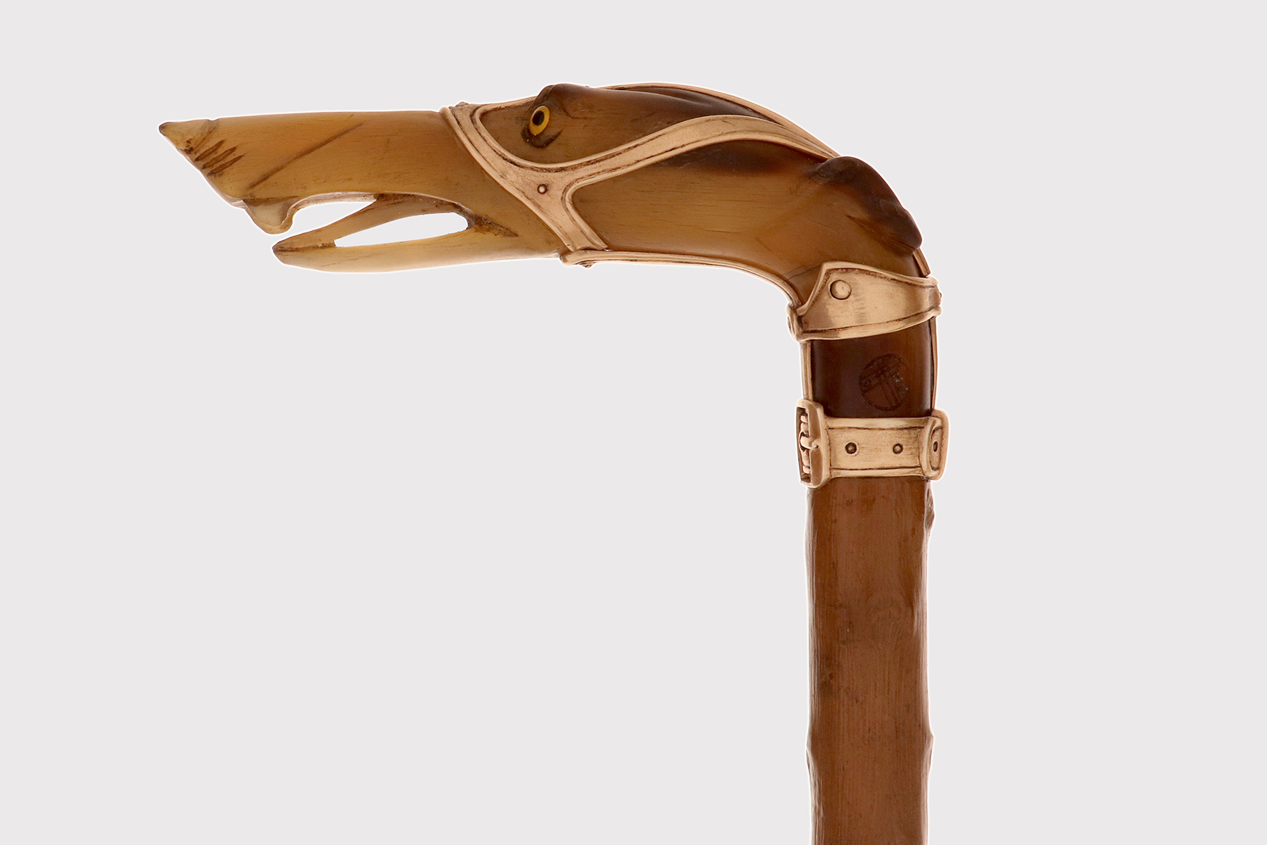 Bastone firmato Manuel Orazi ed Èmile Saint-Yves, in corno di cervo raffigurante la testa di un levriero con museruola, Parigi, Francia 1900.