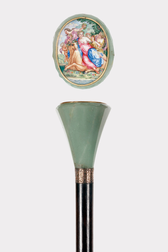 Bastone da passeggio, pomolo realizzato in pietra dura, quarzo verde, con inserita una miniatura ovale dipinta a smalto su rame, raffigurante il ratto di Europa e il toro. Cornice della miniatura e fascia in oro 18K. Canna in legno di palissandro. Puntale in metallo. Francia circa 1870.