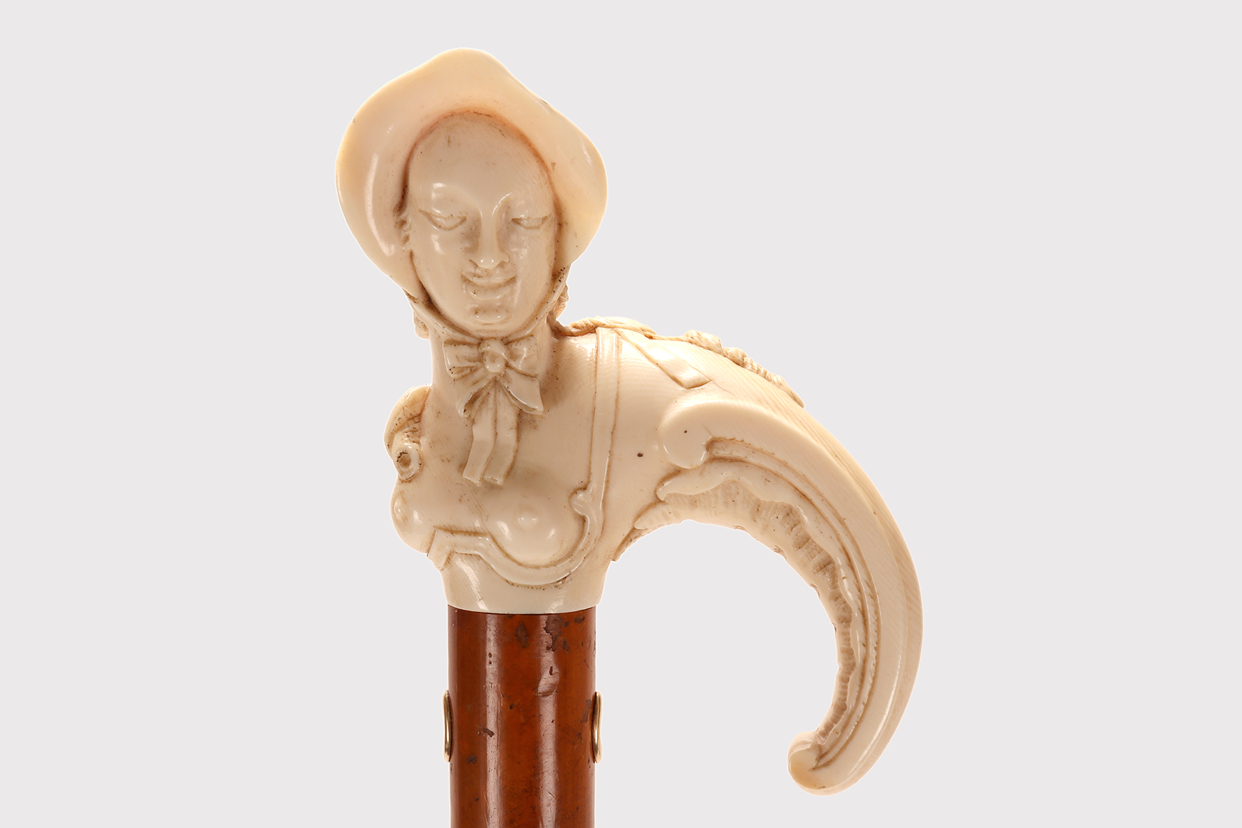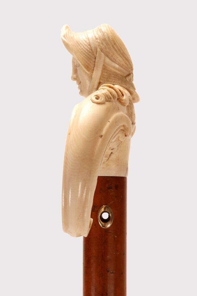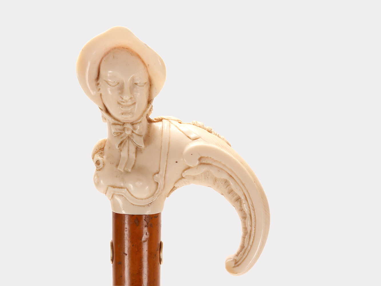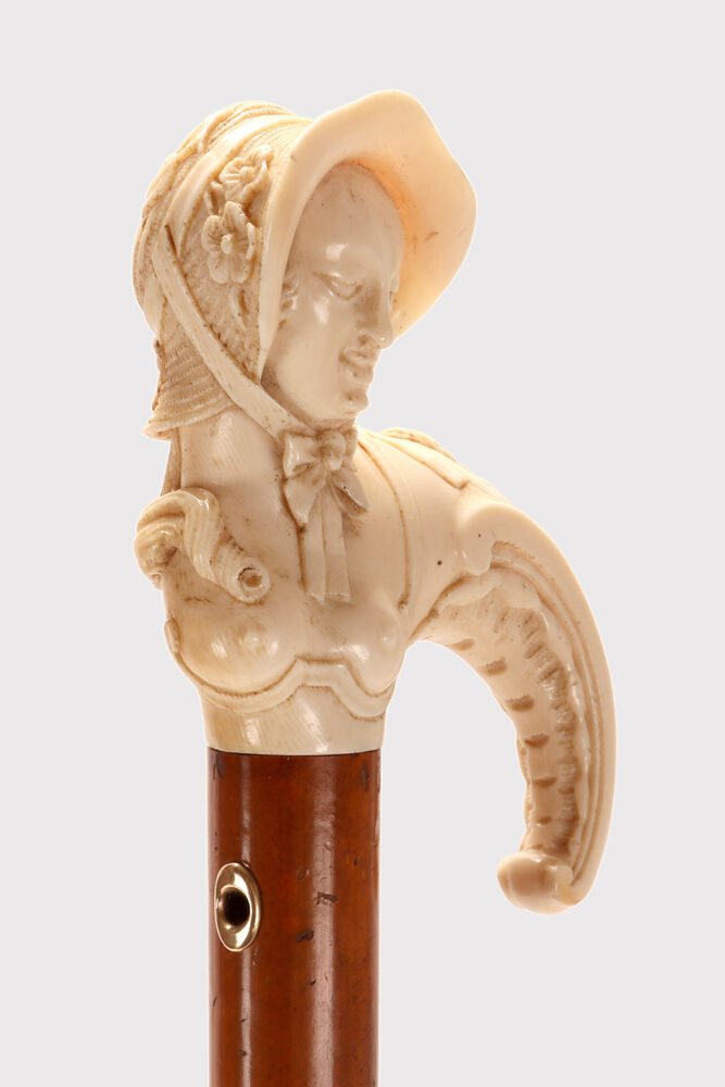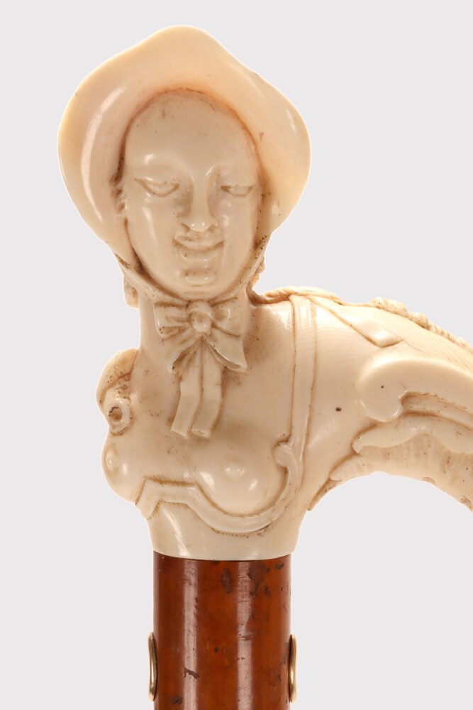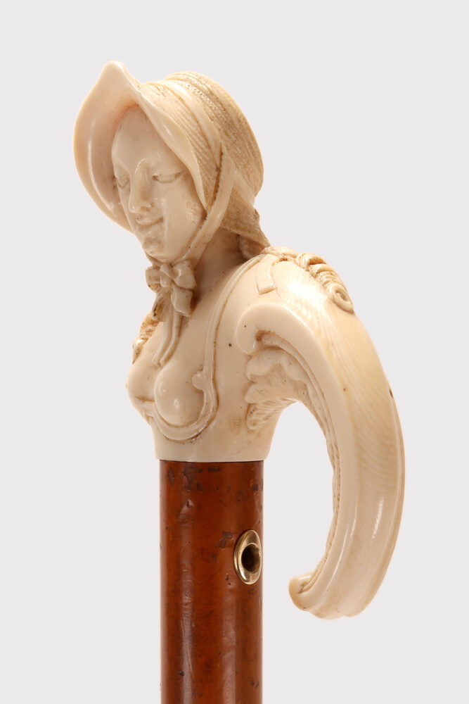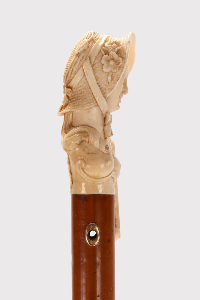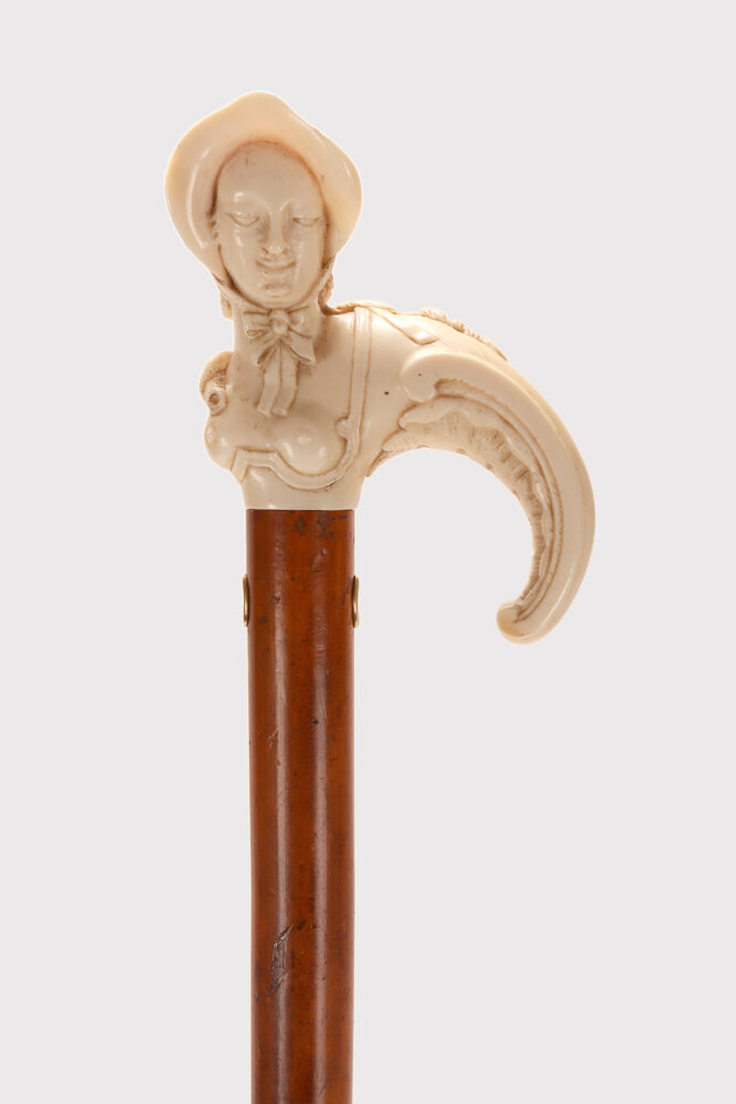 Bastone da passeggio: pomolo in avorio di grosse dimensioni finemente intagliato a forma di bequille. Raffigurante un busto femminile, una donna a seno nudo che indossa un cappellino di paglia finemente dettagliato. Questa tipica forma di pomolo, a volute che termina con una voluta, viene chiamato Bequille, è strettamente associata ai manici in porcellana realizzati dalle principali manifatture europee, in particolare la manifattura di porcellana di Meissen, che iniziò a produrre la prima porcellana a pasta dura d’Europa nel 1710. Canna in legno di malacca con occhielli in argento dorato, per il laccio da polso. Puntale in metallo. Germania metà del XVIII secolo. Cfr.: Catherine Dike e Guy Bezzaz, La Canne Objet d’Art, Les Éditions de l’Amateur, Parigi, 1988, p. 146-147. Museum für Kunst und Gewerbe, Hamburg. Roberta Maneker, Vertical Art The Enduring Beauty of Antique Canes and Walking Sticks, Hudson Hills Press LLC, Manchester, Vermont, 2008, p. 228, didascalia n. 303.