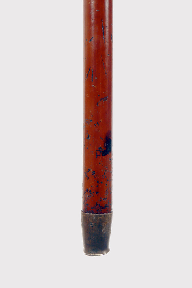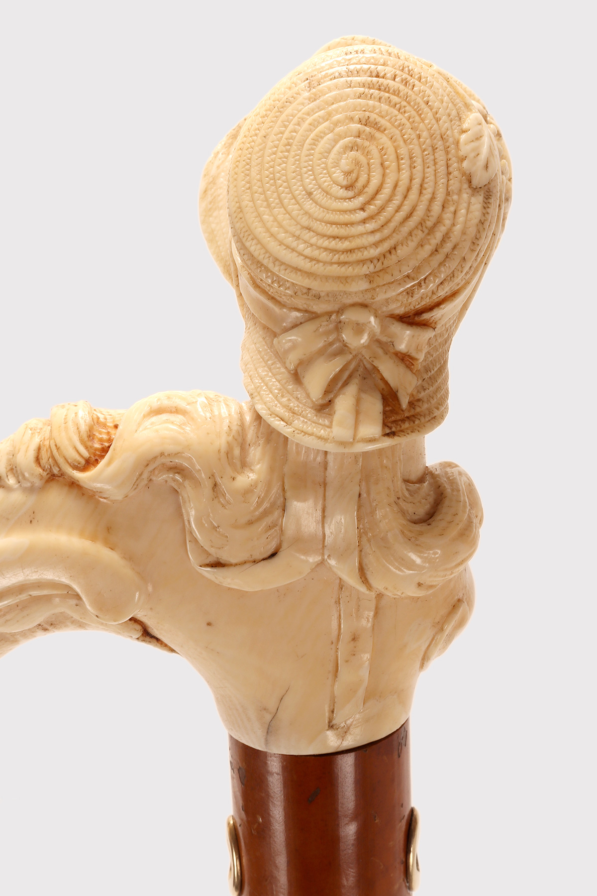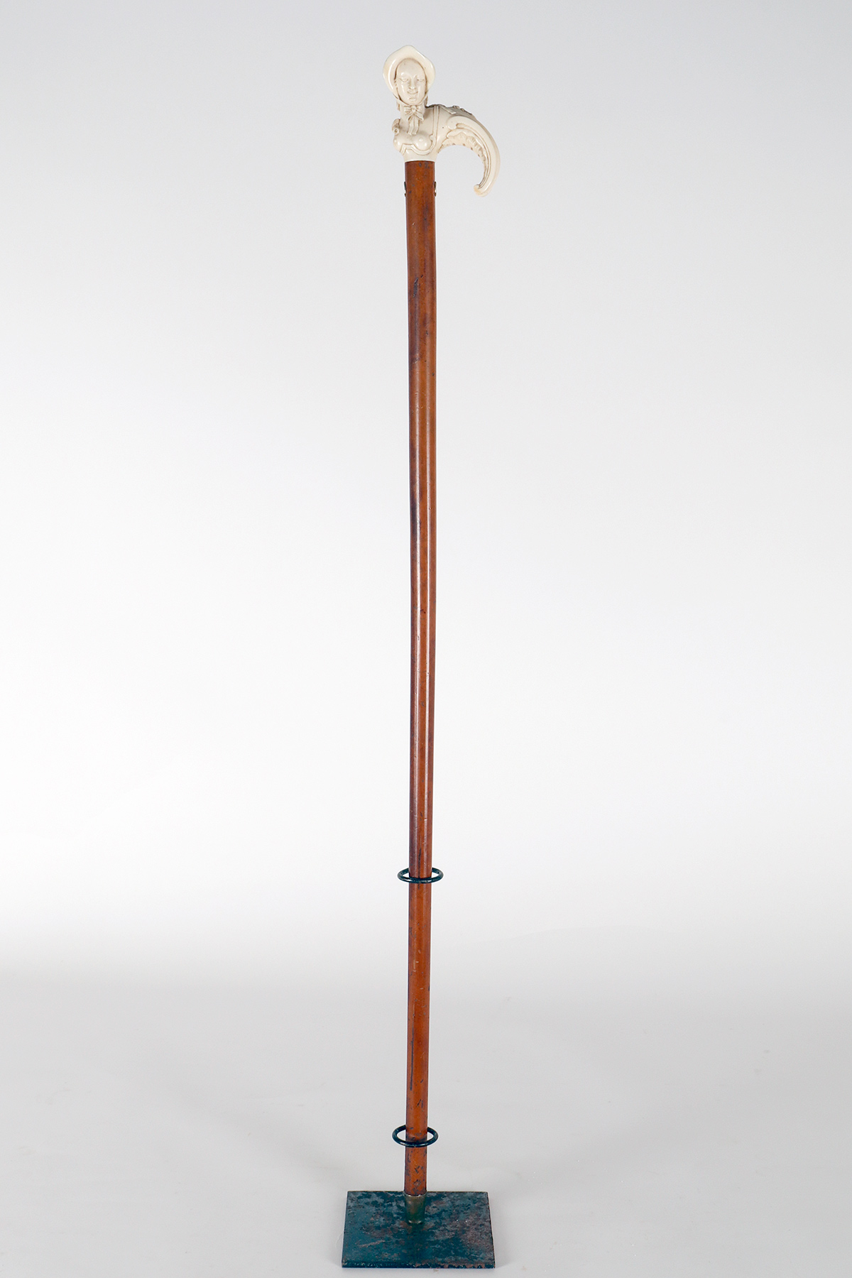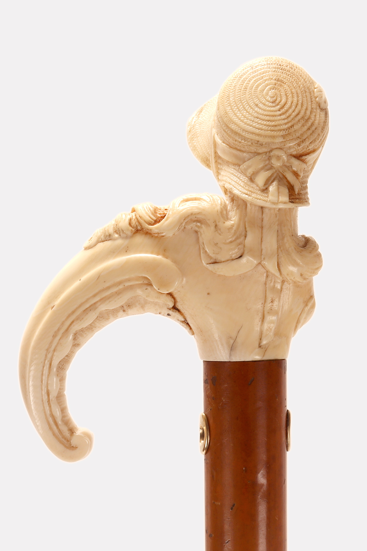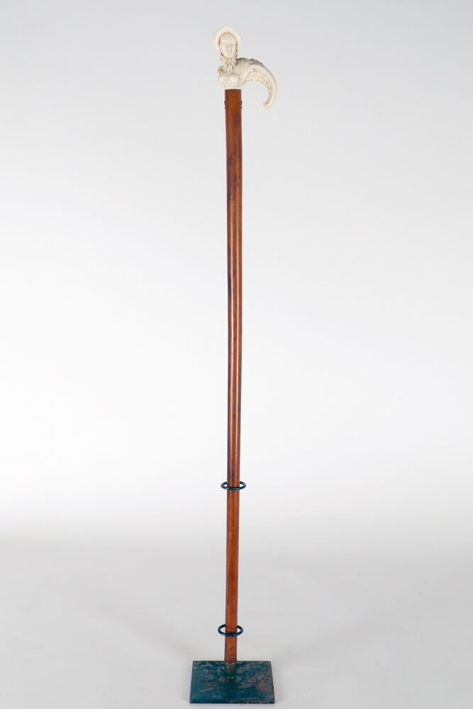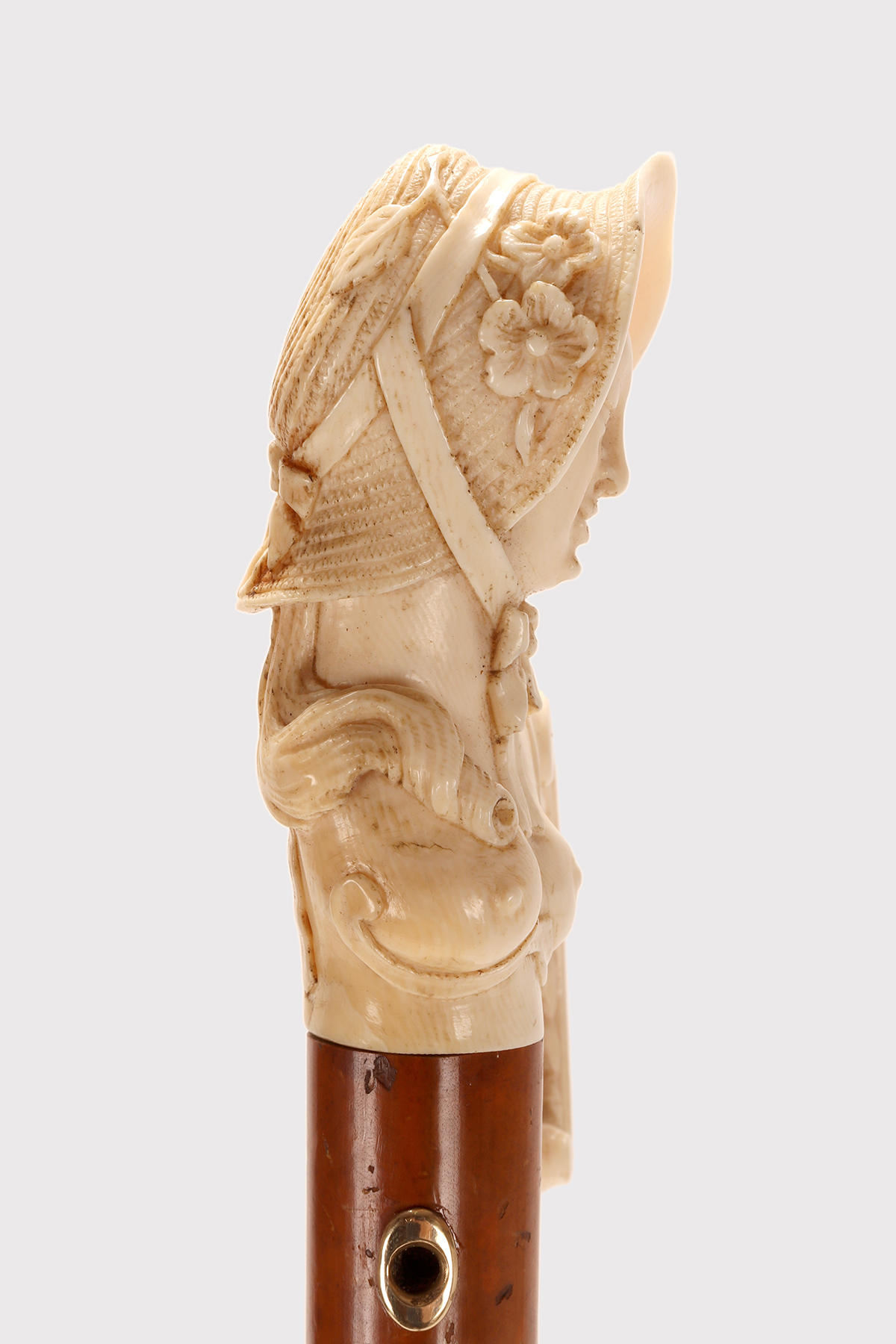 Bastone da passeggio: pomolo in avorio di grosse dimensioni finemente intagliato a forma di bequille. Raffigurante un busto femminile, una donna a seno nudo che indossa un cappellino di paglia finemente dettagliato. Questa tipica forma di pomolo, a volute che termina con una voluta, viene chiamato Bequille, è strettamente associata ai manici in porcellana realizzati dalle principali manifatture europee, in particolare la manifattura di porcellana di Meissen, che iniziò a produrre la prima porcellana a pasta dura d’Europa nel 1710. Canna in legno di malacca con occhielli in argento dorato, per il laccio da polso. Puntale in metallo. Germania metà del XVIII secolo. Cfr.: Catherine Dike e Guy Bezzaz, La Canne Objet d’Art, Les Éditions de l’Amateur, Parigi, 1988, p. 146-147. Museum für Kunst und Gewerbe, Hamburg. Roberta Maneker, Vertical Art The Enduring Beauty of Antique Canes and Walking Sticks, Hudson Hills Press LLC, Manchester, Vermont, 2008, p. 228, didascalia n. 303.