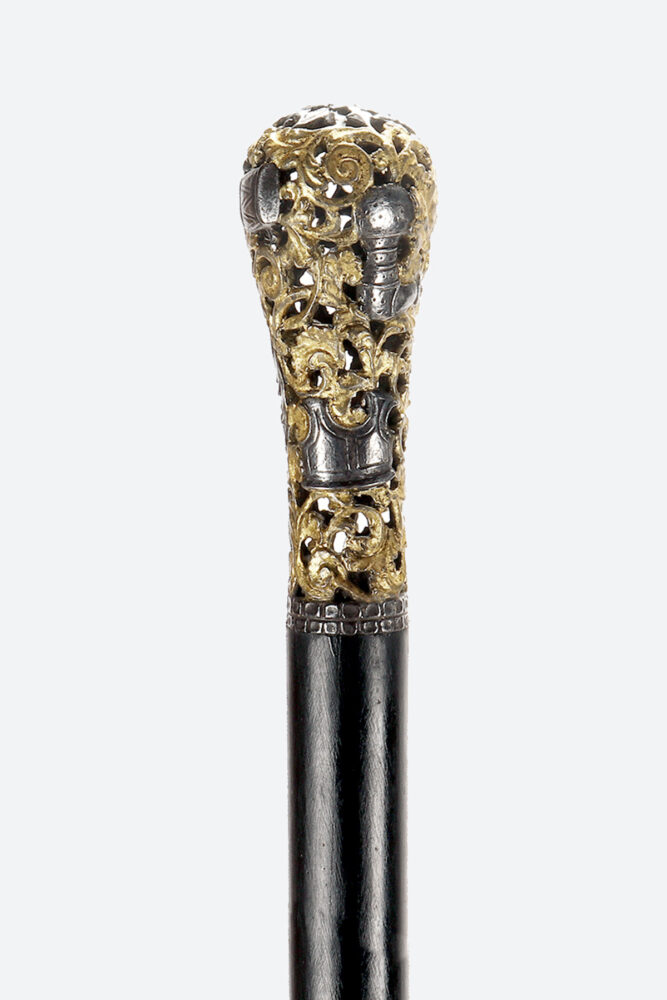 Walking stick: jewel Walking stick, milord-shaped knob in perforated Berlin iron, with relief and gilded engravings, depicting parts of armours. Ebony wood shaft. Metal ferrule. Germany circa 1800.