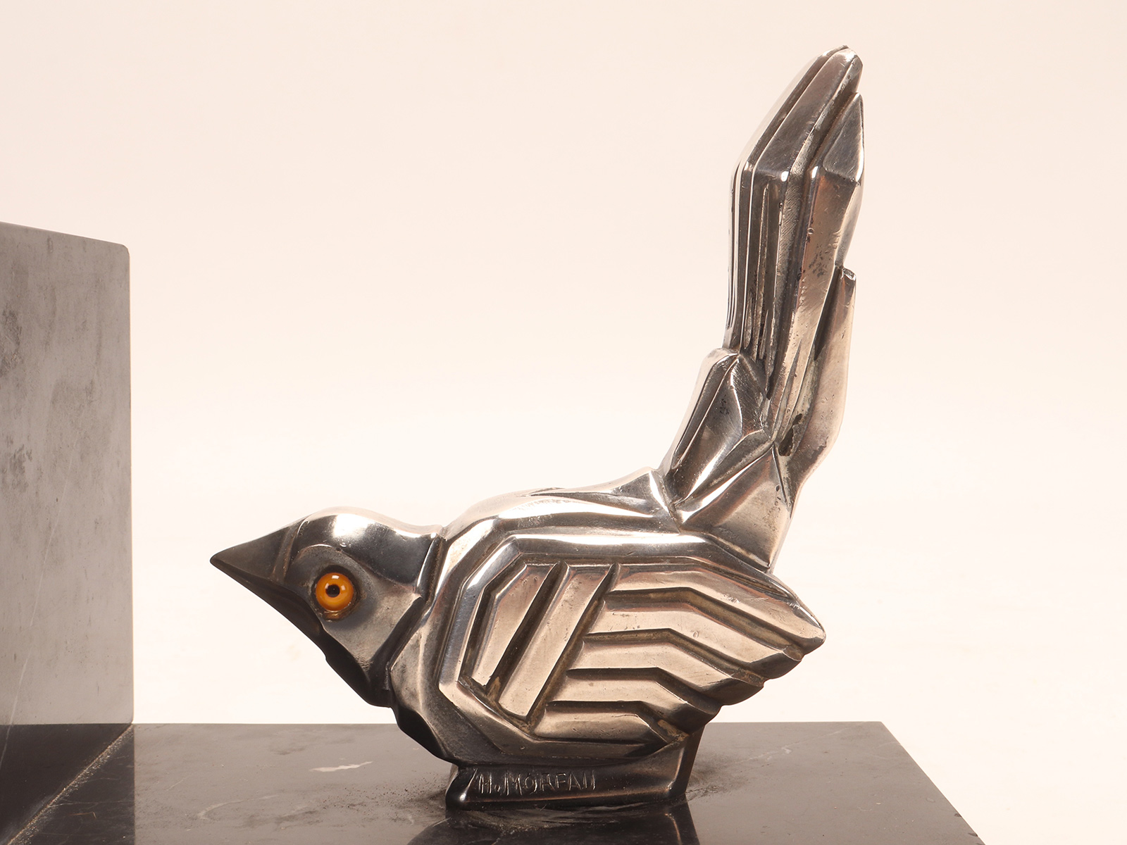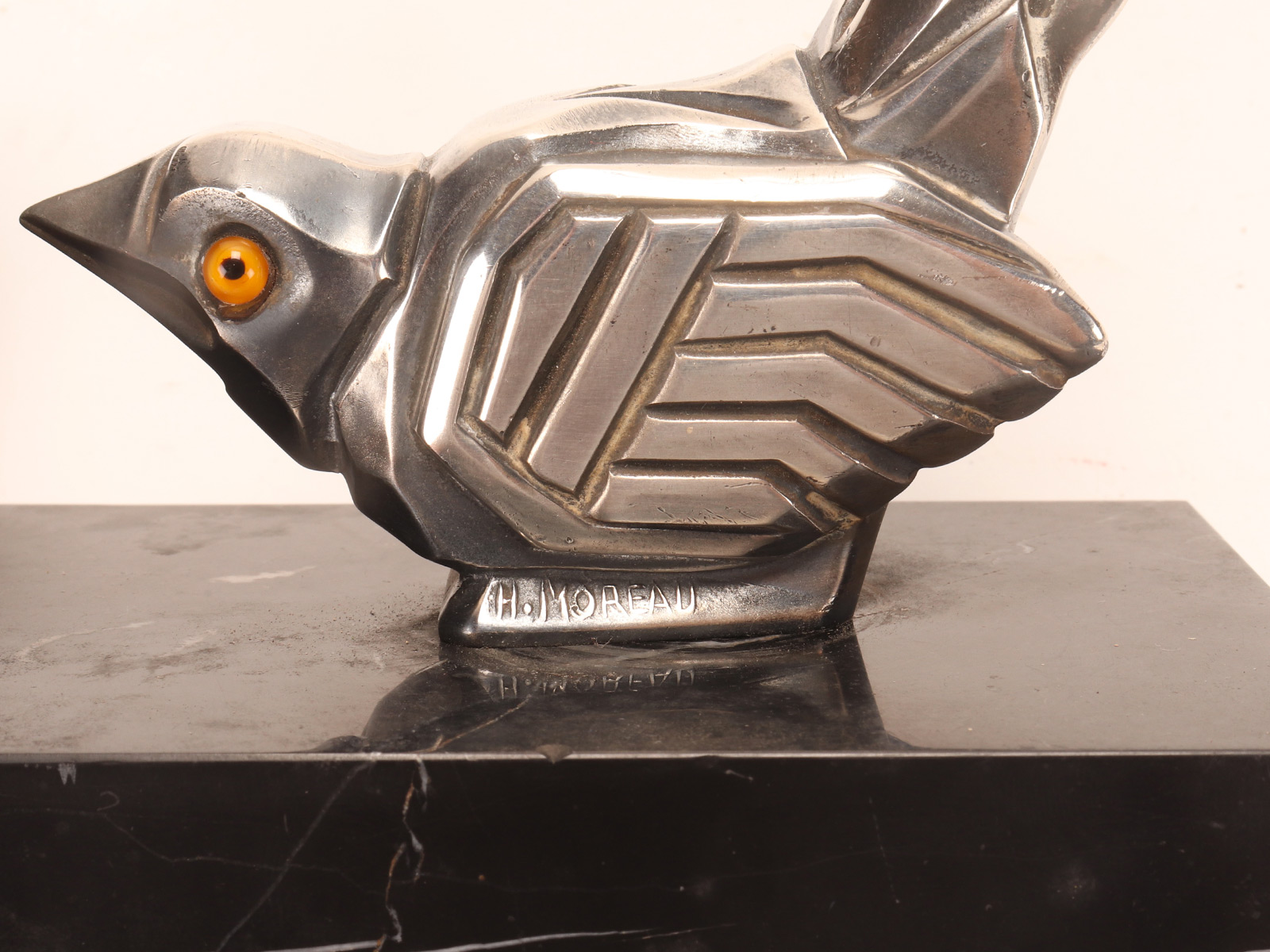 Pair of Art Deco bookends in black marble with orthogonal L-shaped structure. On the marble base there are two identical metal sculptures, depicting two sparrow birds with glass paste eyes. Signed H. Moreau. France circa 1925.