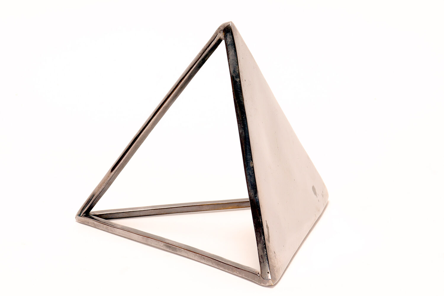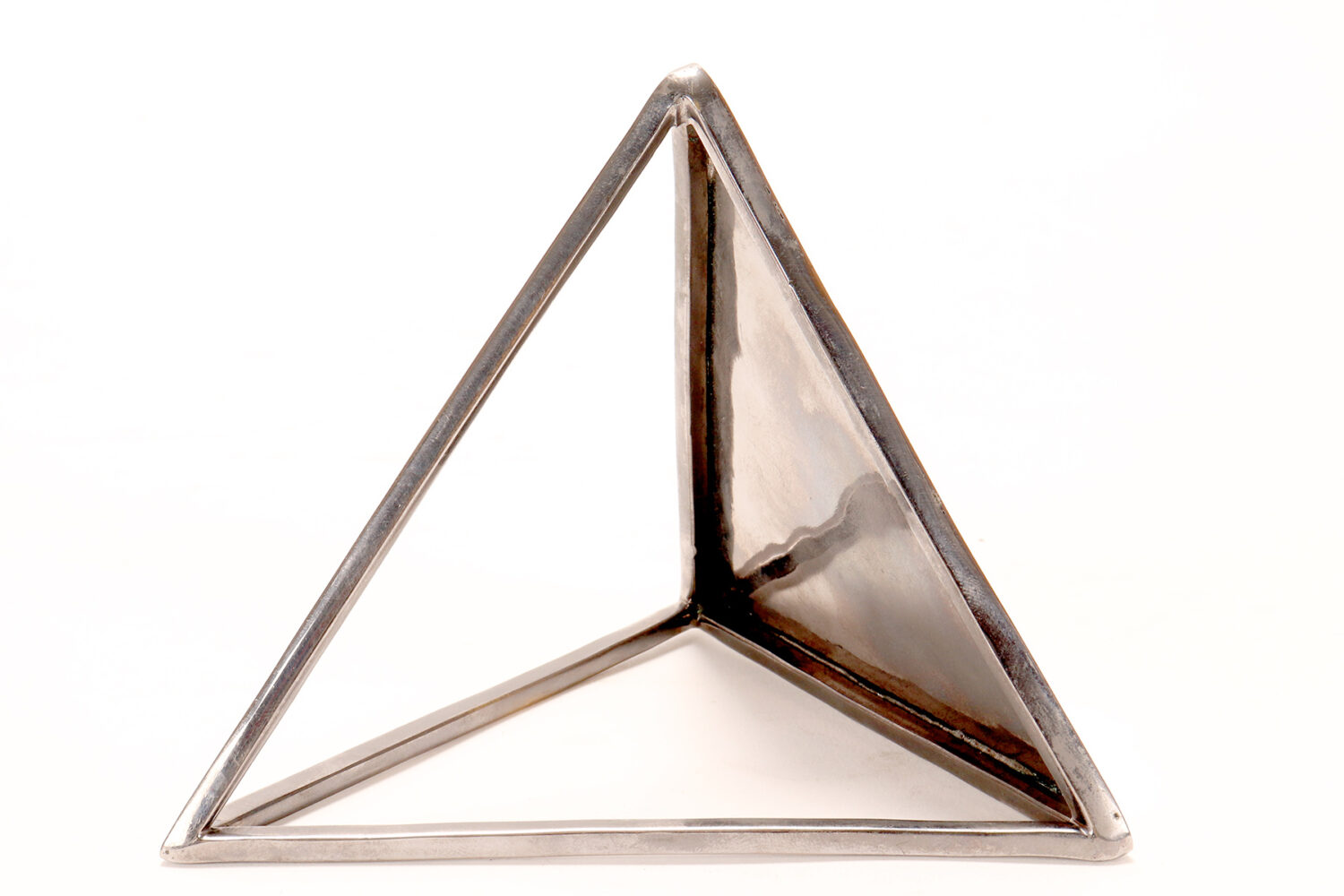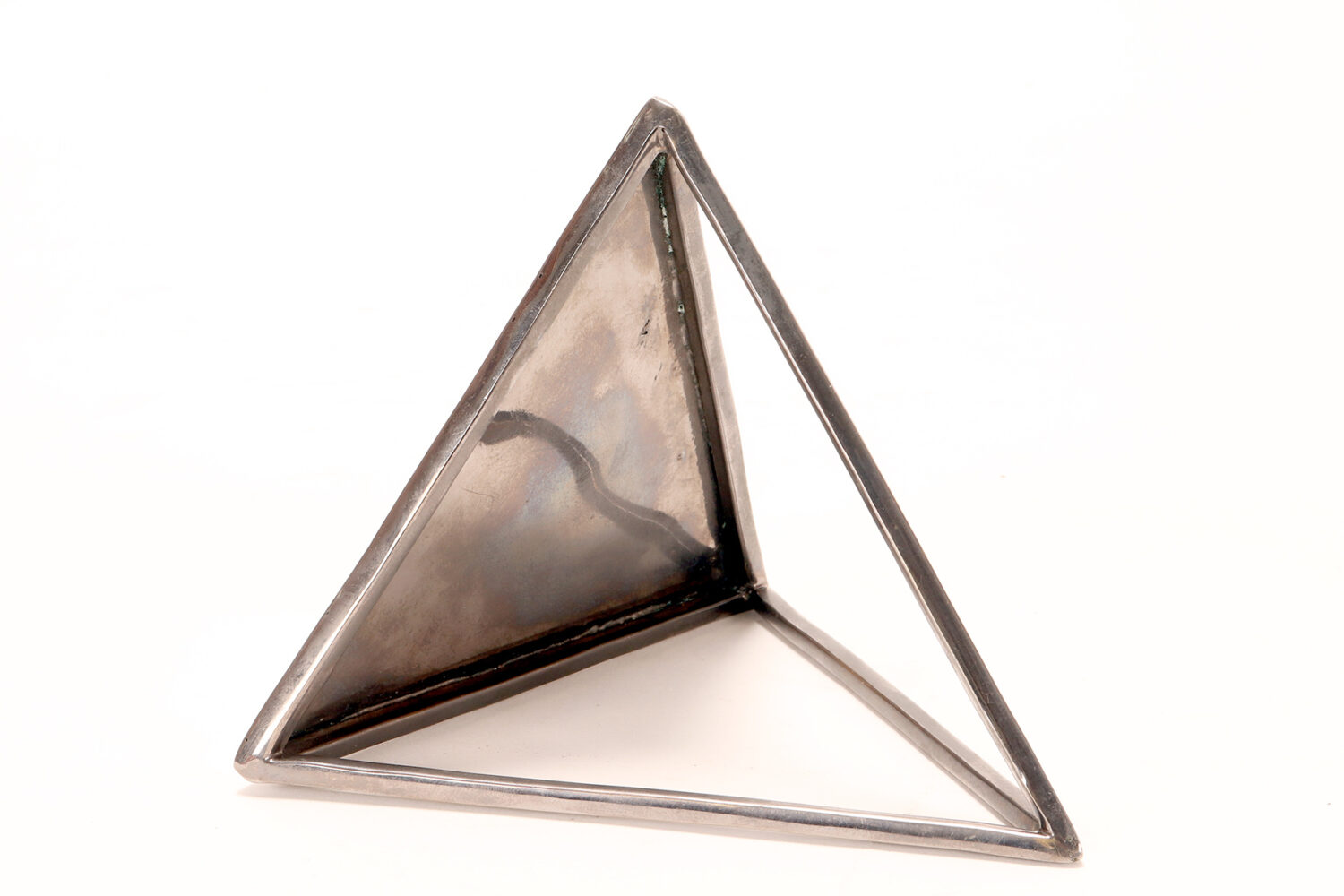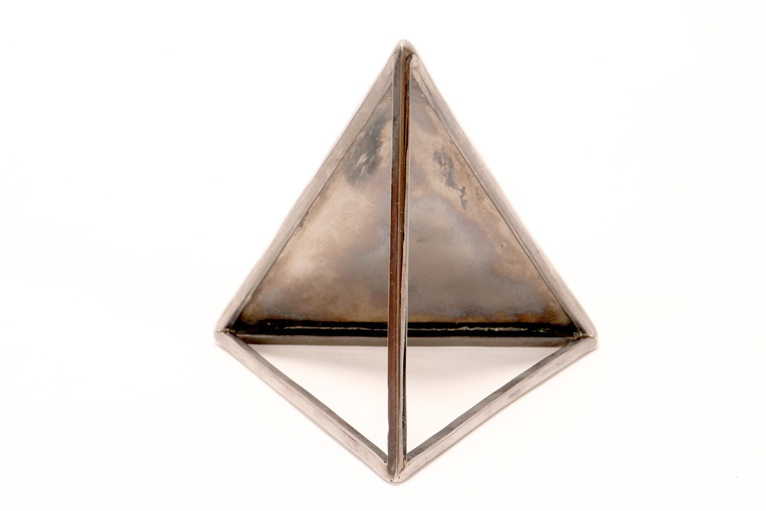 Prototipo di bracciale a forma di tetraedro realizzato in ottone brunito. Un lato del solido è una lastra in ottone lucida a forma di triangolo equilatero, gli altri tre lati sono vuoti. Designer Stefania Bosio per Ornamenta. Italia anno 2000.