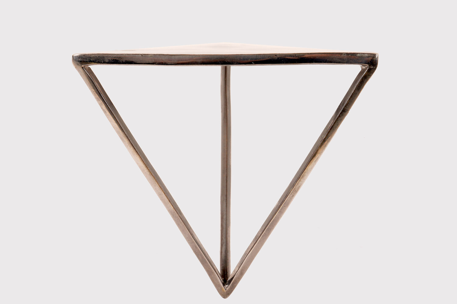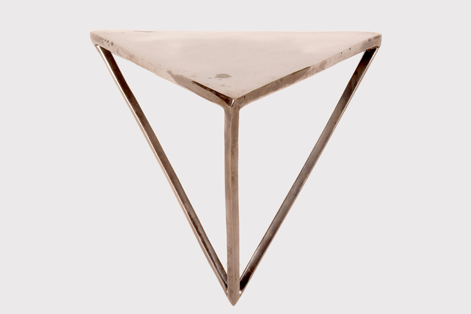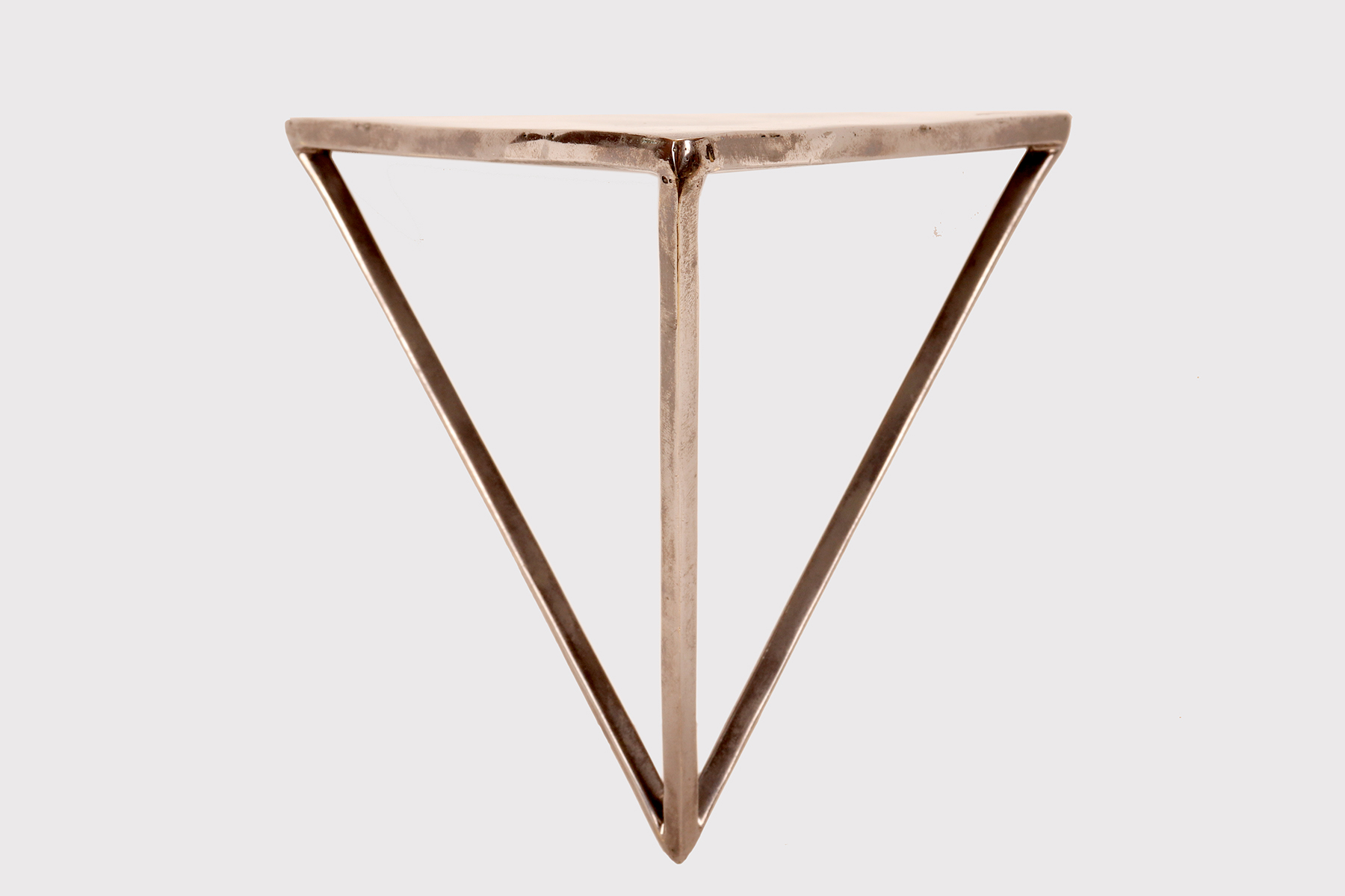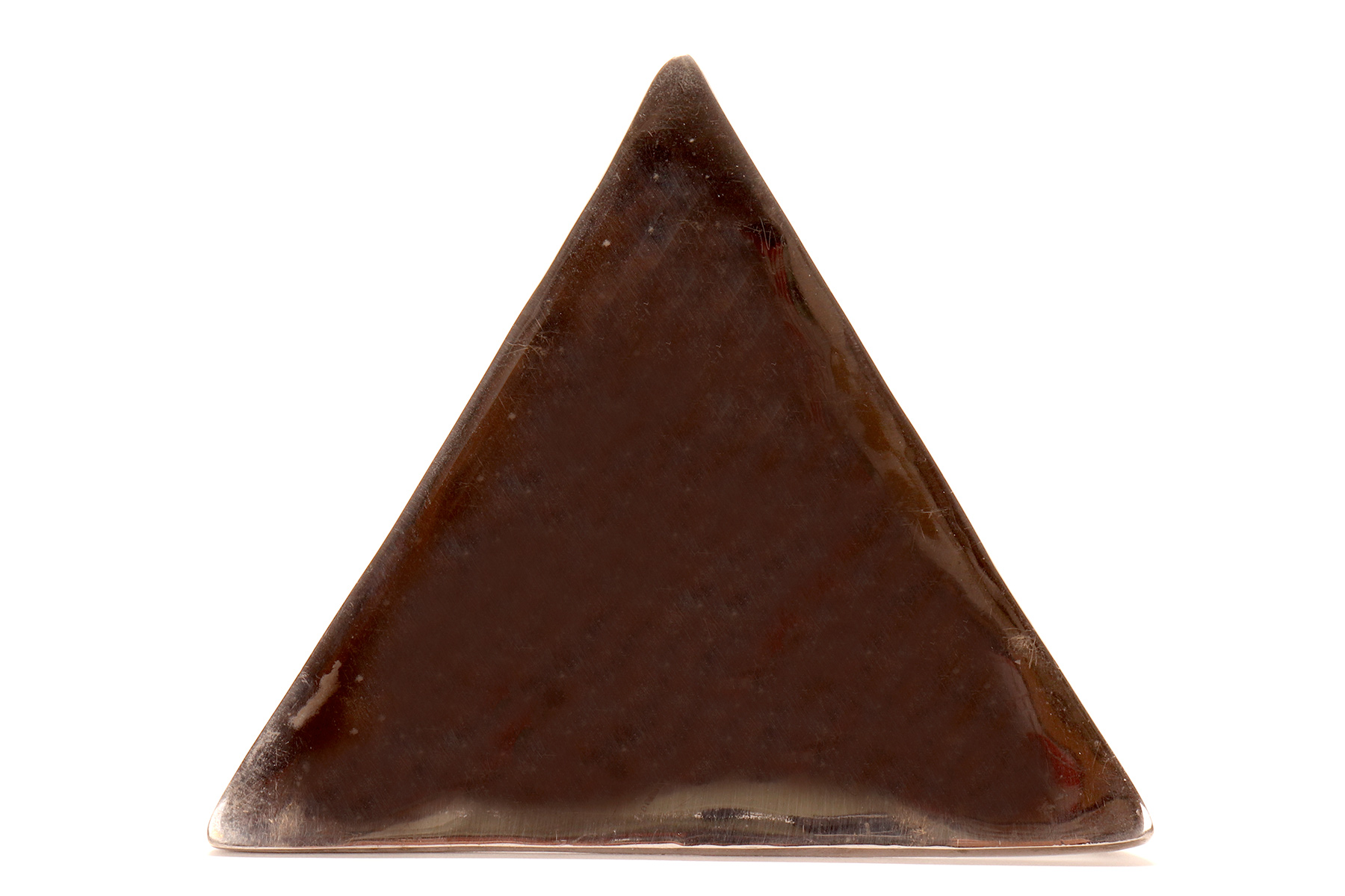 Prototipo di bracciale a forma di tetraedro realizzato in ottone brunito. Un lato del solido è una lastra in ottone lucida a forma di triangolo equilatero, gli altri tre lati sono vuoti. Designer Stefania Bosio per Ornamenta. Italia anno 2000.