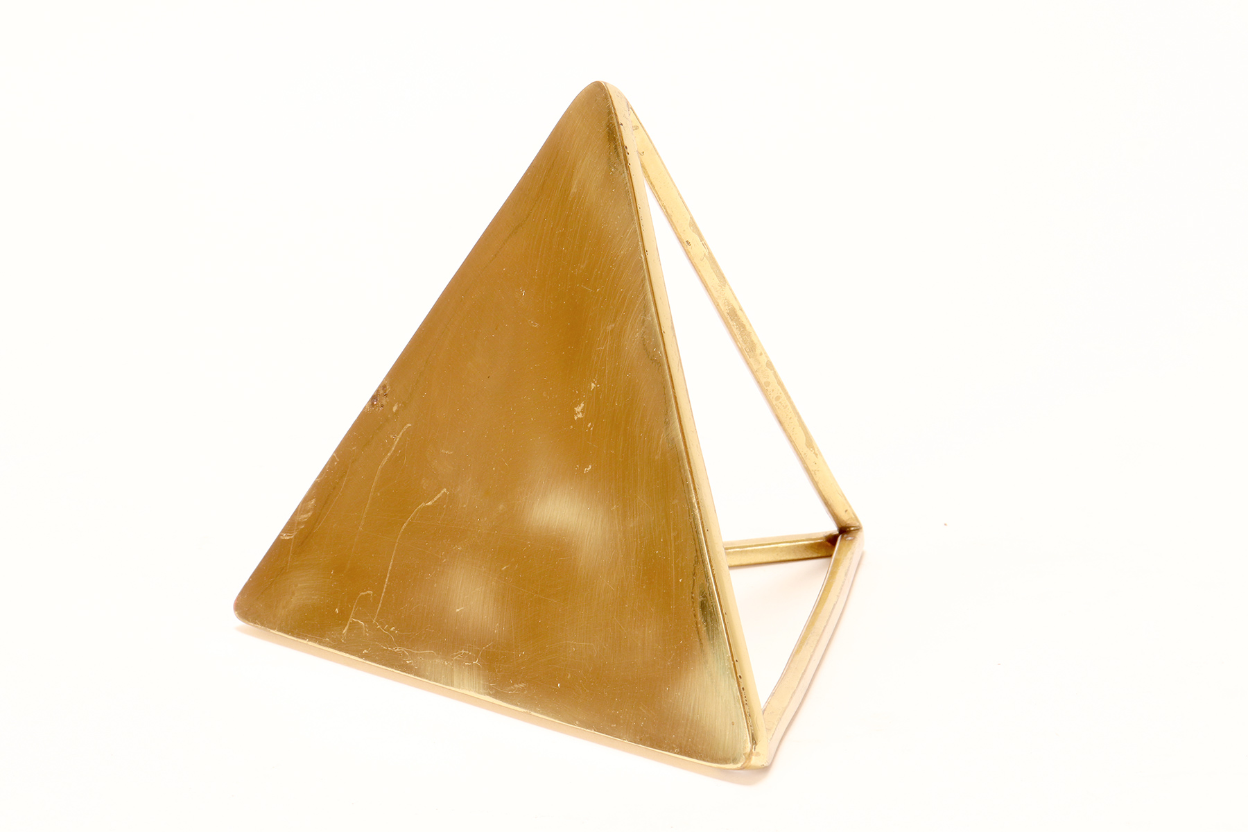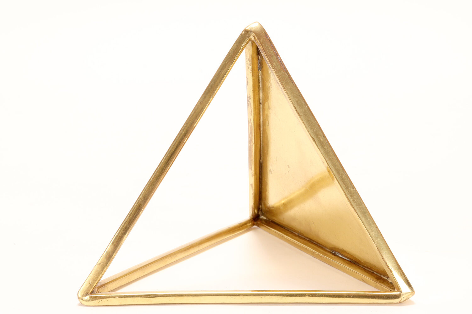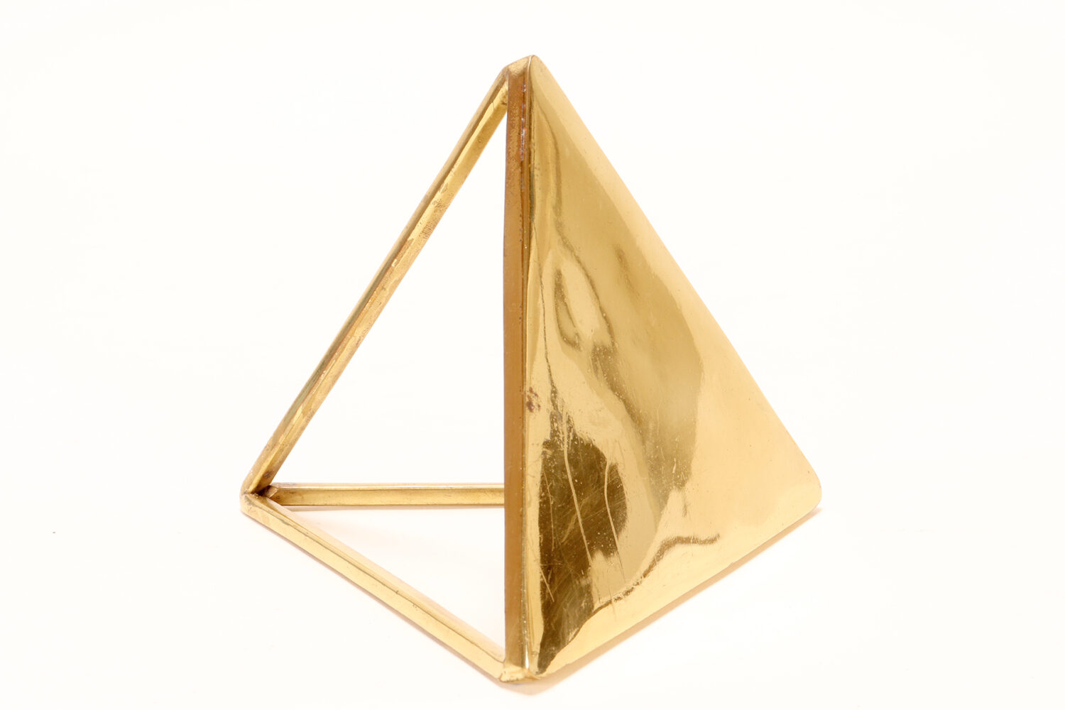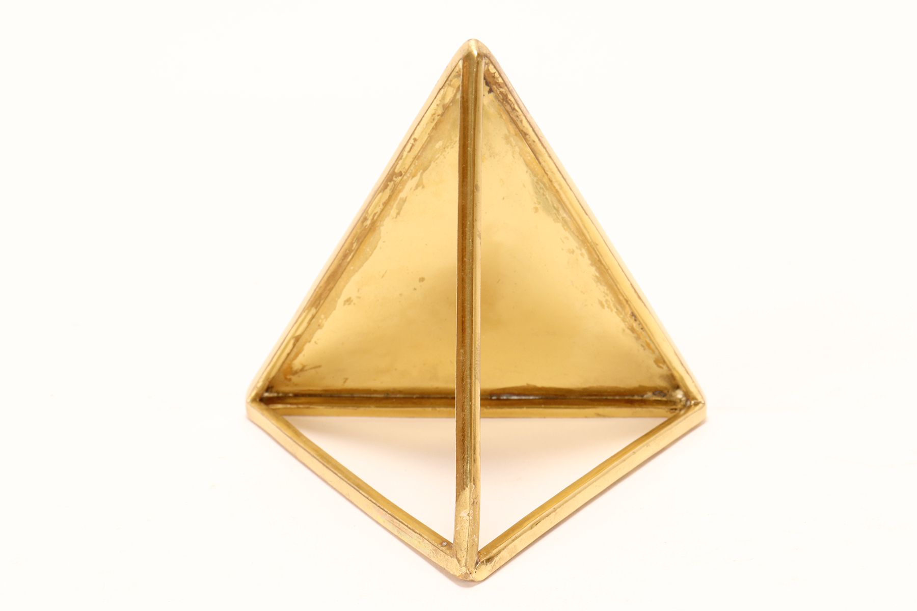 Prototipo di bracciale a forma di tetraedro realizzato in ottone. Un lato del solido è una lastra in ottone a forma di triangolo equilatero, gli altri tre lati sono vuoti. Designer Stefania Bosio per Ornamenta. Italia anno 2000.