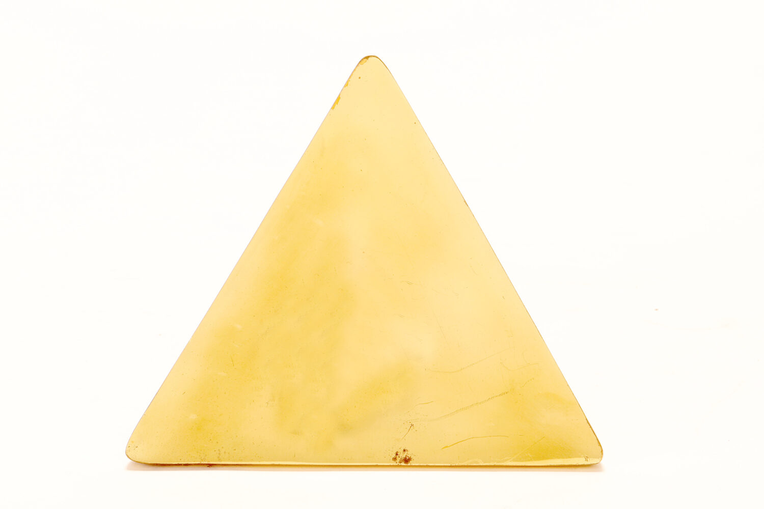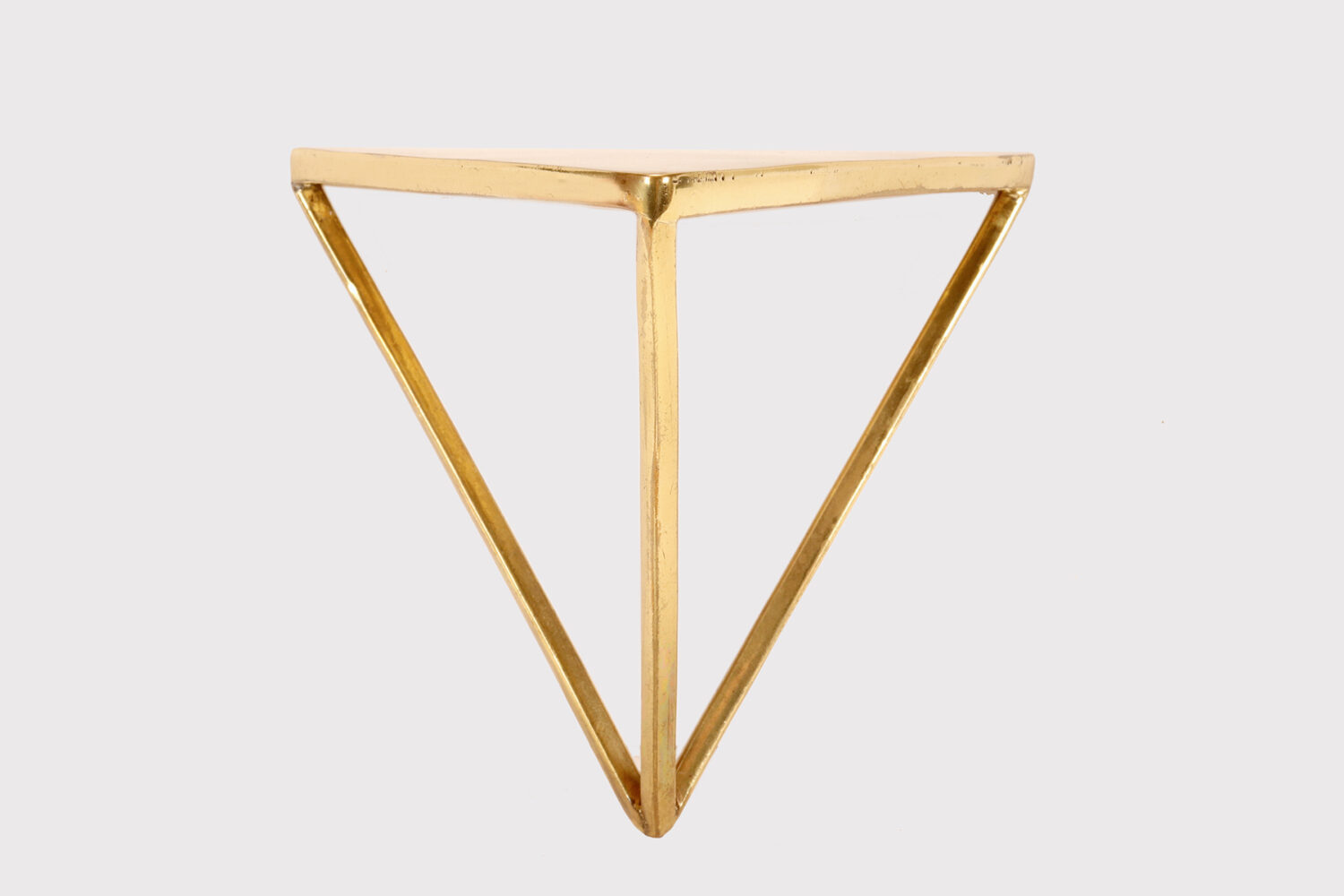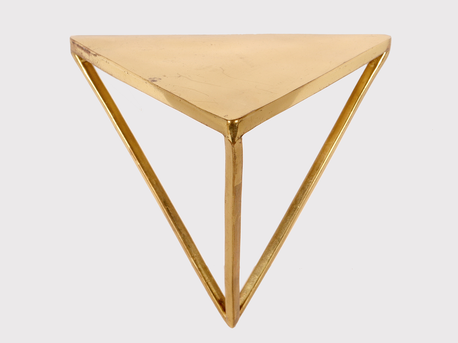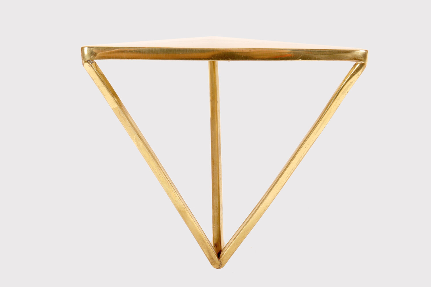 Prototipo di bracciale a forma di tetraedro realizzato in ottone. Un lato del solido è una lastra in ottone a forma di triangolo equilatero, gli altri tre lati sono vuoti. Designer Stefania Bosio per Ornamenta. Italia anno 2000.