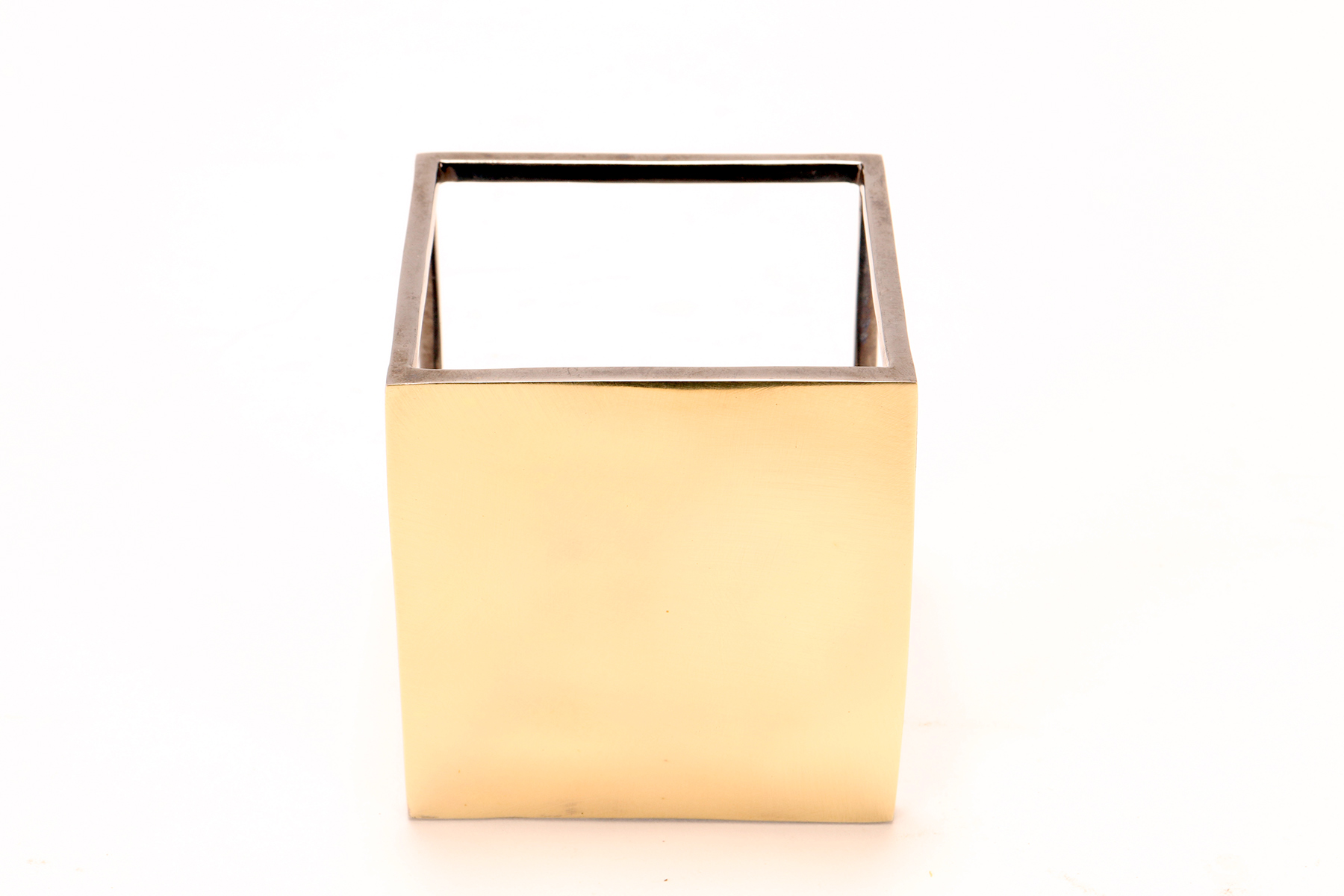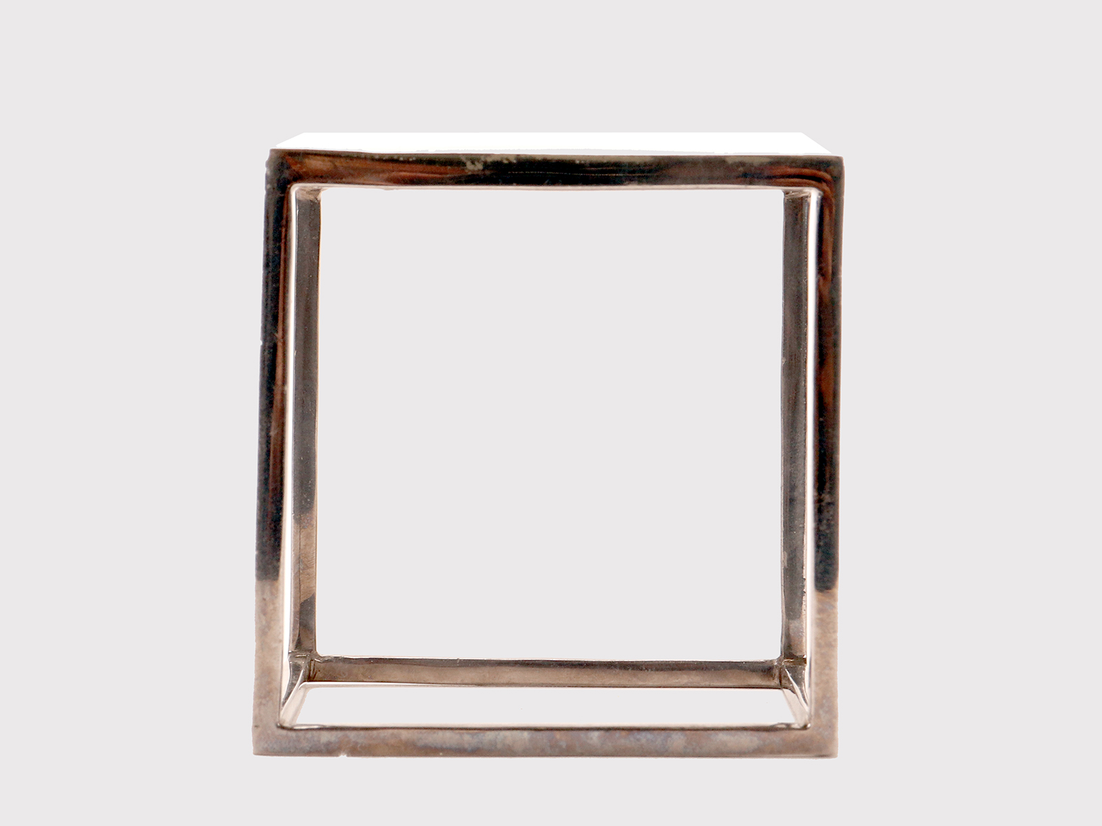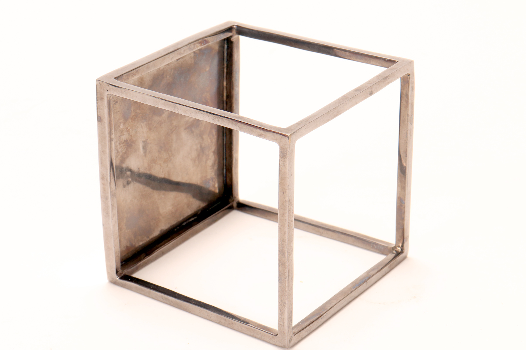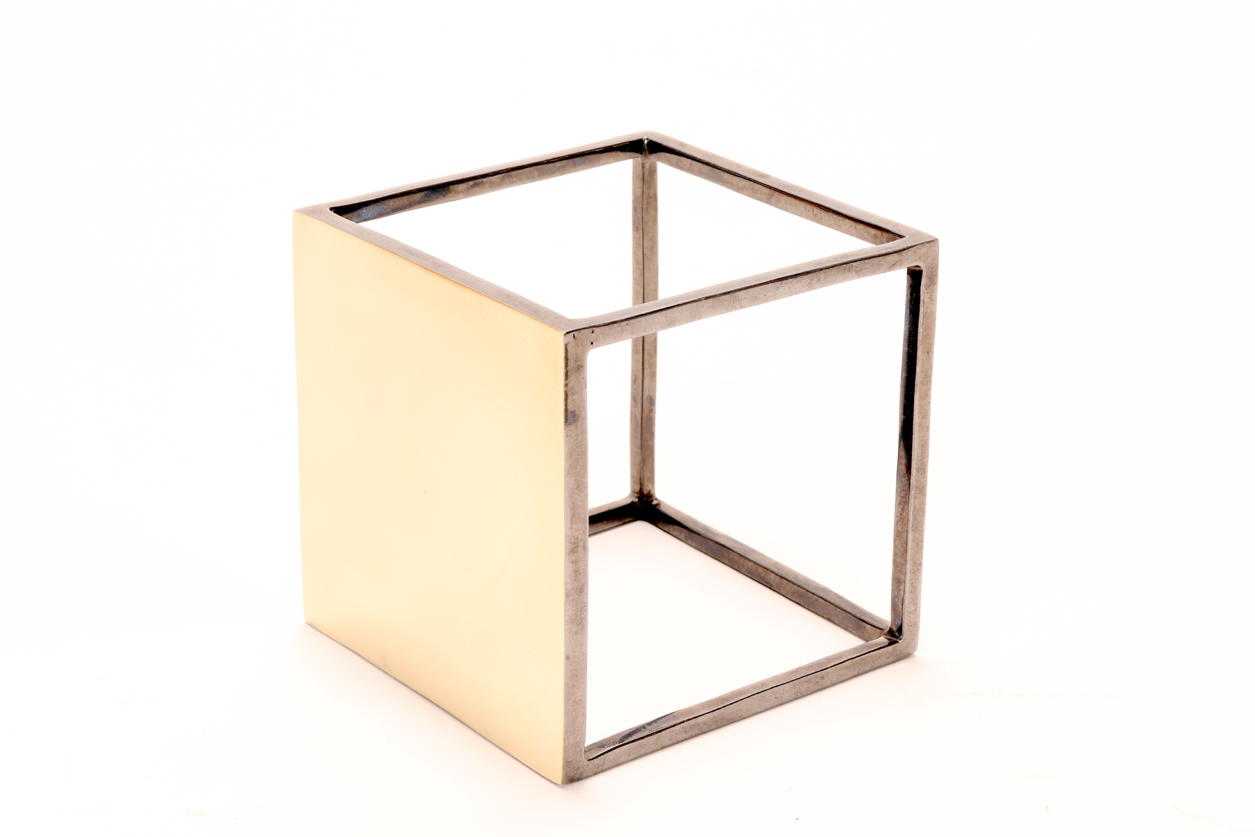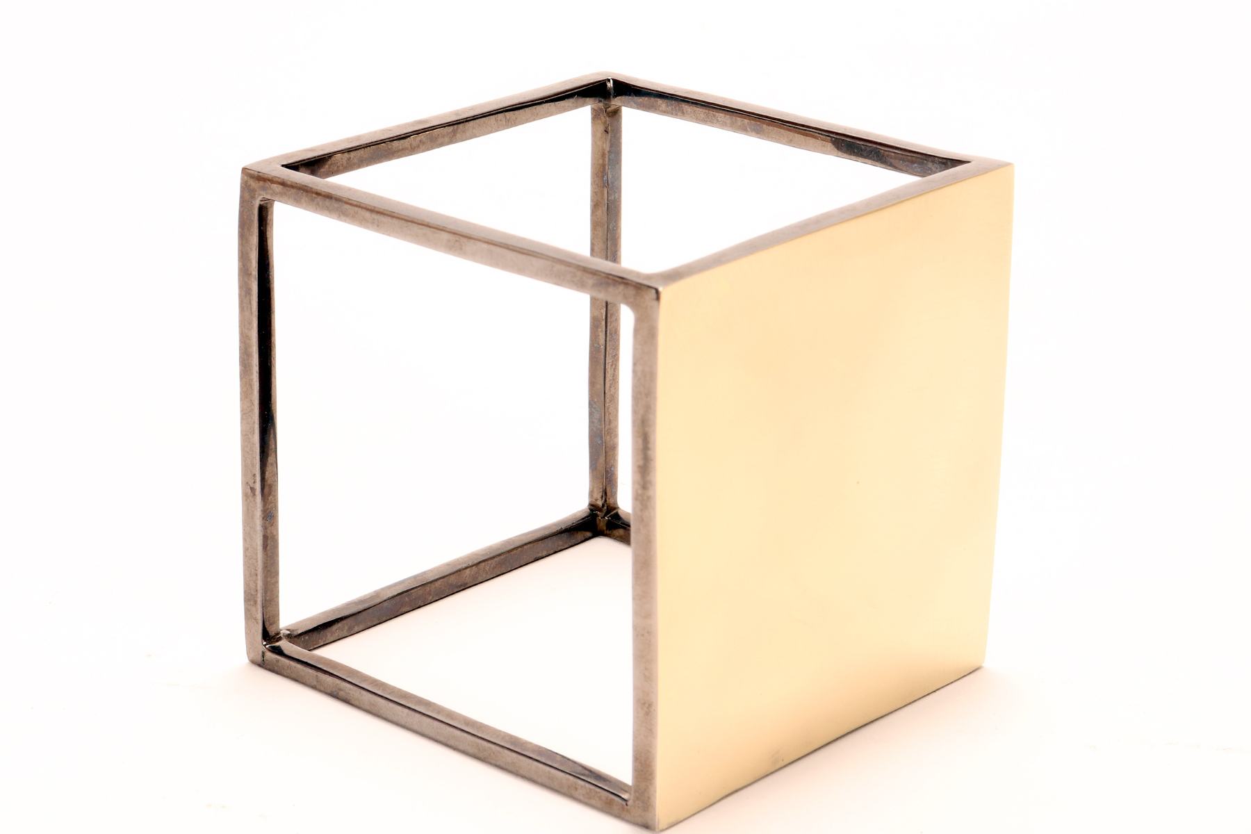 Prototipo di bracciale in di forma cubica realizzato in ottone brunito. Un lato del solido è una lastra in ottone brunito a forma di quadrato, gli altri cinque lati sono vuoti. Designer Stefania Bosio per Ornamenta. Italia anno 2000.