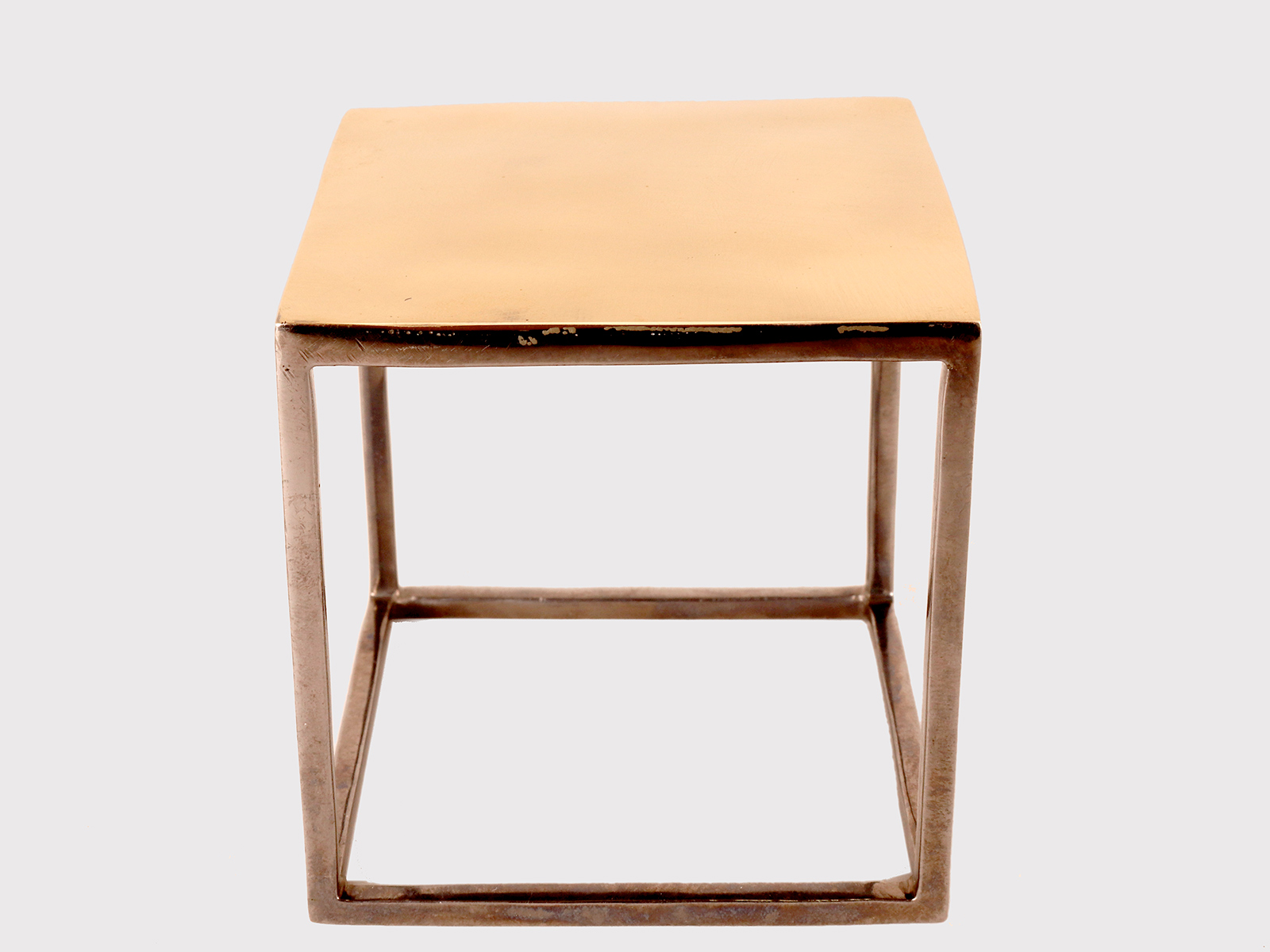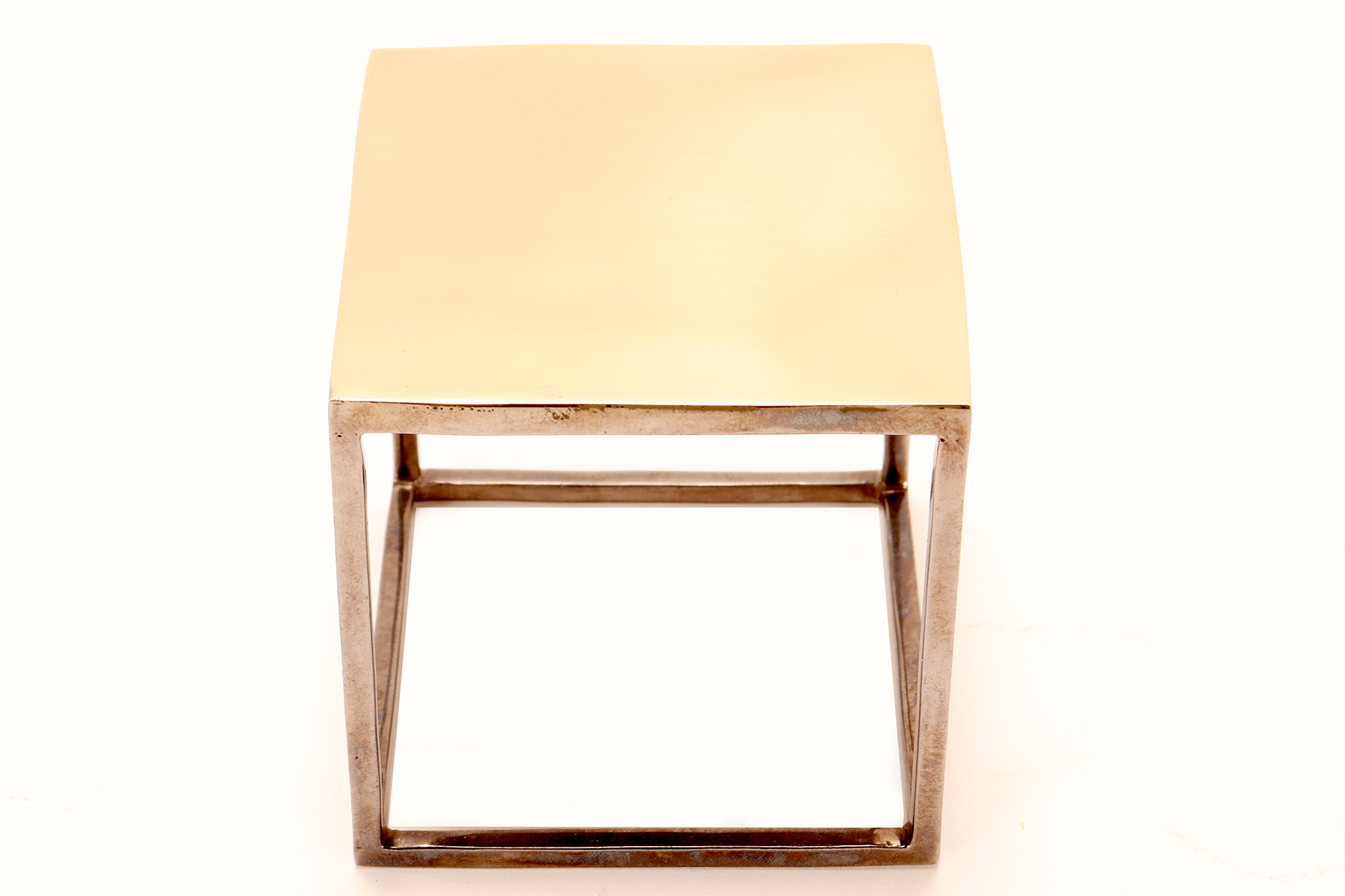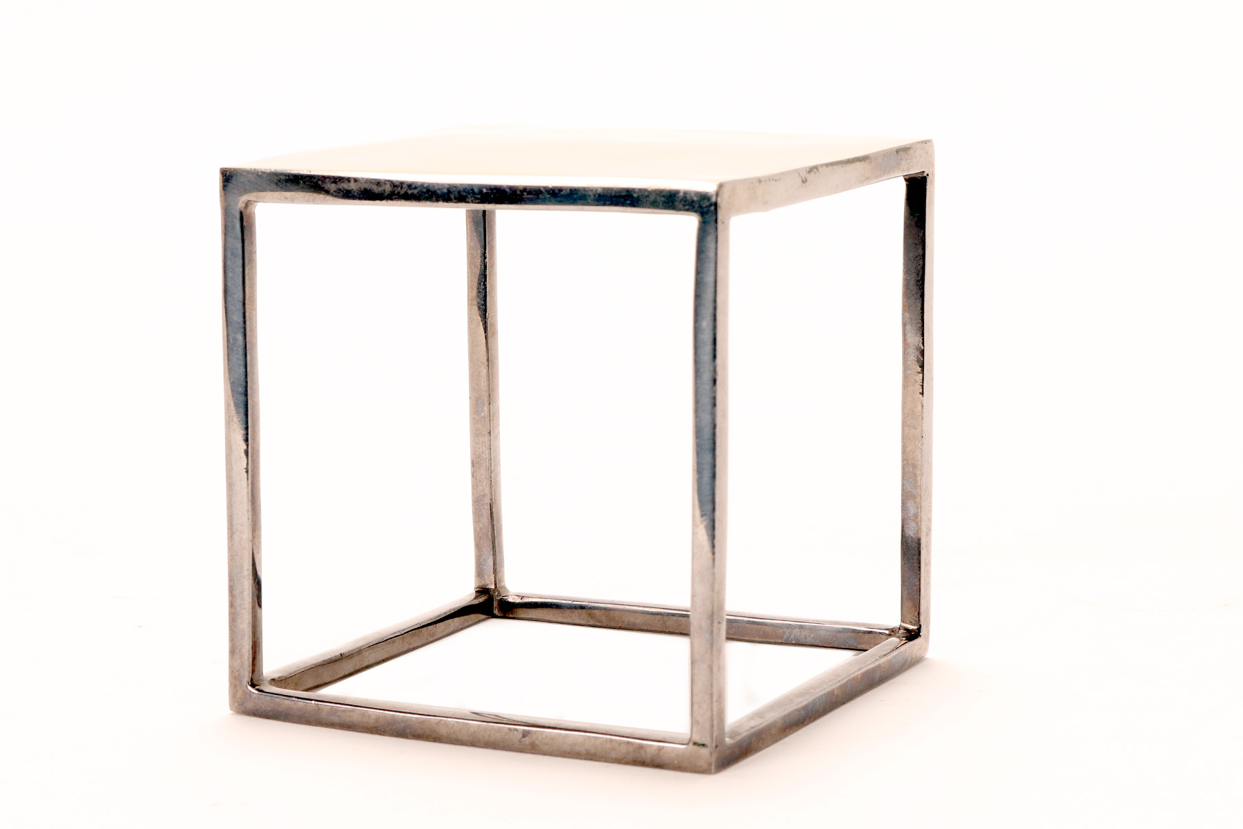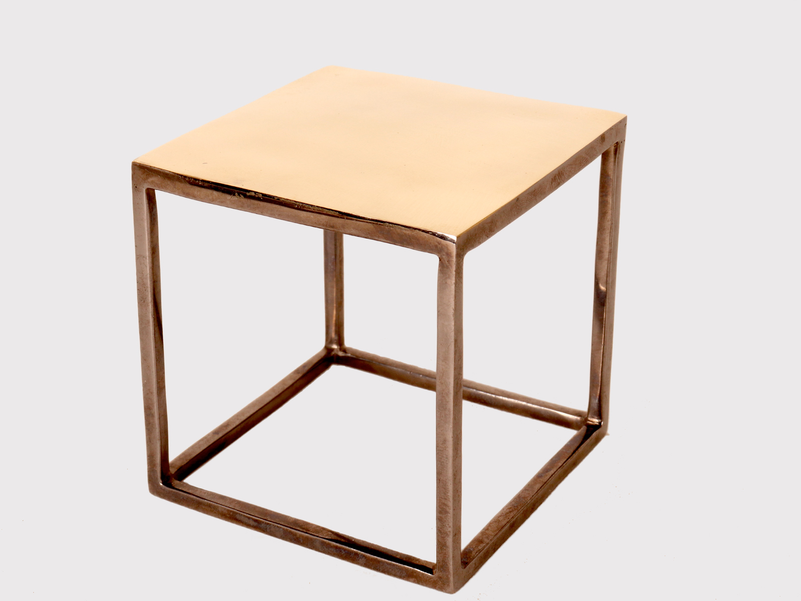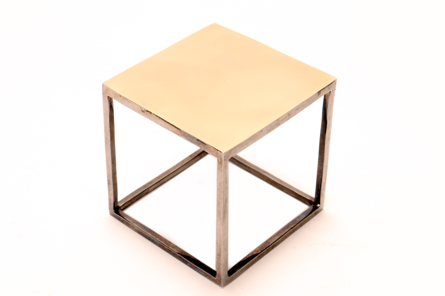 Prototipo di bracciale in di forma cubica realizzato in ottone brunito. Un lato del solido è una lastra in ottone brunito a forma di quadrato, gli altri cinque lati sono vuoti. Designer Stefania Bosio per Ornamenta. Italia anno 2000.