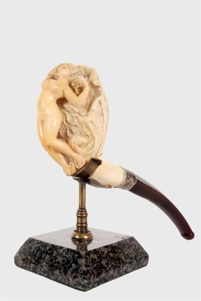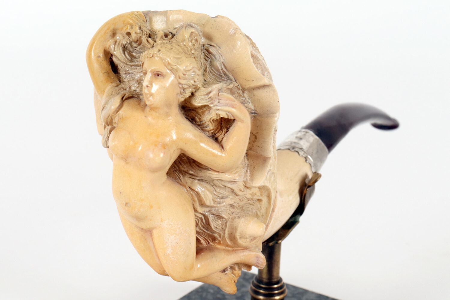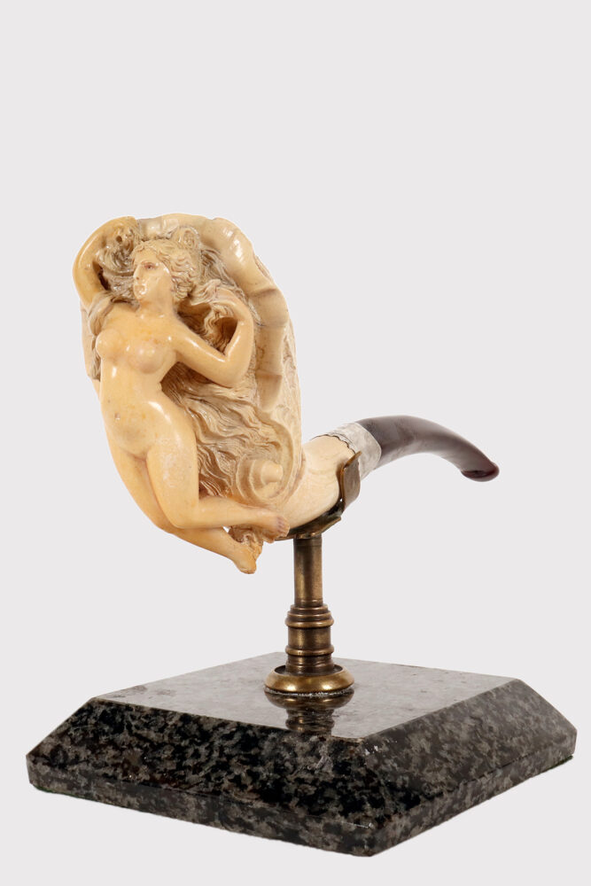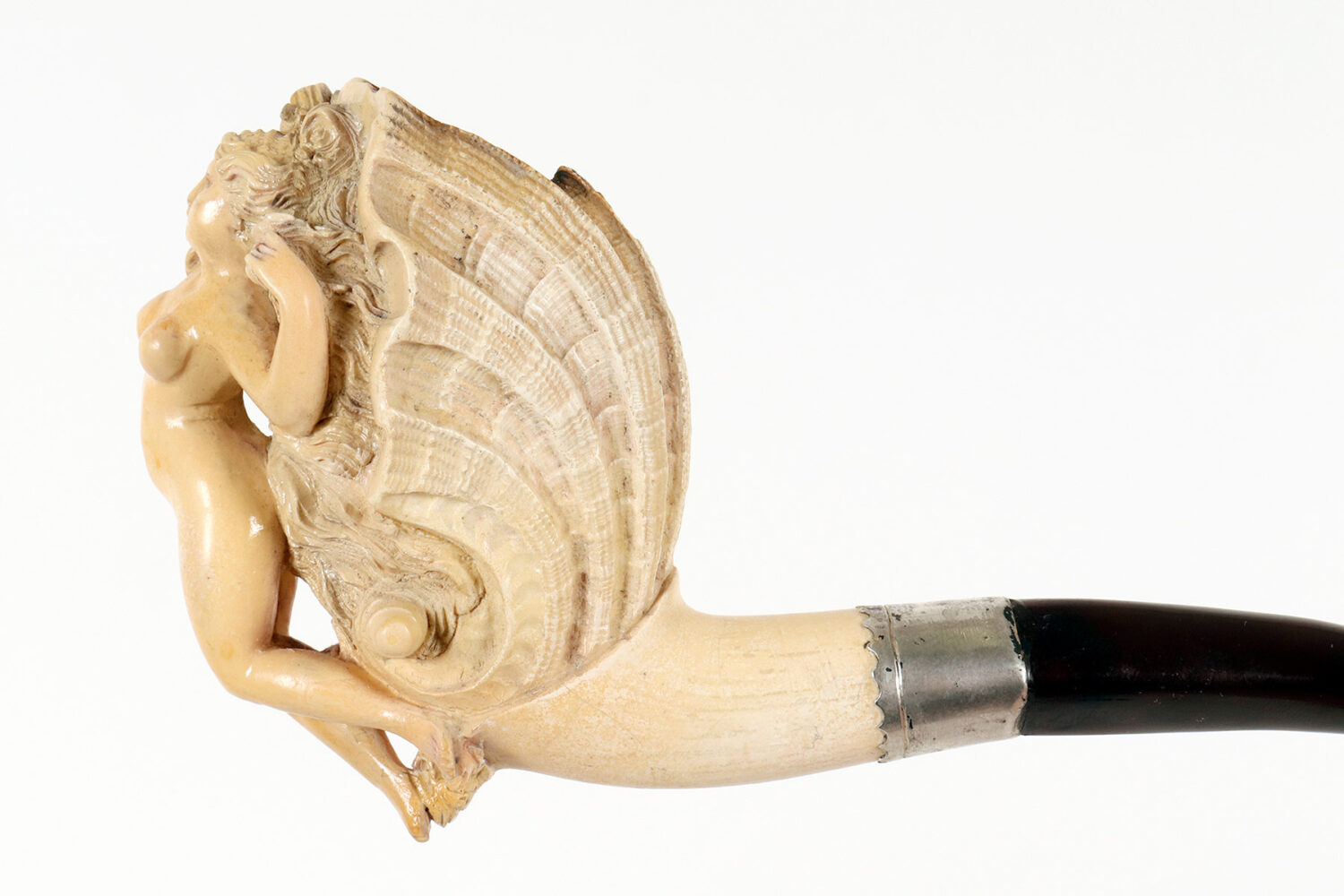 Pipe made of genuine carved meerschaum (hydrated magnesium silicate), with a genuine natural amber mouthpiece. The bowl is shaped like a shell with deep, sinuous grooves. Resting on it is the figure of a Venus, exquisitely sculpted and detailed, naturally following the curve. A silver band connects the bowl to the mouthpiece. The quality of the carving and attention to detail are excellent. Excellent patina. Austria, circa 1890