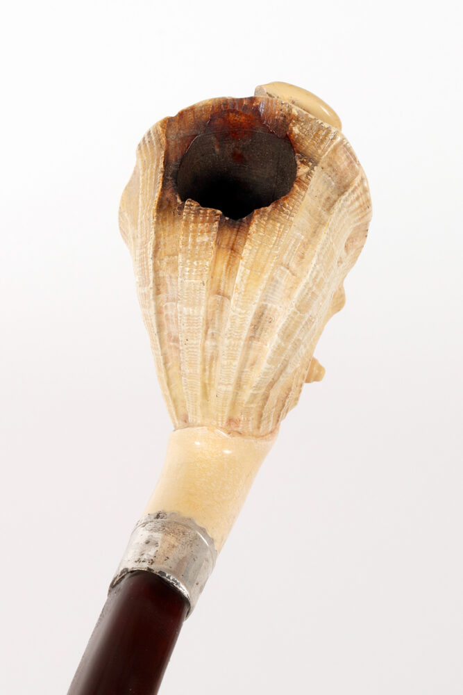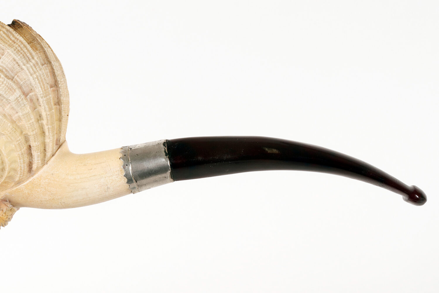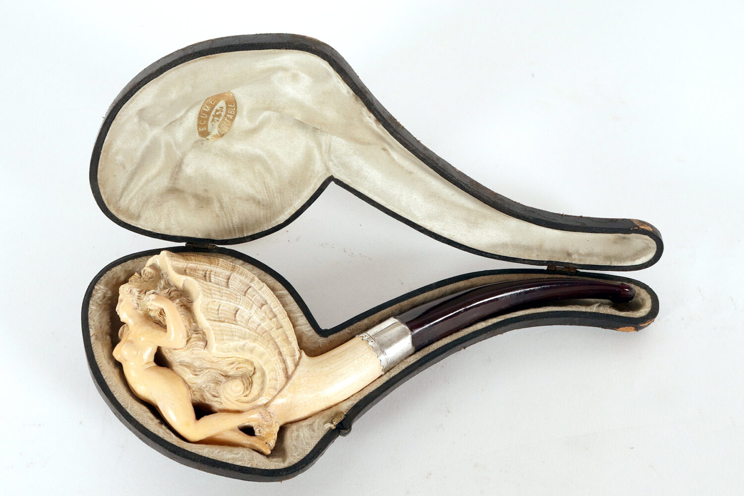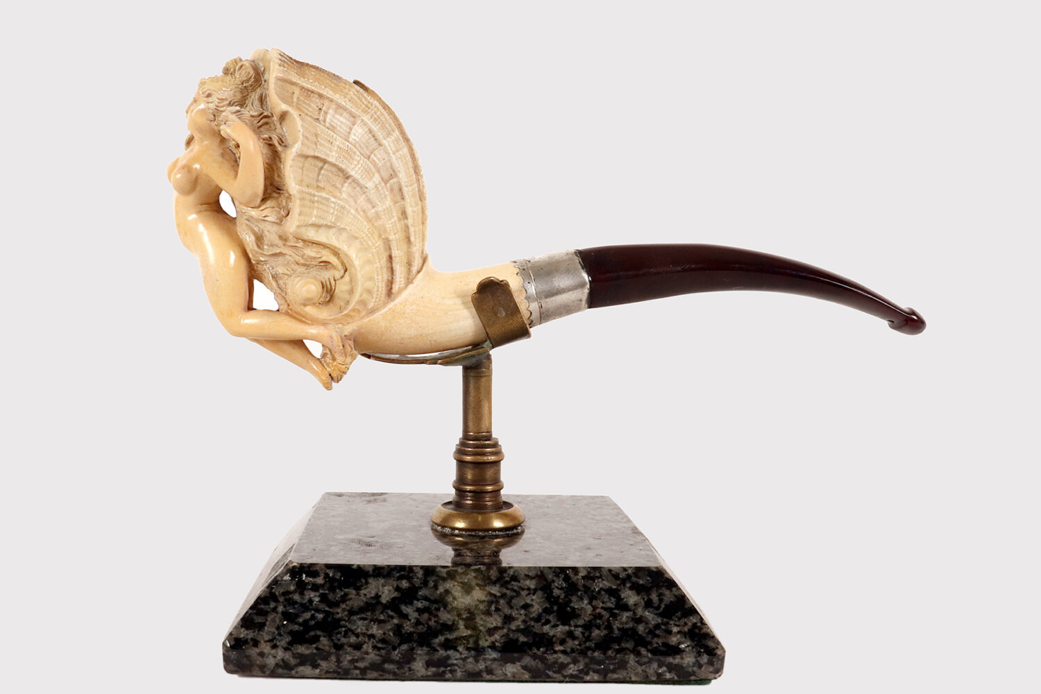Pipe made of genuine carved meerschaum (hydrated magnesium silicate), with a genuine natural amber mouthpiece. The bowl is shaped like a shell with deep, sinuous grooves. Resting on it is the figure of a Venus, exquisitely sculpted and detailed, naturally following the curve. A silver band connects the bowl to the mouthpiece. The quality of the carving and attention to detail are excellent. Excellent patina. Austria, circa 1890