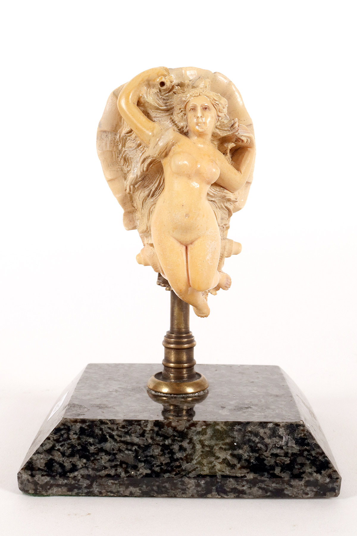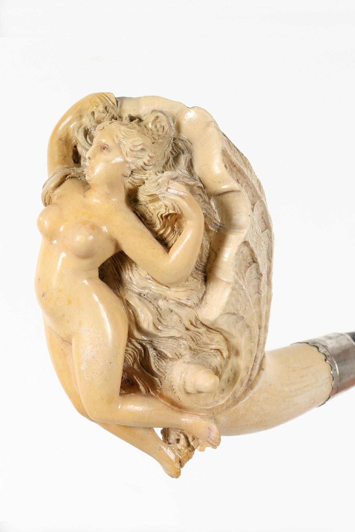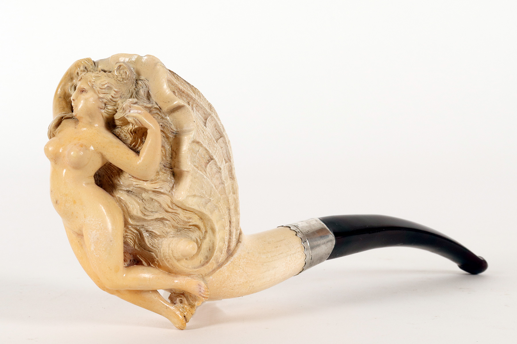 Finely carved meerschaum and amber pipe, depicting Venus reclining on a shell, Austria, late 19th century.