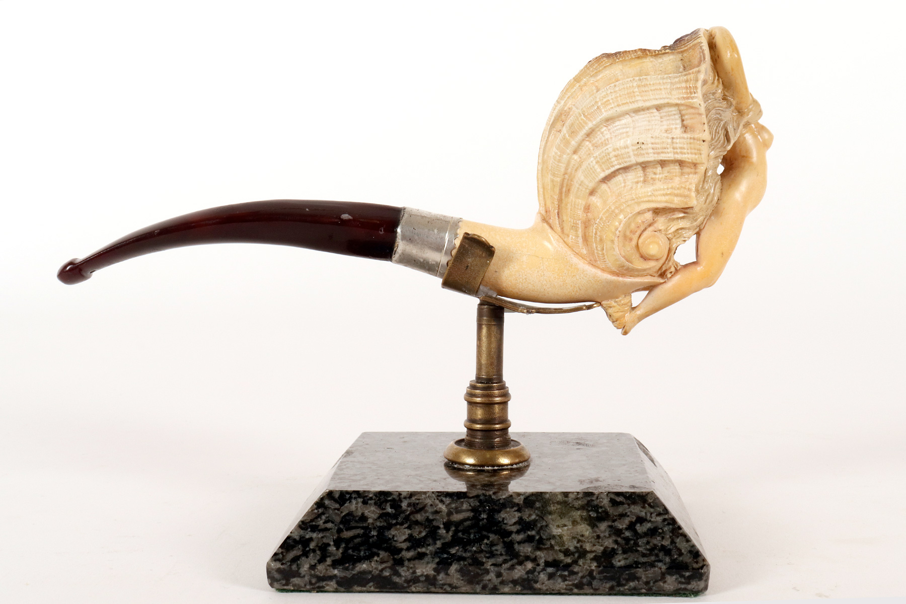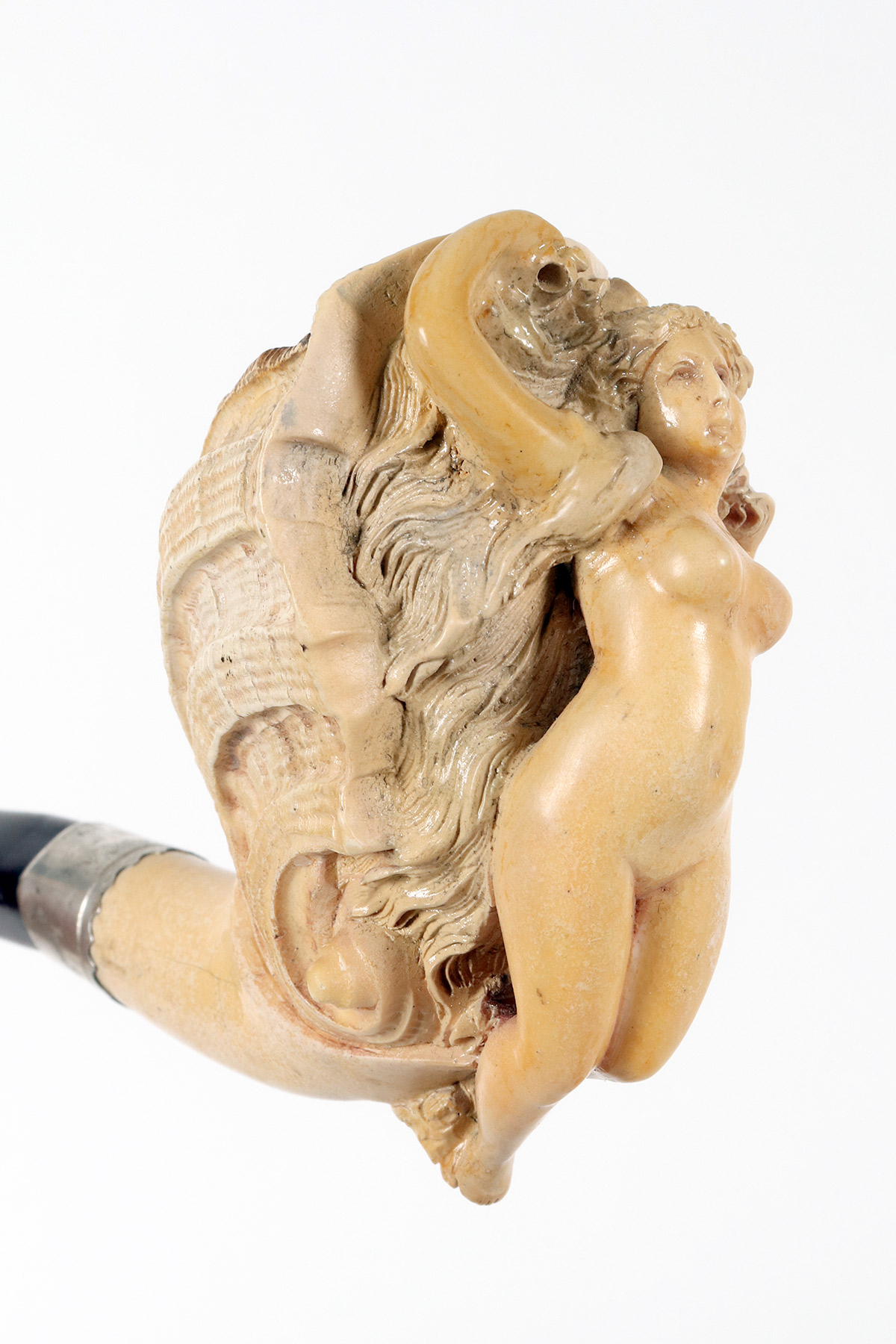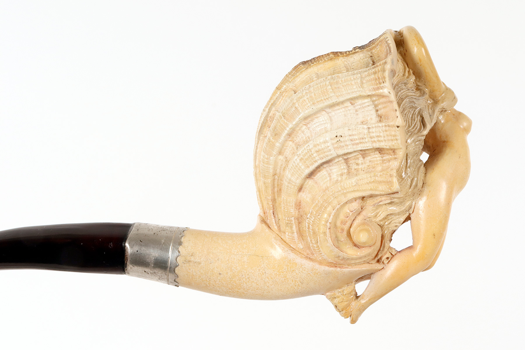 Pipe made of genuine carved meerschaum (hydrated magnesium silicate), with a genuine natural amber mouthpiece. The bowl is shaped like a shell with deep, sinuous grooves. Resting on it is the figure of a Venus, exquisitely sculpted and detailed, naturally following the curve. A silver band connects the bowl to the mouthpiece. The quality of the carving and attention to detail are excellent. Excellent patina. Austria, circa 1890