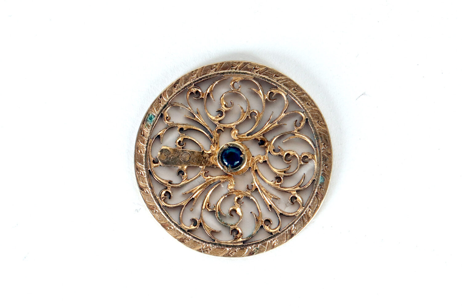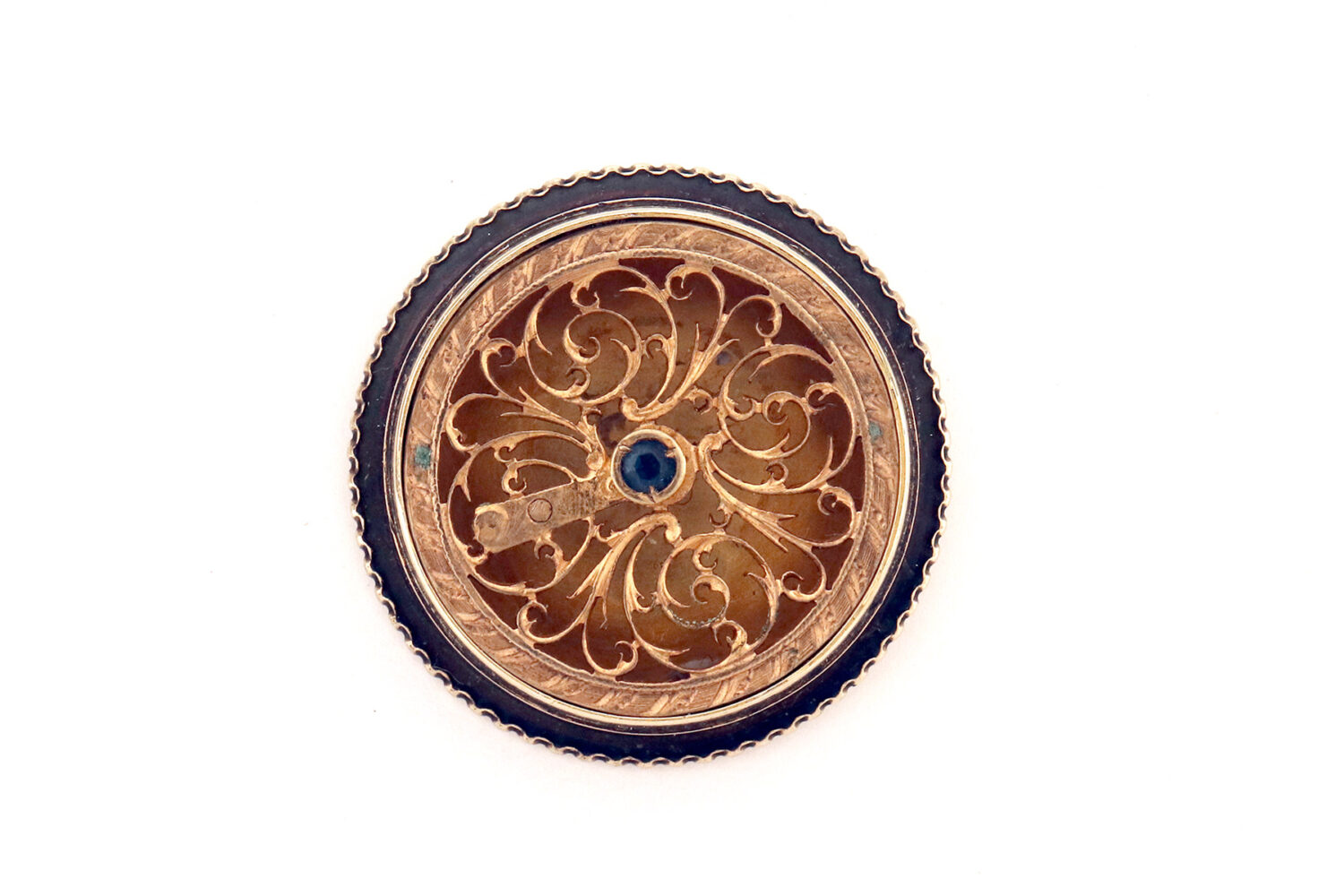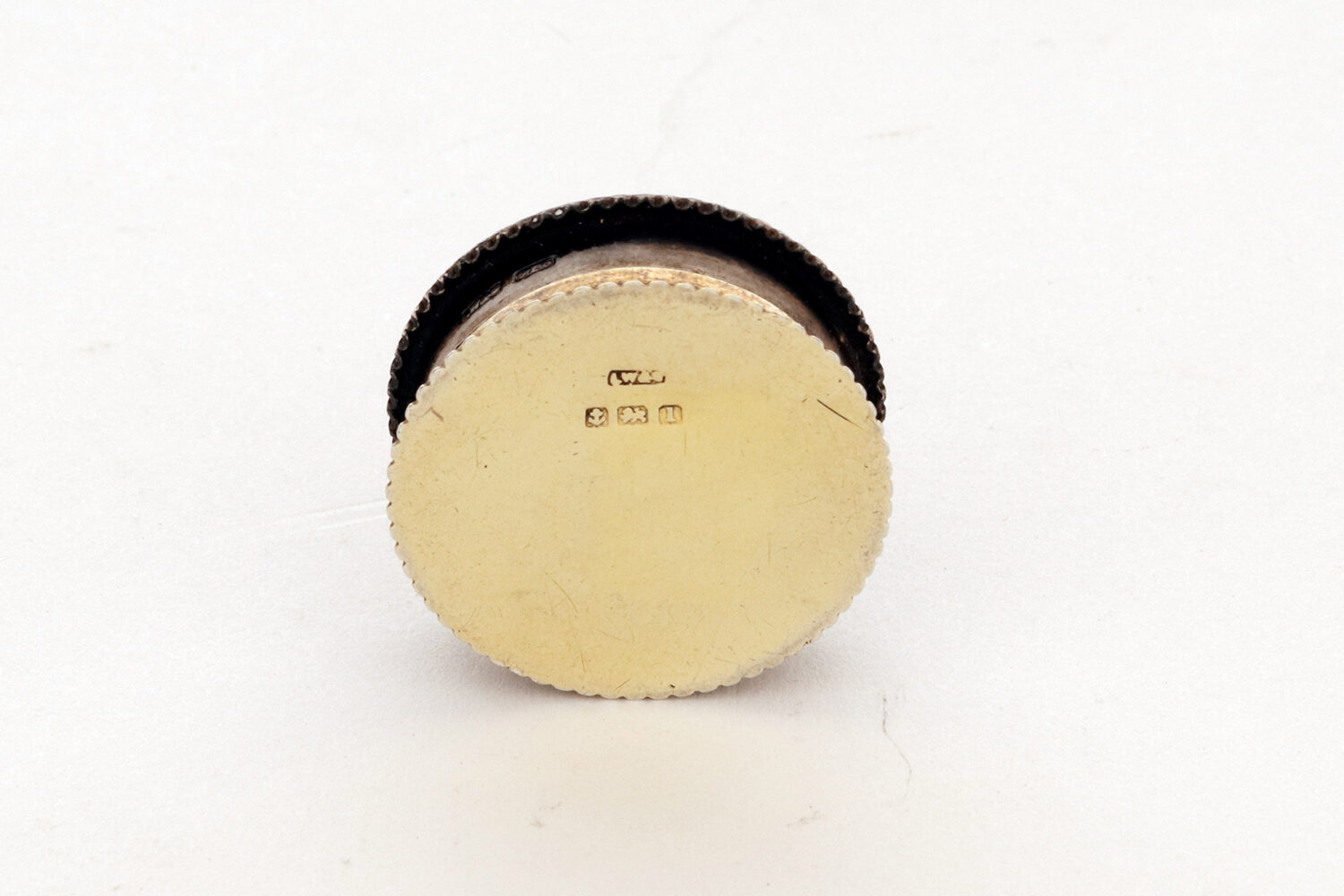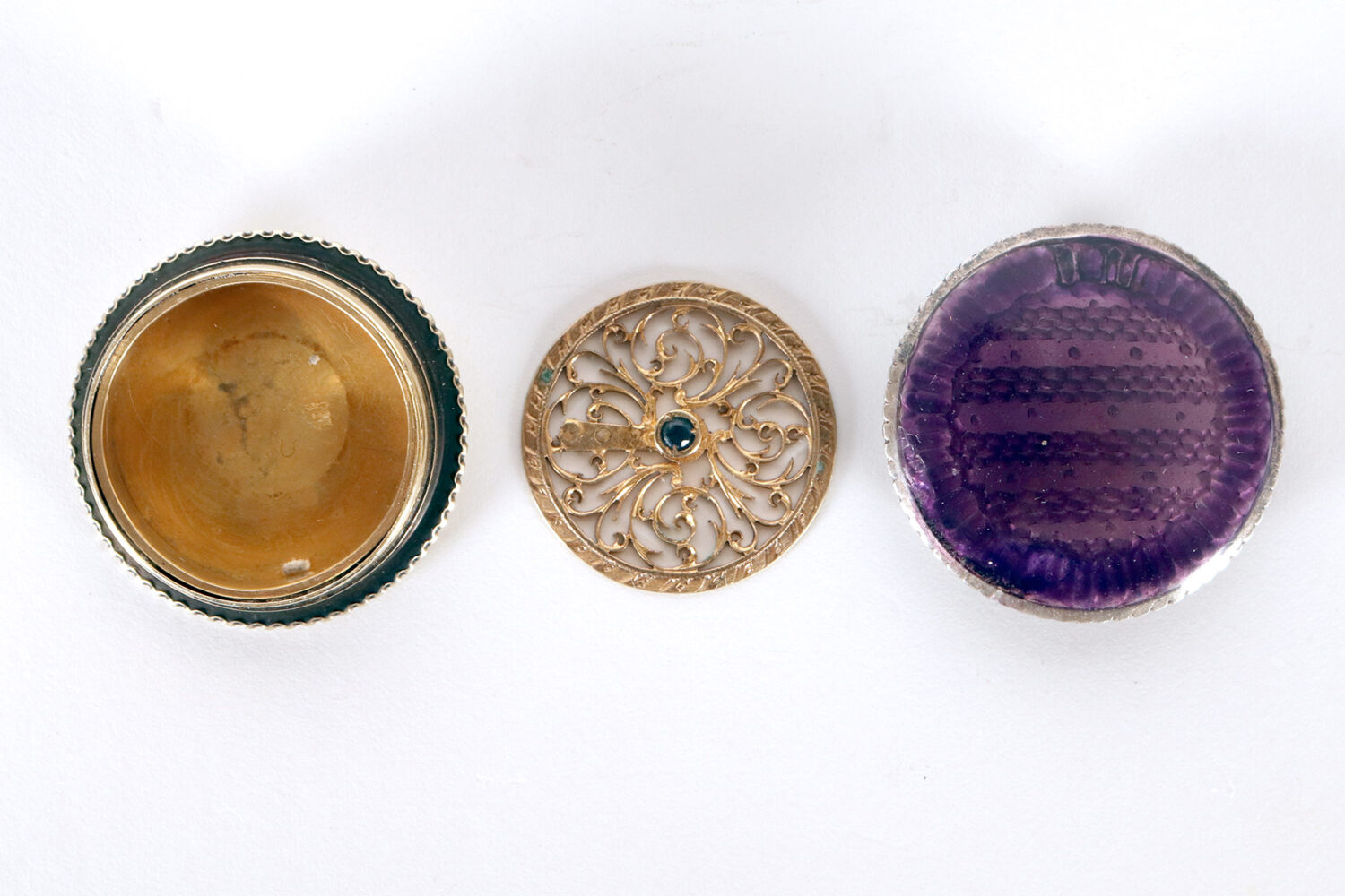 Small, round vinaigrette box made of silver and enamel. The lid is also silver, finished with a purple guilloche enamel. Inside the box is a second, perforated and engraved lid, beneath which a swab soaked in perfume or salts was placed, which ladies would sniff when they were ill. The interior is gilded, and in the center of the lid is a small sapphire, set in the english style, which allows access to the box’s interior. Birmingham, UK, 1910-11.
