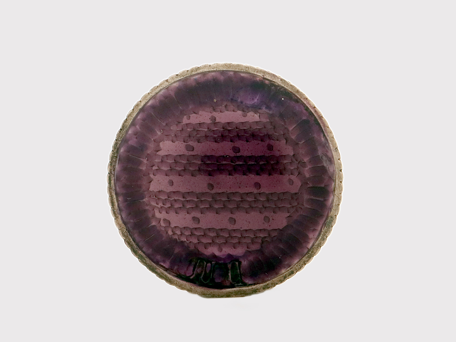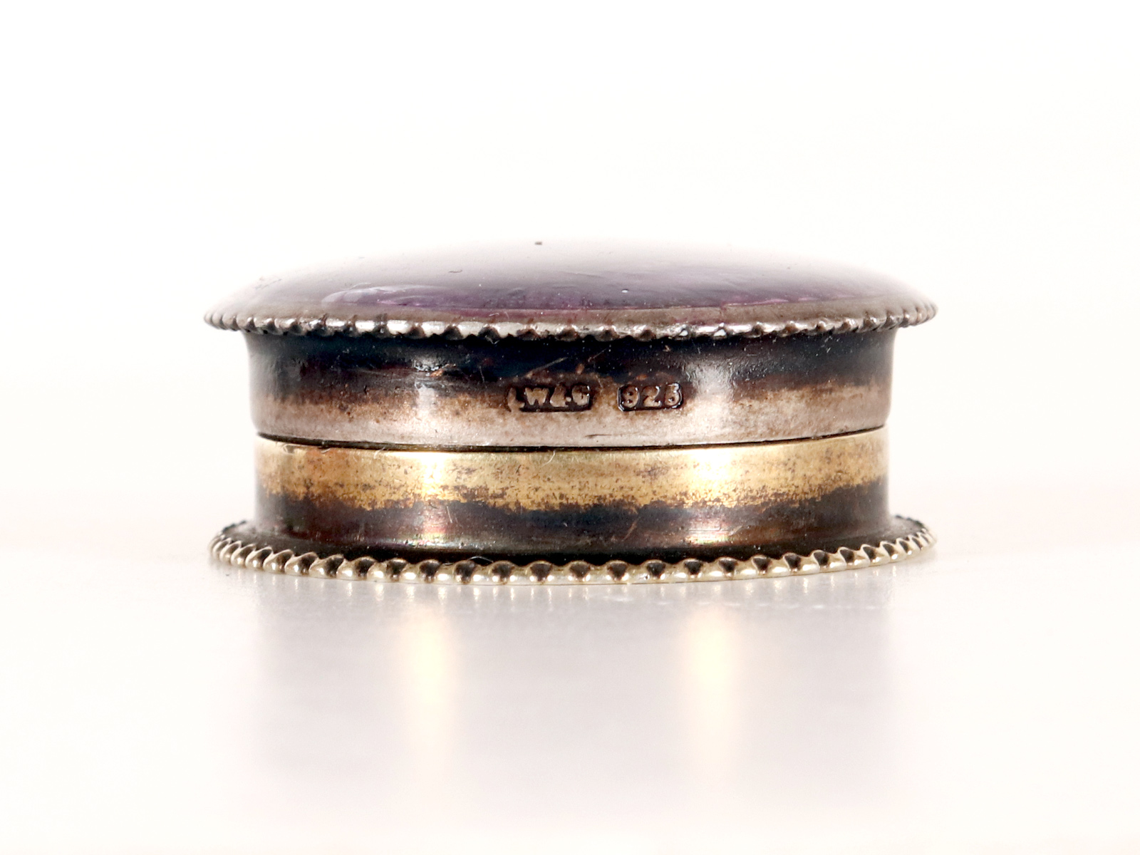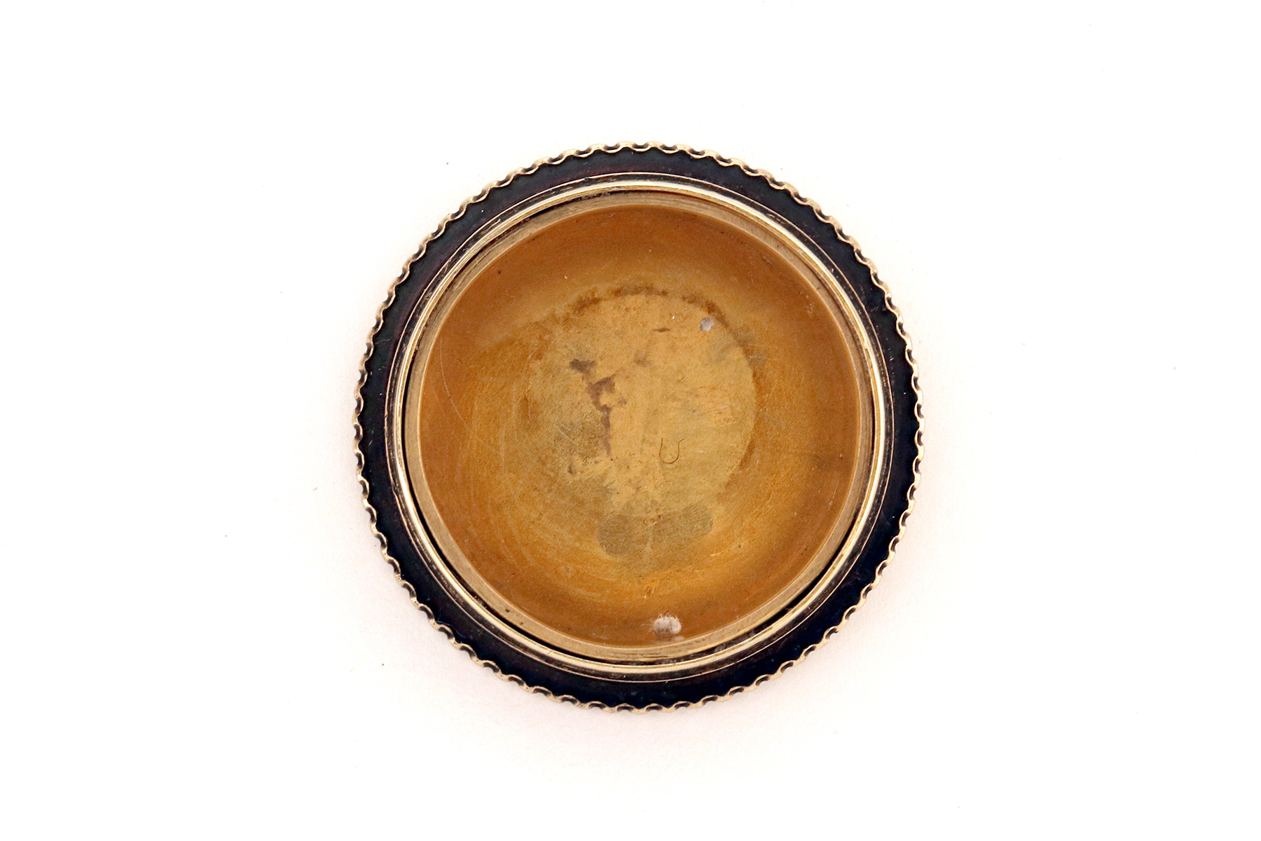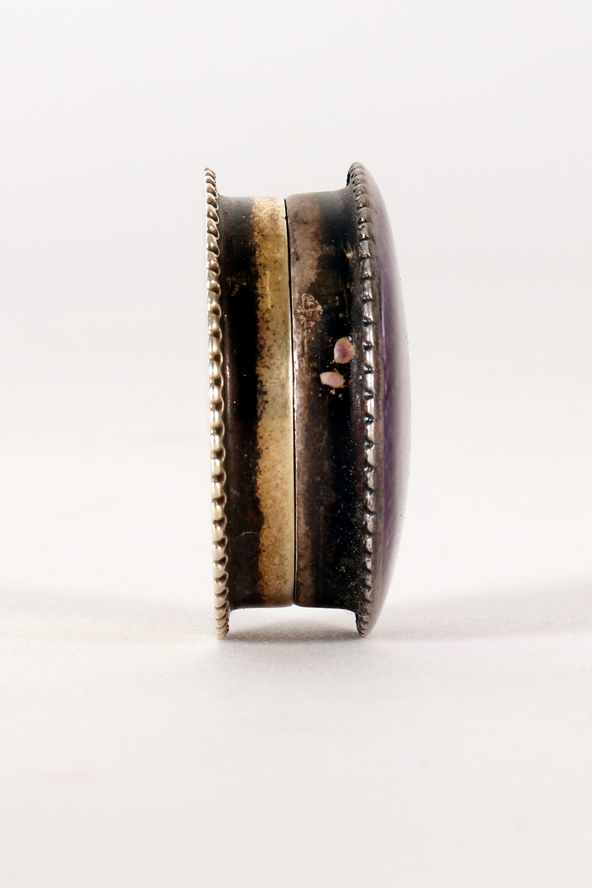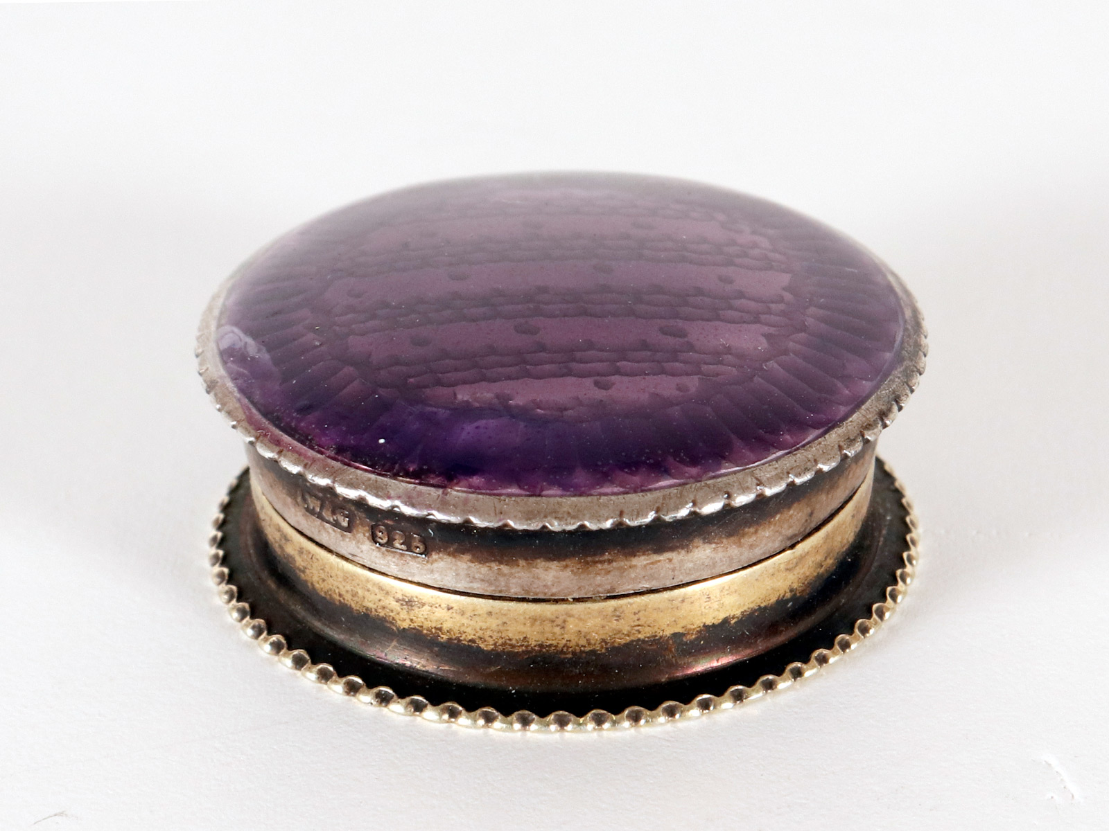 Small, round vinaigrette box made of silver and enamel. The lid is also silver, finished with a purple guilloche enamel. Inside the box is a second, perforated and engraved lid, beneath which a swab soaked in perfume or salts was placed, which ladies would sniff when they were ill. The interior is gilded, and in the center of the lid is a small sapphire, set in the english style, which allows access to the box’s interior. Birmingham, UK, 1910-11.