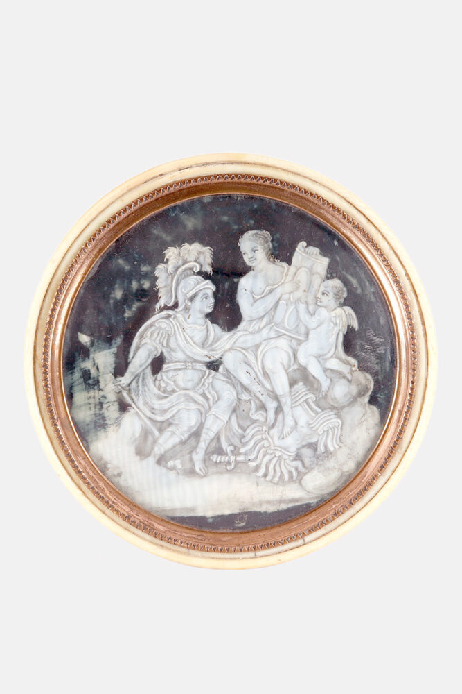 Round snuffbox, made out of gold, ivory and tortoiseshell. Purely neoclassic, the surfaces are plain. The base shows a rim round shaped. Same and symmetrical profile also on the cover. When opened, the snuffbox reveals inside the tortoiseshell veneer linin. The cover is enriched by a miniature gold framed. The miniature is realized using the grisaille technique and depicts the mythological scene of Mars in love that offer arm and armor to the beautiful Venus. Cupid completes the scene. France end of XVIII Century. Circa 1750. (SHIPPING ONLY IN EU)