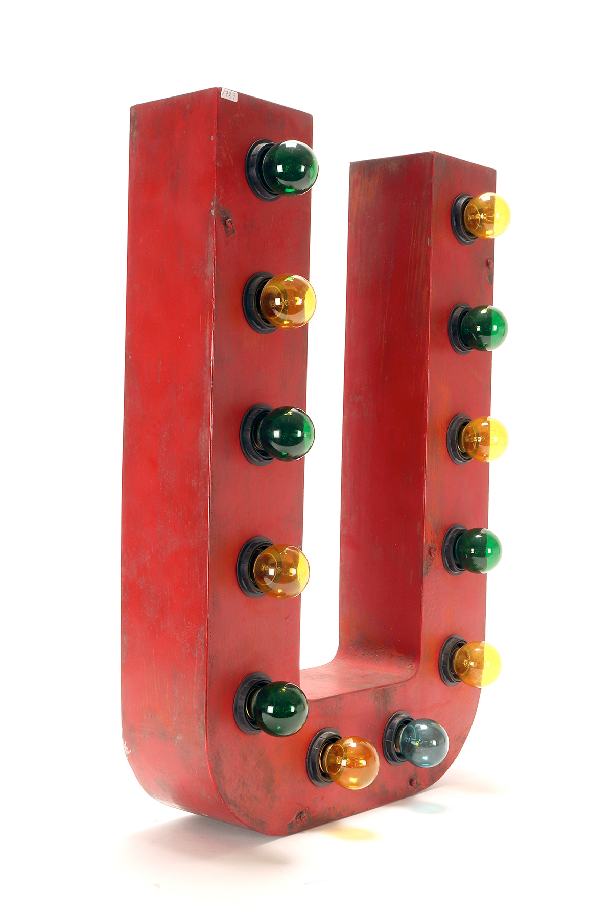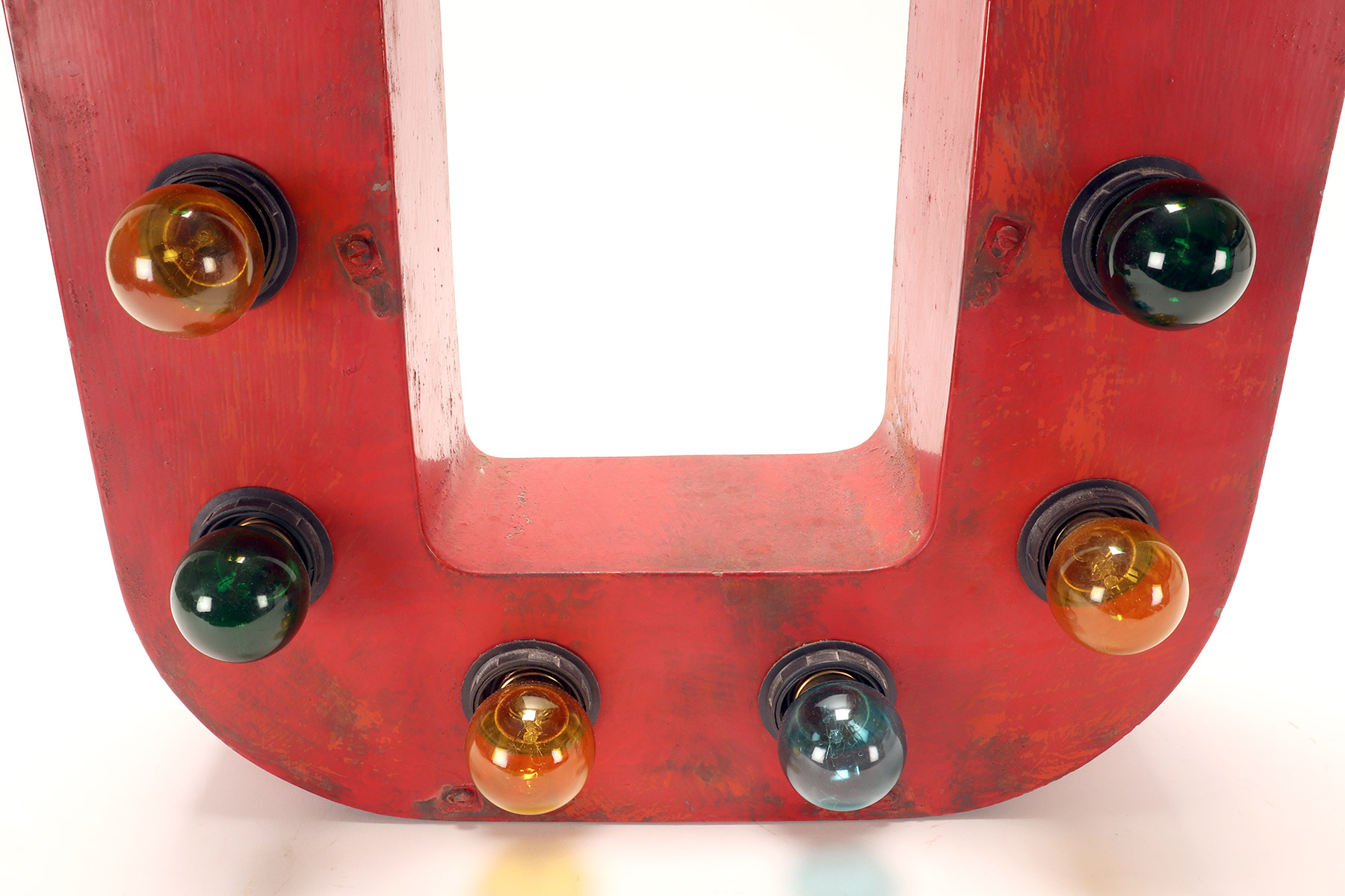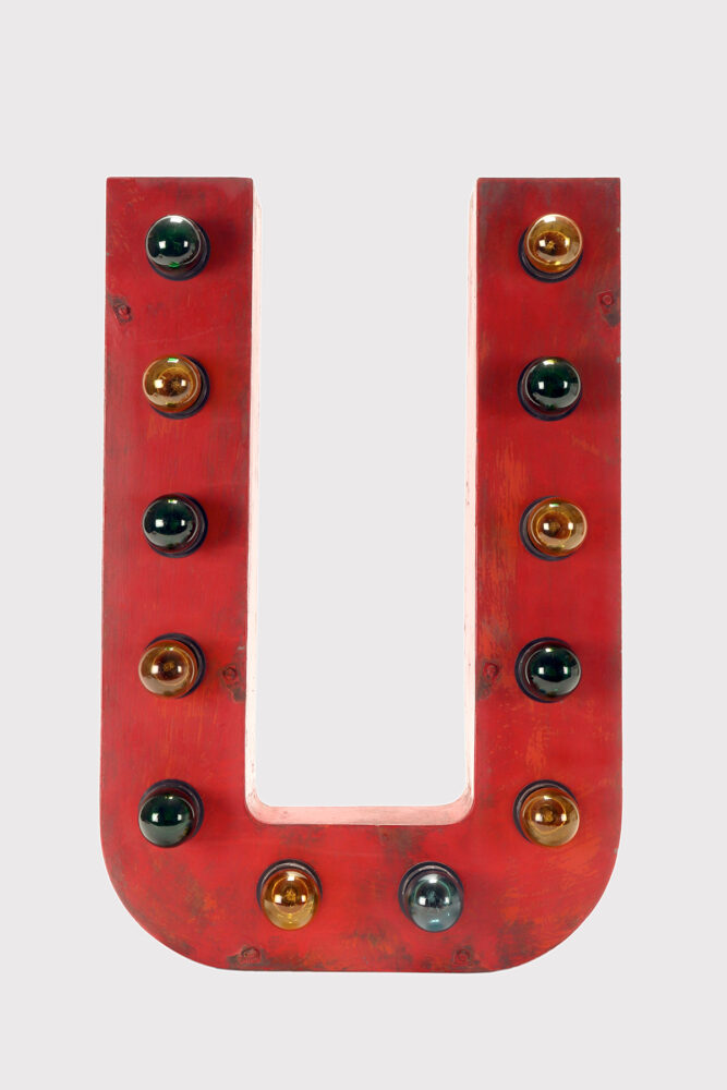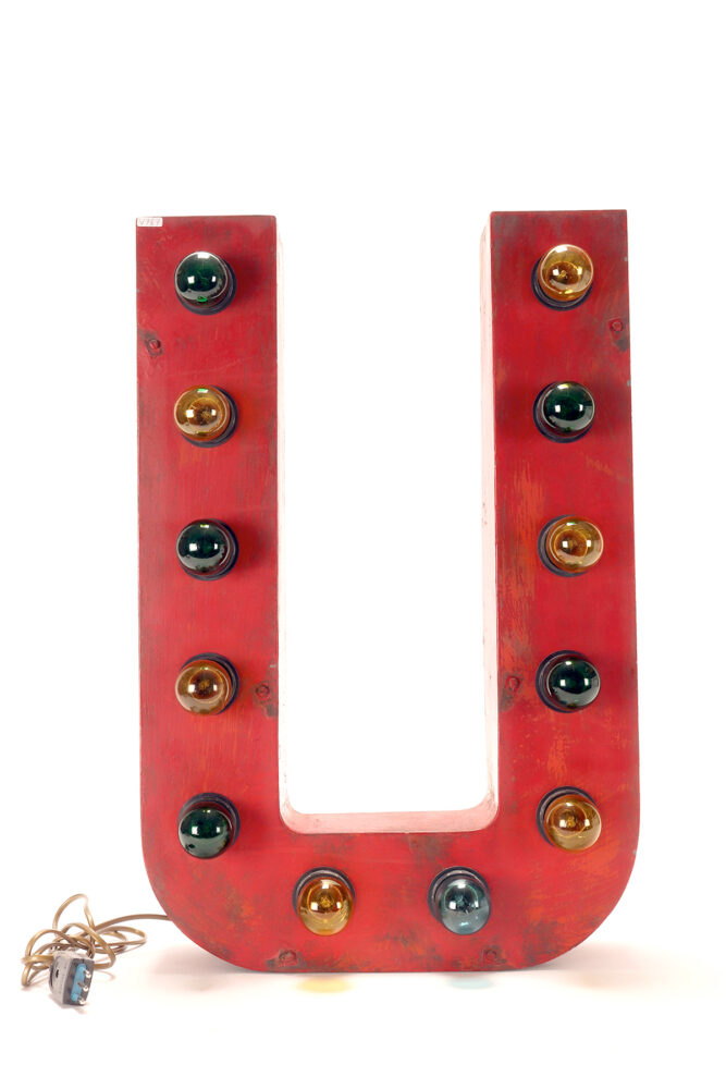 Grande lettera U in latta dipinta, colore rosso, rielettrificata illuminata con lampadine, usata come insegna di un circo. USA circa 1930.
