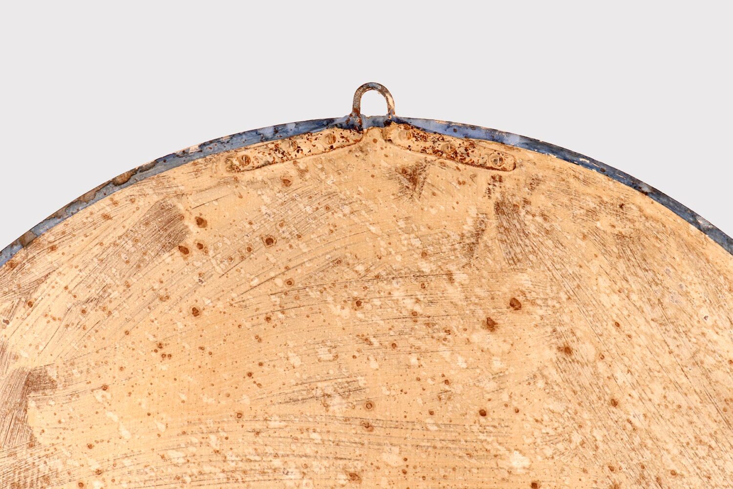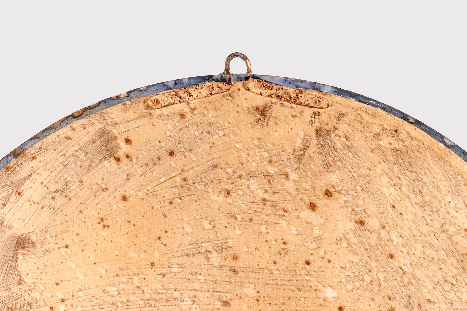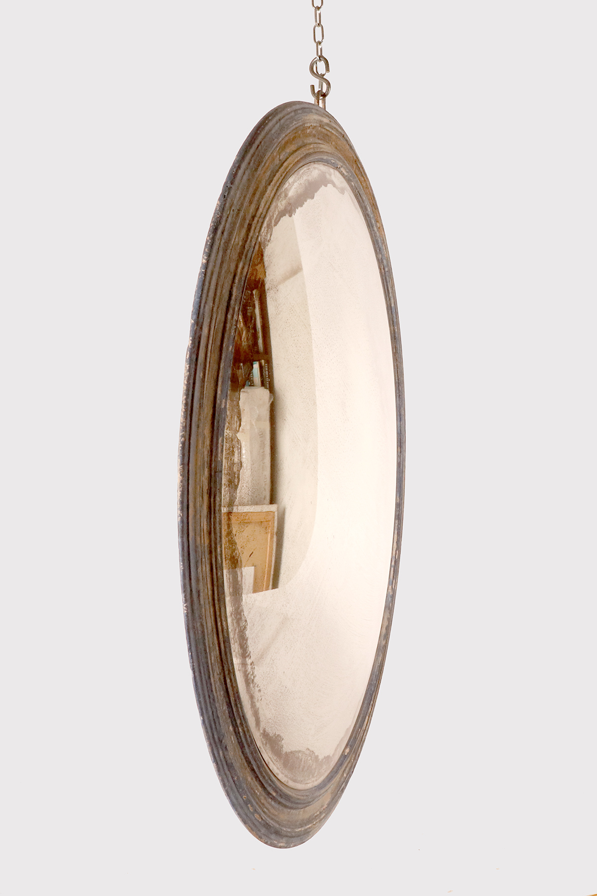 Grande specchio convesso con cornice di forma rotonda. Questi specchi convessi, erano chiamati “specchi delle streghe”, perché si credeva che avessero poteri magici, come le streghe visivamente confuse se introdotte in casa. In realtà, poste davanti a una finestra o una porta, proiettavano luce all’interno della casa. Montato con cornice intagliata di forma rotonda in legno laccato di colore azzurro. Il retro, anch’esso tornito, al centro è fissato un piccolo rosone in bronzo fuso. Alla sommità dello specchio troviamo un gancio in ferro. Italia circa 1870.