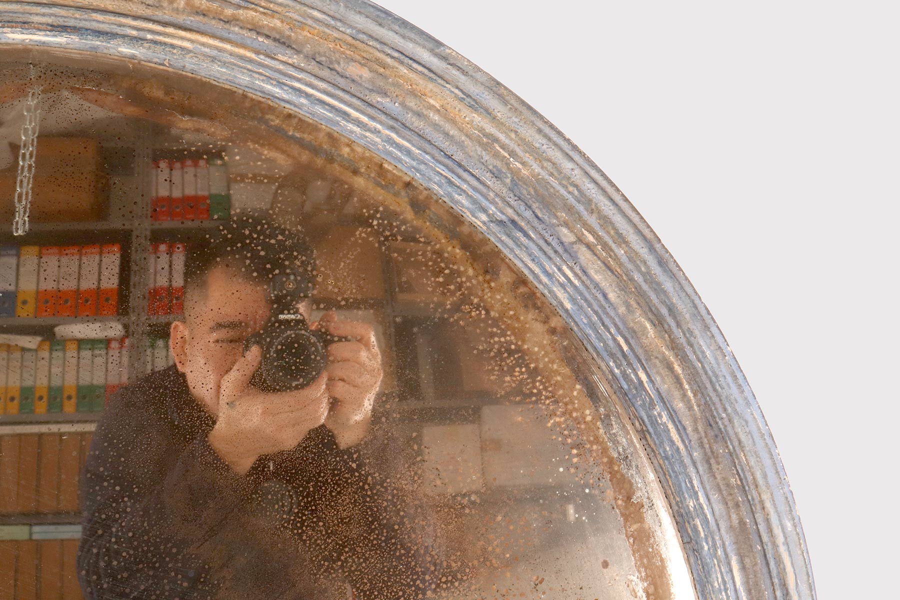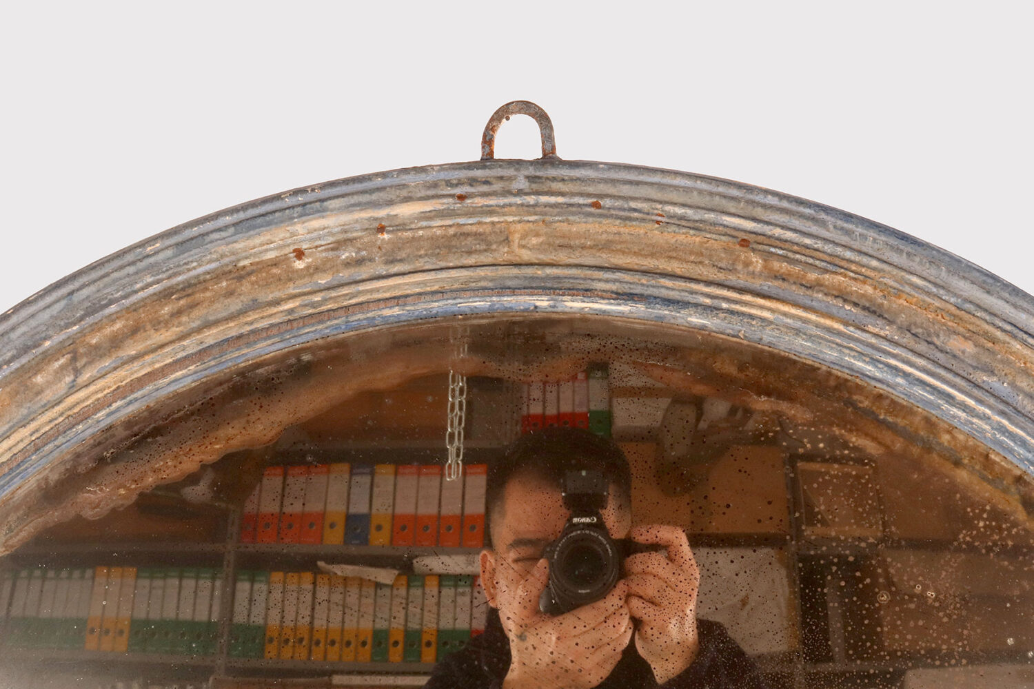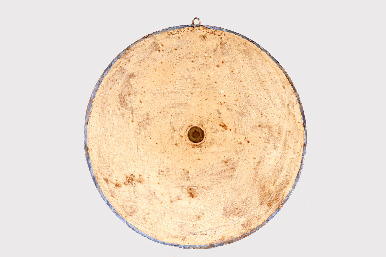 Grande specchio convesso con cornice di forma rotonda. Questi specchi convessi, erano chiamati “specchi delle streghe”, perché si credeva che avessero poteri magici, come le streghe visivamente confuse se introdotte in casa. In realtà, poste davanti a una finestra o una porta, proiettavano luce all’interno della casa. Montato con cornice intagliata di forma rotonda in legno laccato di colore azzurro. Il retro, anch’esso tornito, al centro è fissato un piccolo rosone in bronzo fuso. Alla sommità dello specchio troviamo un gancio in ferro. Italia circa 1870.