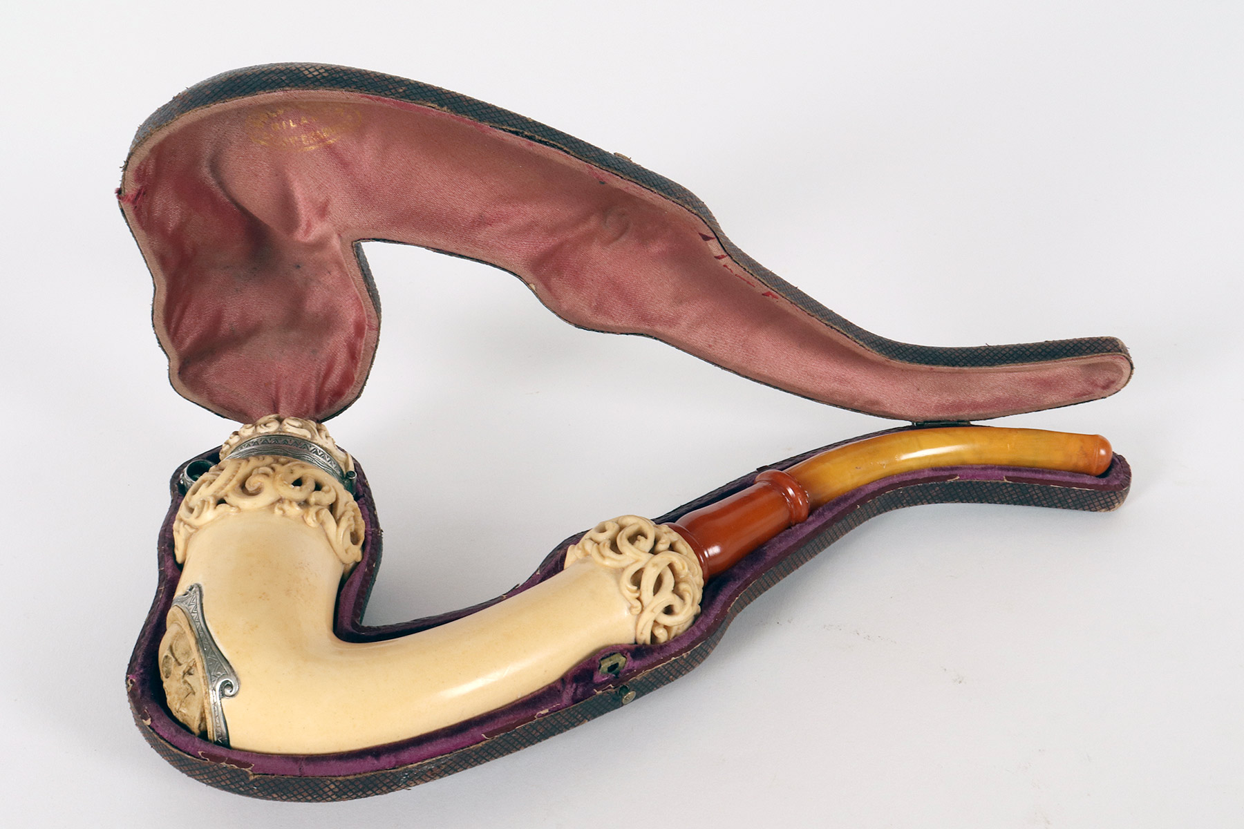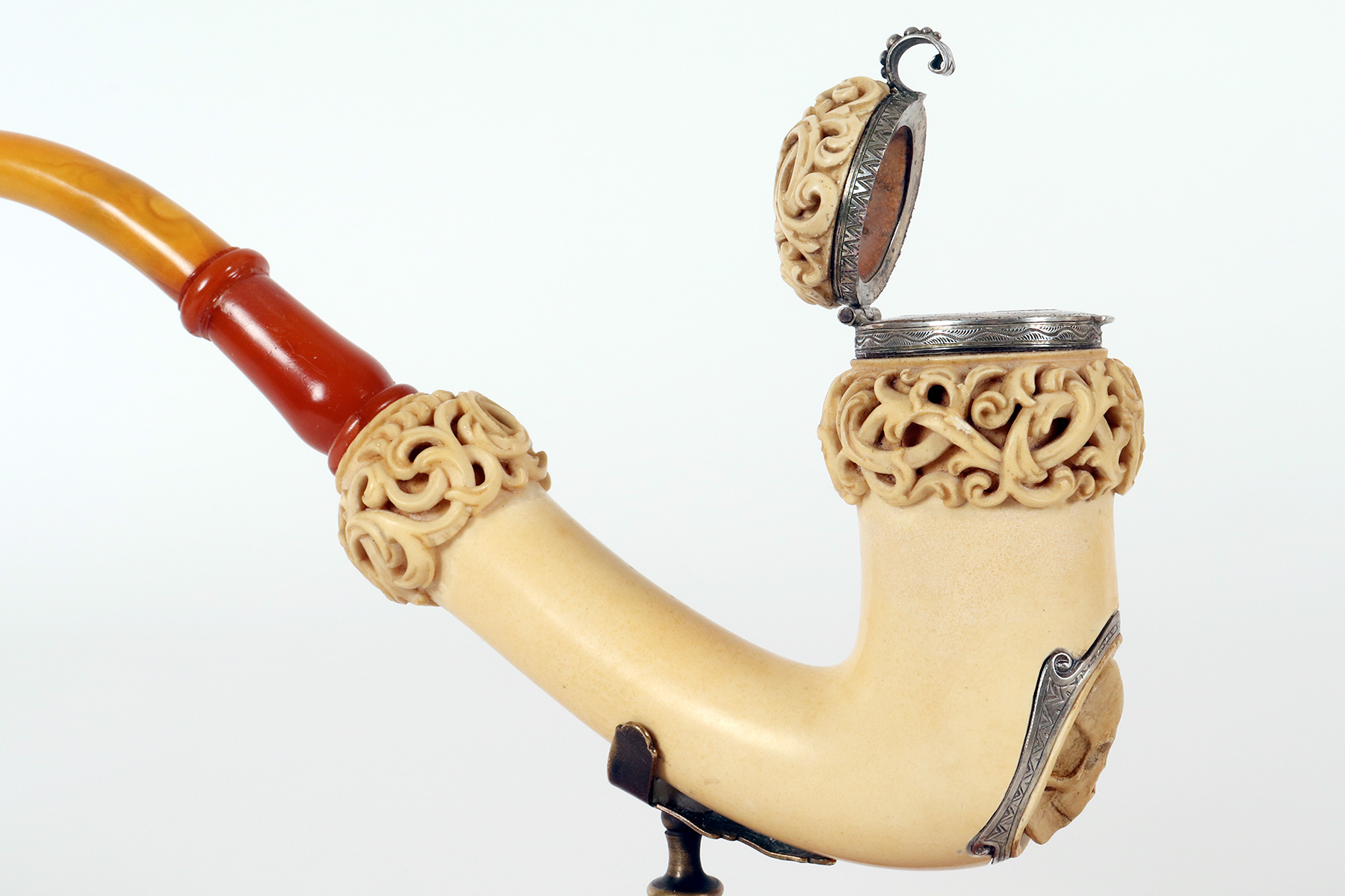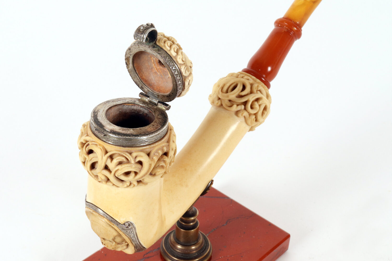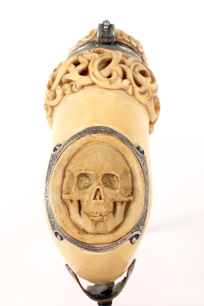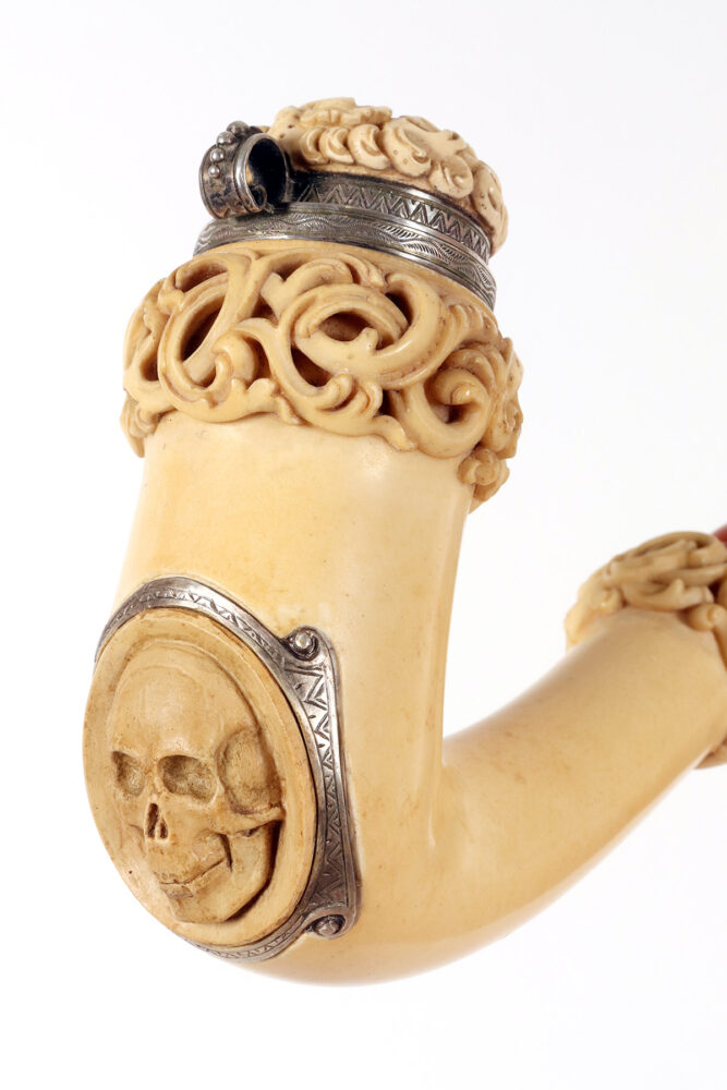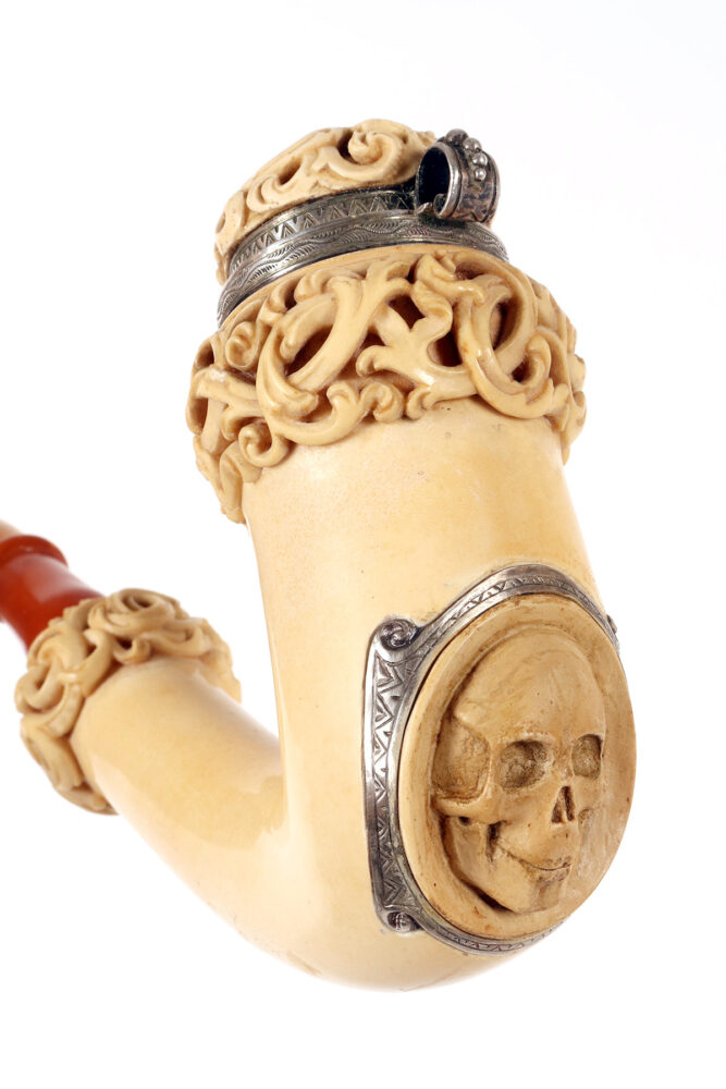 Rara e insolita grossa pipa raffigurante una Vanitas-Memento Mori, realizzata in vera schiuma di mare intagliata, argento con bocchino in vera ambra. Nel grosso fornello della pipa, in schiuma di mare liscia, si trova un coperchio in schiuma intagliato, collegato con un anello con cerniera in argento 900/1000. Lungo la superfice del fornello della pipa, una lastra d’argento traforata ed incisa, raffigura una Vanitas. La pipa veniva fumata con il coperchio chiuso e il fumo fuoriusciva dal foro centrale del coperchio, anch’esso realizzato in argento. Astuccio originale in legno, rivestito in pelle. Rivenditore Goldfinger, Galleria vittorio Emanuele, Milano, Italia. Vienna, Austria fine XIX secolo.