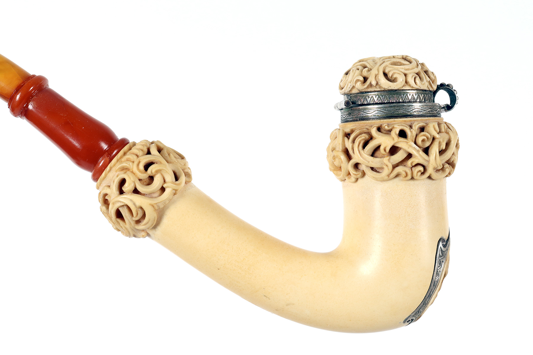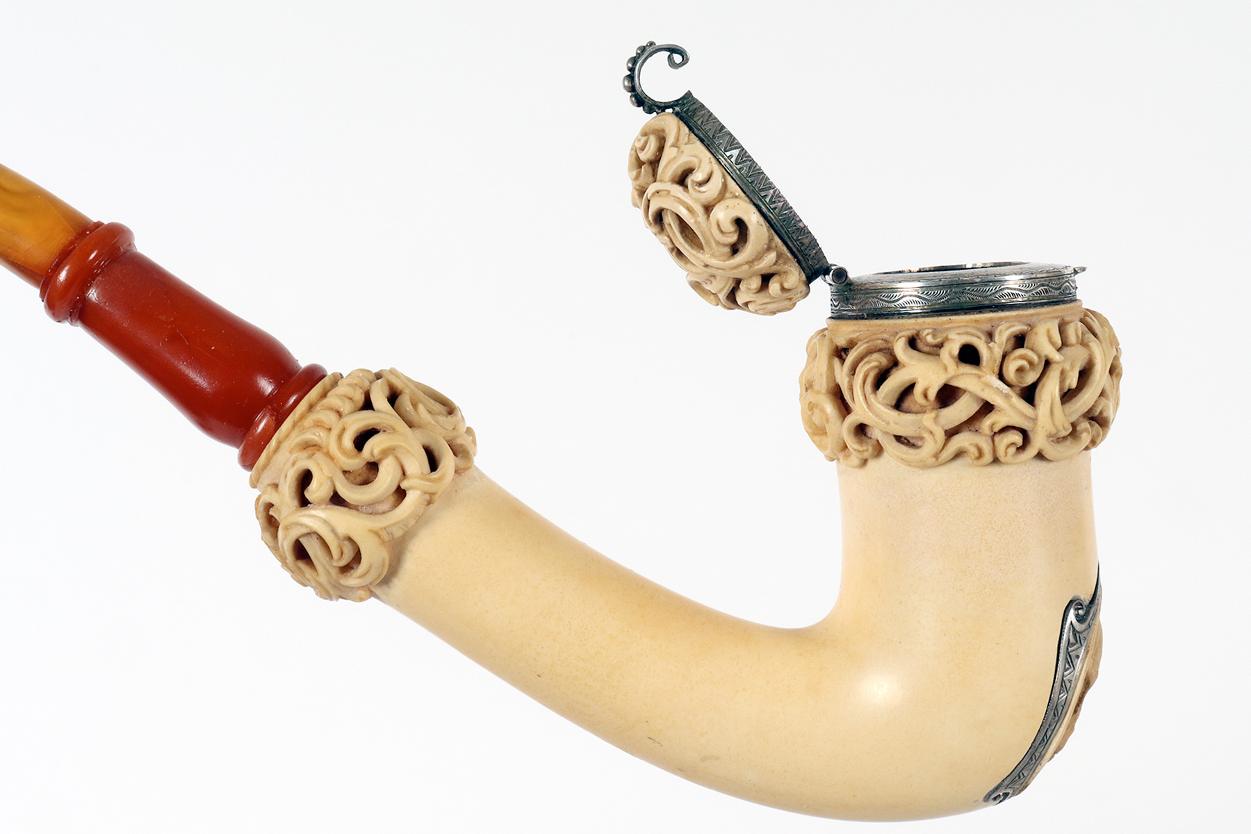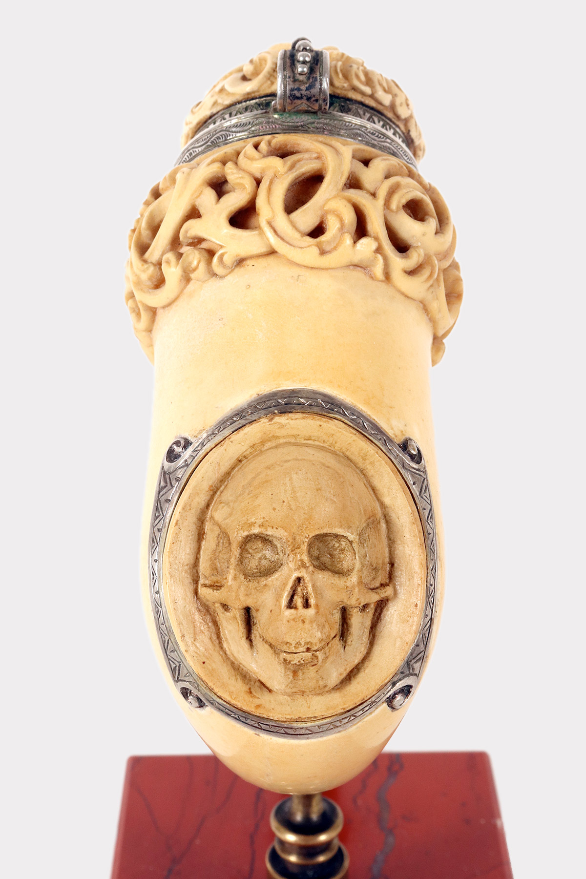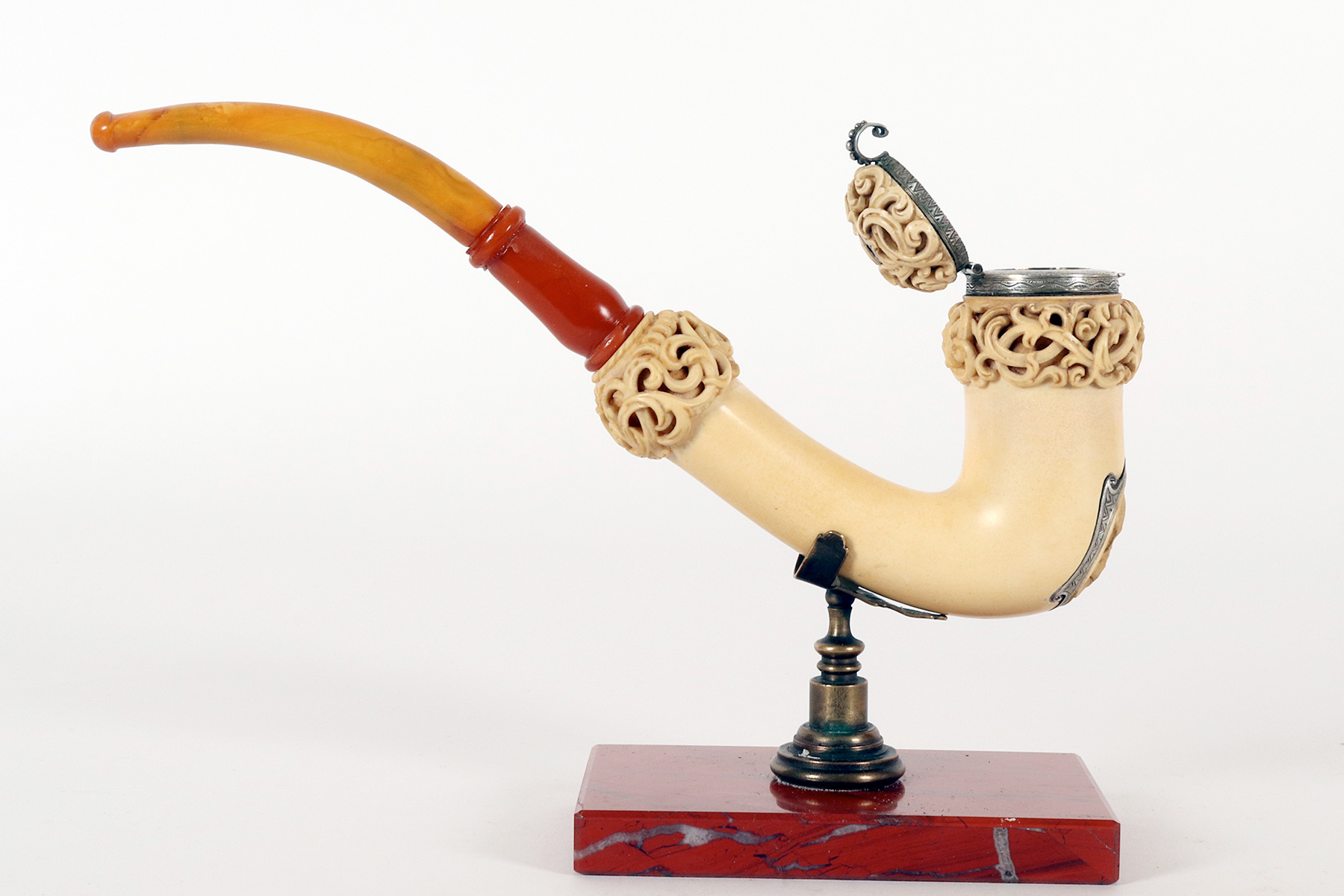 Rara e insolita grossa pipa raffigurante una Vanitas-Memento Mori, realizzata in vera schiuma di mare intagliata, argento con bocchino in vera ambra. Nel grosso fornello della pipa, in schiuma di mare liscia, si trova un coperchio in schiuma intagliato, collegato con un anello con cerniera in argento 900/1000. Lungo la superfice del fornello della pipa, una lastra d’argento traforata ed incisa, raffigura una Vanitas. La pipa veniva fumata con il coperchio chiuso e il fumo fuoriusciva dal foro centrale del coperchio, anch’esso realizzato in argento. Astuccio originale in legno, rivestito in pelle. Rivenditore Goldfinger, Galleria vittorio Emanuele, Milano, Italia. Vienna, Austria fine XIX secolo.