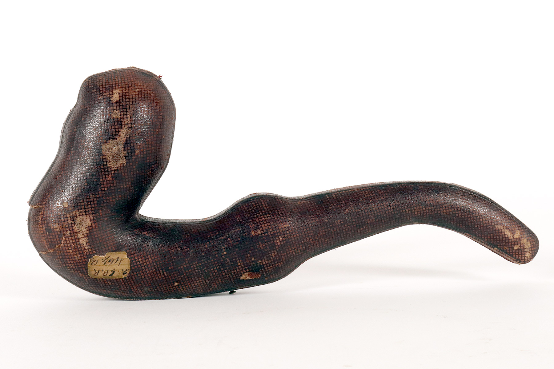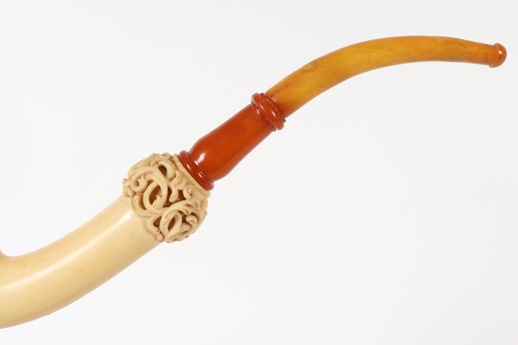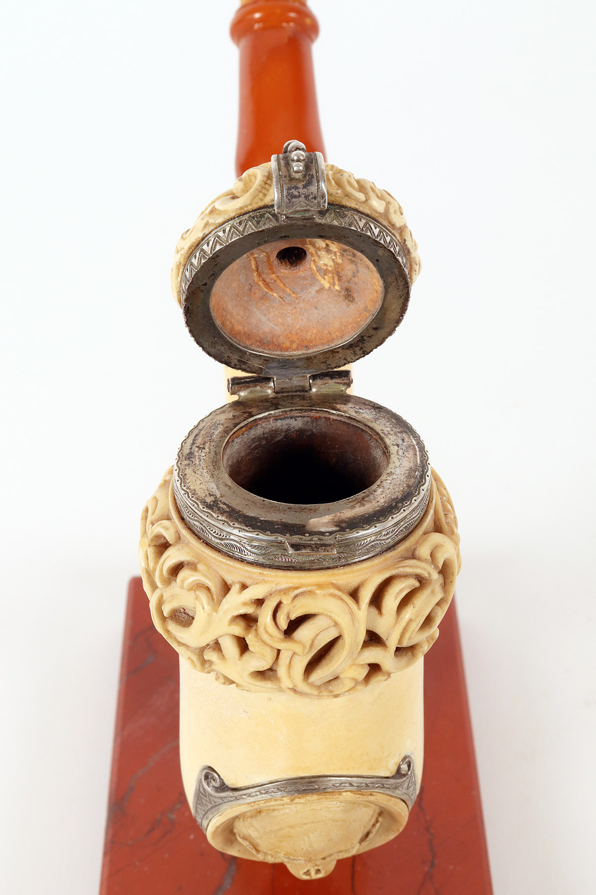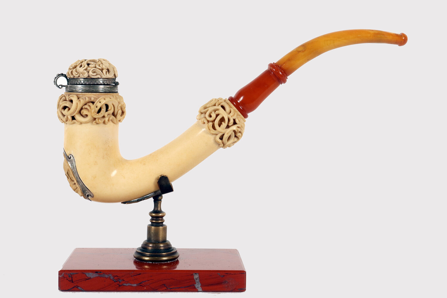 Rara e insolita grossa pipa raffigurante una Vanitas-Memento Mori, realizzata in vera schiuma di mare intagliata, argento con bocchino in vera ambra. Nel grosso fornello della pipa, in schiuma di mare liscia, si trova un coperchio in schiuma intagliato, collegato con un anello con cerniera in argento 900/1000. Lungo la superfice del fornello della pipa, una lastra d’argento traforata ed incisa, raffigura una Vanitas. La pipa veniva fumata con il coperchio chiuso e il fumo fuoriusciva dal foro centrale del coperchio, anch’esso realizzato in argento. Astuccio originale in legno, rivestito in pelle. Rivenditore Goldfinger, Galleria vittorio Emanuele, Milano, Italia. Vienna, Austria fine XIX secolo.