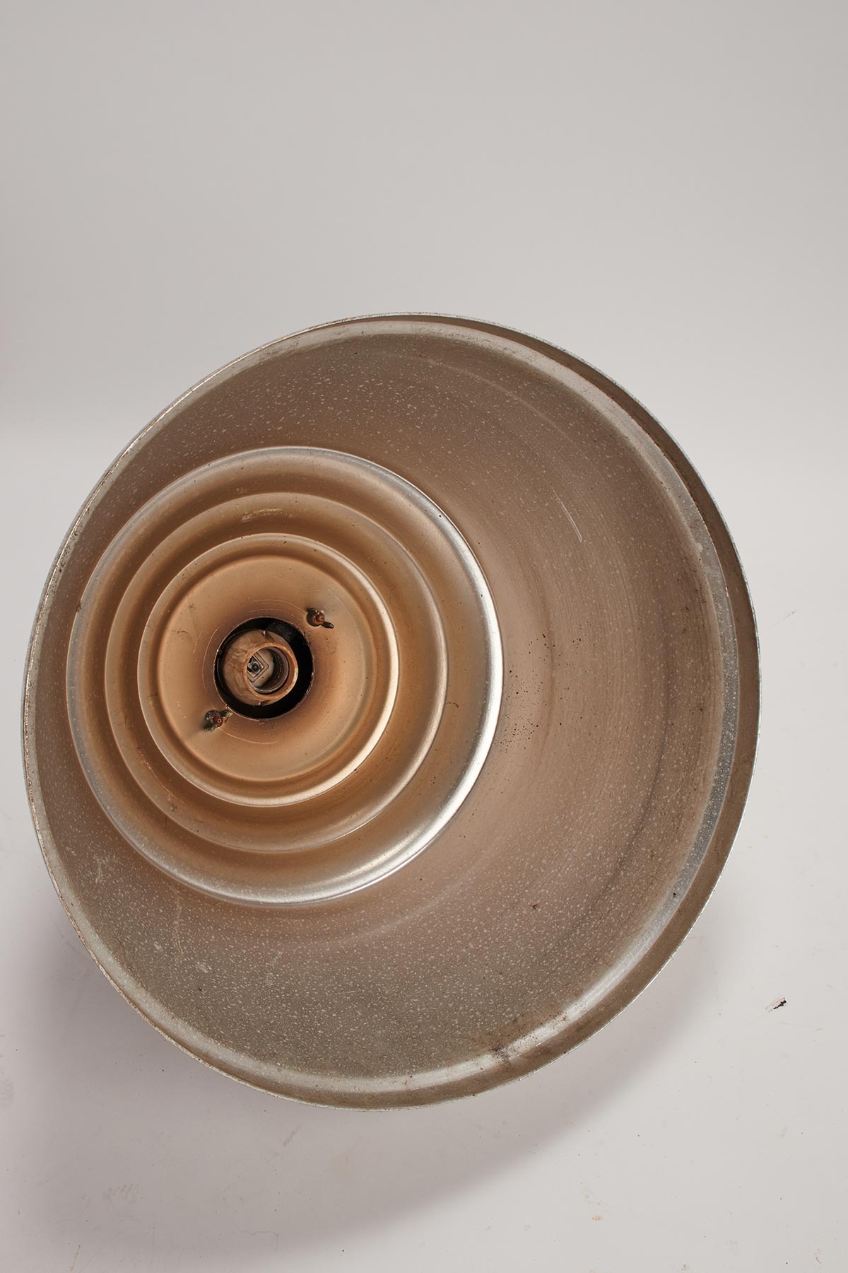 A Group of swinging industrial lamps, green enamel over aluminum dome. Iron hanging hook, porcelain wheel metal wire. Sold also separately. Italy 1920 ca.