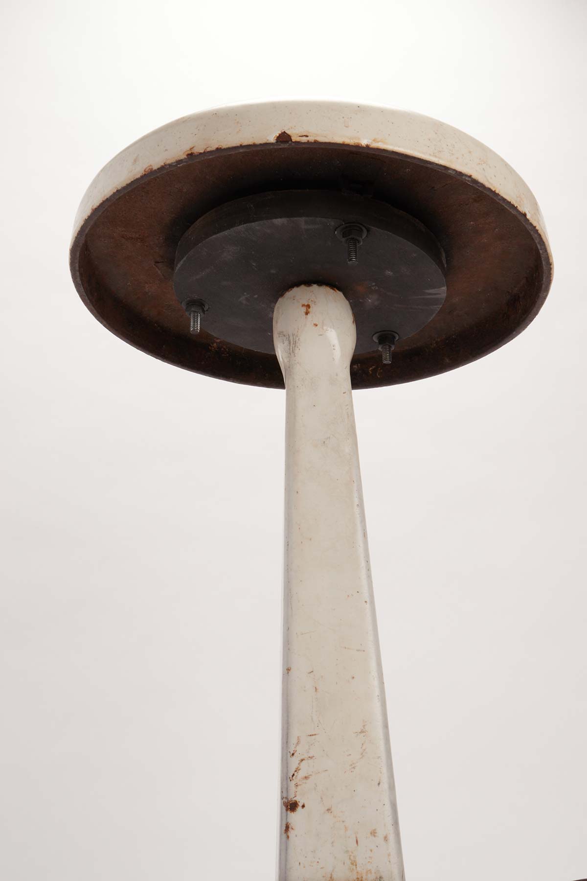 Gruppo di 4 gabelli in metallo smaltato di colore bianco e ottone, dotati di poggia piedi per uso bistrot industriale. Stati Uniti di America 1930 ca.