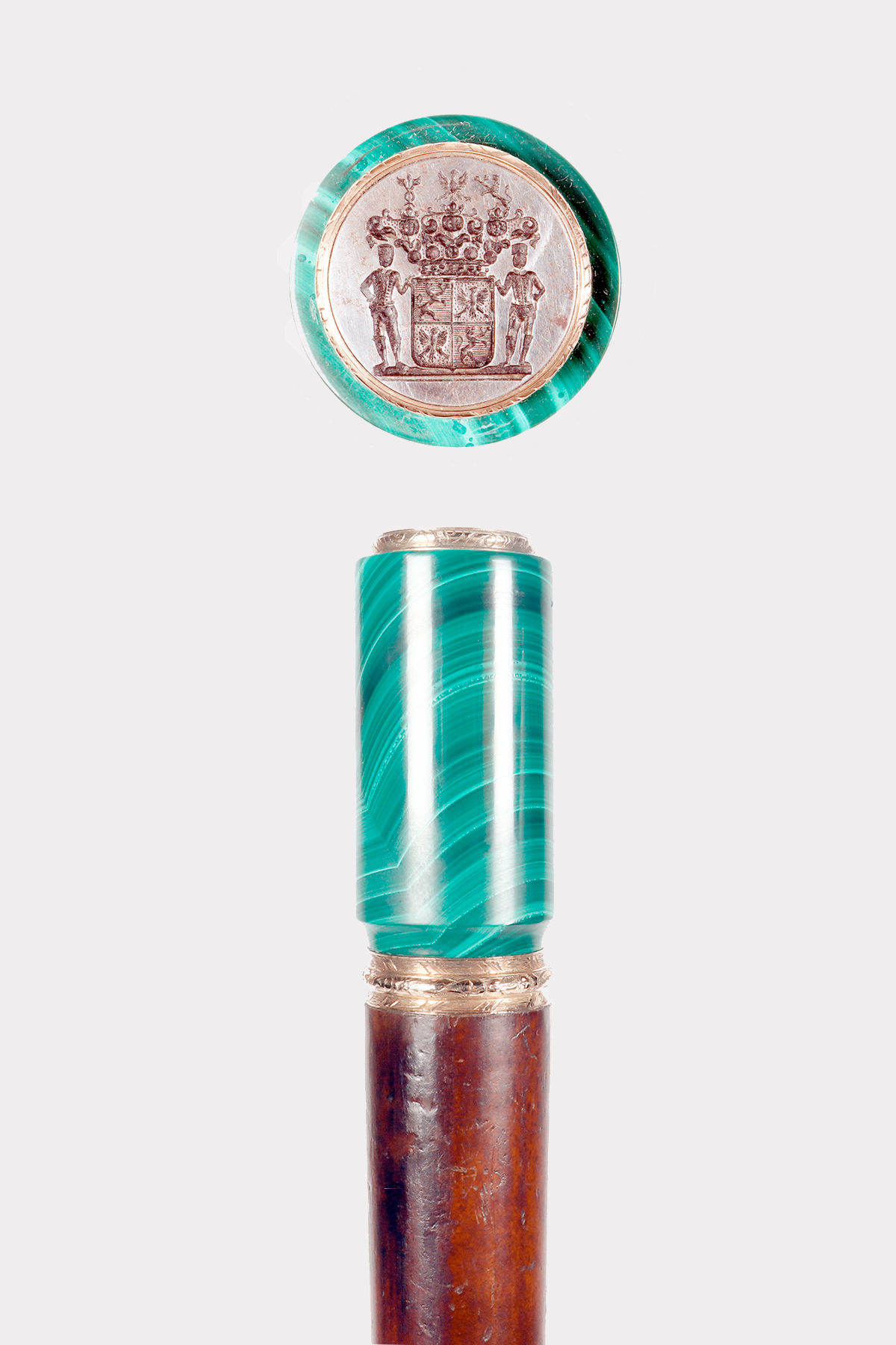 Walking stick: jeweled stick, milord-shaped knob with gold band and malachite cylinder with iron noble seal. Malacca wood barrel with 18K gold eyelets for wrist cord. Horne ferrule. Signed Gabriel Falguieres.
