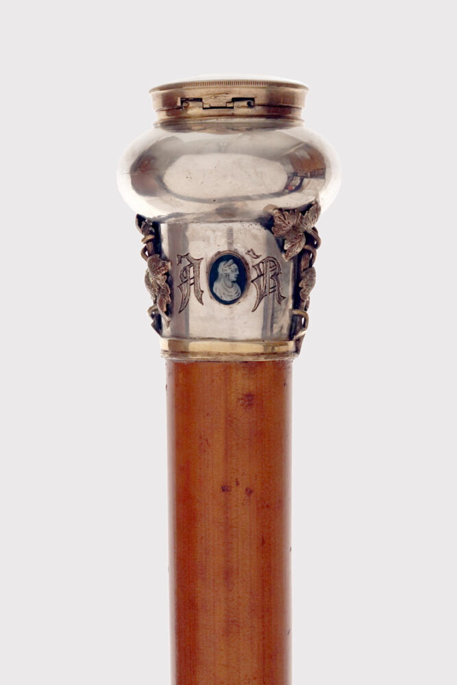 A jeweled walking stick made of silver and gold, designed and crafted by François-Désiré Froment-Meurice. The pommel features a French-made clock with exposed balance wheel, enclosed in a gold band. The lower band features two oval-shaped cameos in two-layered agate, carved with a white effigy on a black background, depicting the profile of a neoclassical woman’s face and leaves embossed and engraved in yellow and green gold. The band also features an engraved monogram with two letters A and R, as well as the date 1849. Rattan cane, metal ferrule. Signed Froment-Meurice. Froment-Meurice (1802–1855) was one of France’s most eminent and esteemed jewelers, creating much of his work in the neoclassical, neo-Renaissance, and neo-Gothic styles. In 1844, he was awarded the honorary title of official goldsmith and jeweler of the City of Paris. He was succeeded by his talented son Émile (1839–1913), who also received recognition, including, in 1869, the Legion of Honor for his participation in the 1867 Universal Exhibition. France, circa 1849.