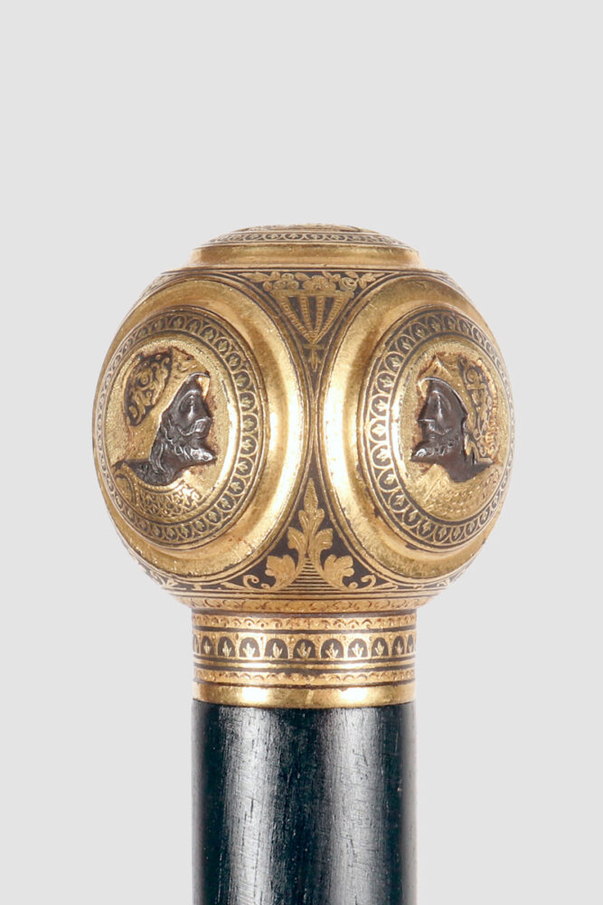 Walking stick: jewel walking stick, round iron knob, with engraved gold parts, depicting 5 cameos. Macassar wood cane. Brass and iron ferrule. Russia circa 1880.