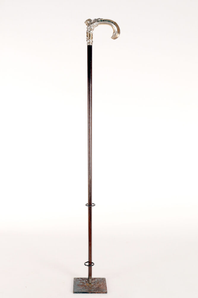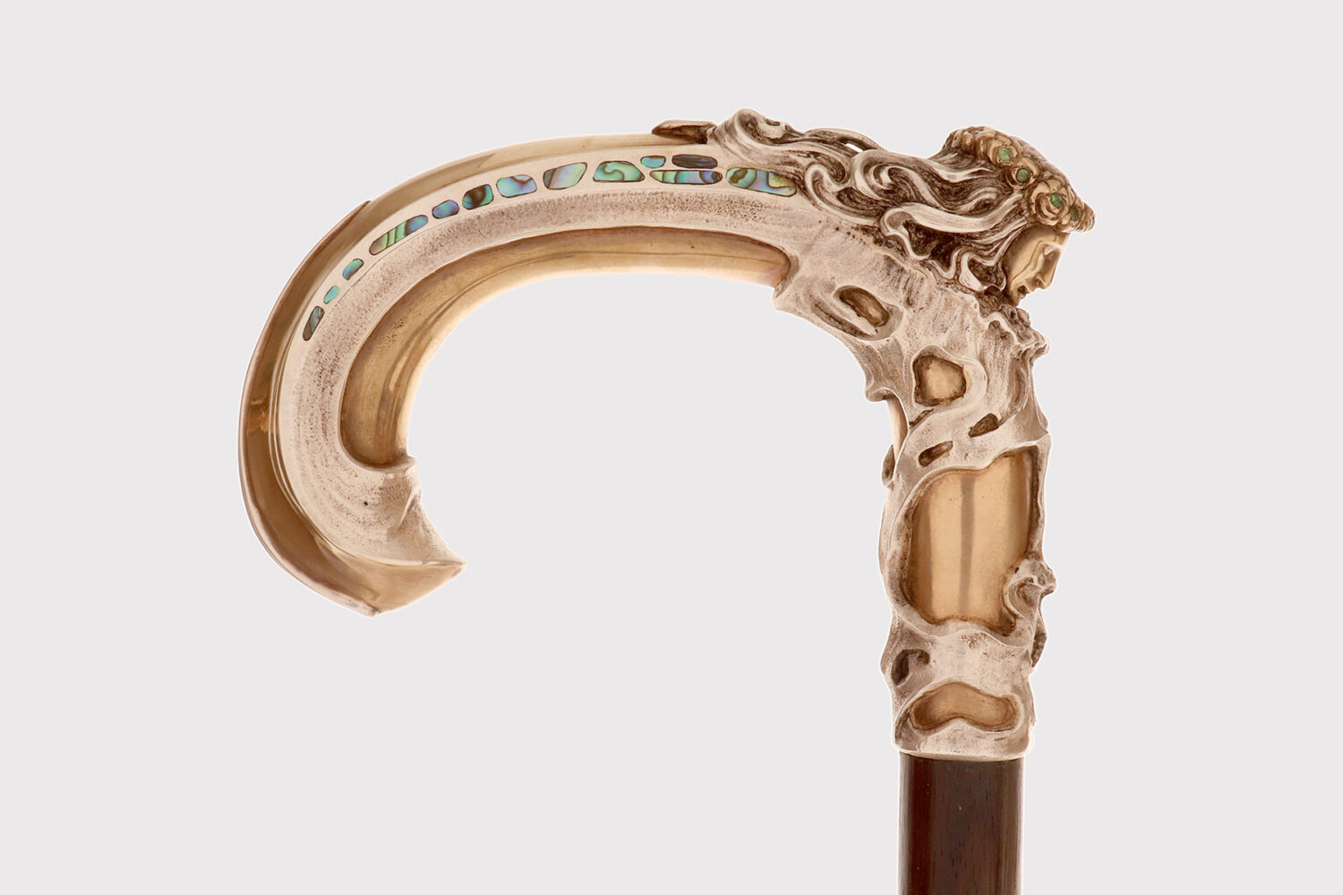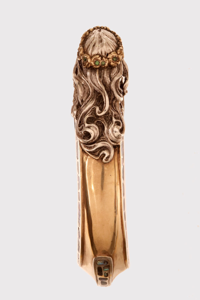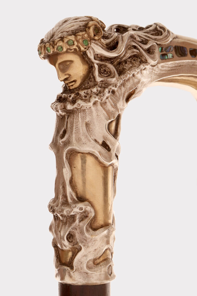 Art Nouveau walking stick: curved handle, designed and crafted by Leopoldo Janesich, in silver with gilded reliefs. An imposing and deeply carved stick. Thick ribbons in pure Art Nouveau style cover the first part of the handle, from the shaft to the end of the stick. At the center, on the curved part of the handle, is a finely carved woman’s face, with long hair and a crown of roses flowers with faceted emeralds in the center, from which two long wings emerge, resembling a cicada. Small pieces of paua mother-of-pearl (sea opal) are embedded along the wings. The cane is made of ebony wood with a metal ferrule. Signed Leopold Janesich, Trieste, Austro-Hungarian Empire, early 1900s. Originally from Dalmatia, Leopold Janesich (1802–1880) founded his business in 1835 in prosperous Trieste, then part of the Austro-Hungarian Empire, on the Adriatic Sea. Janesich created high-quality jewelry and silverware for a distinguished clientele, and his choice of Trieste made his luxury products accessible to the European affluent. Upon his death, his son Giovanni (1826–1927) took over the business and opened a branch in Paris in 1900, continuing to run the Trieste business. The house collaborated with leading jewelers such as Bulgari, Maison Vever, Boucheron, Chaumet, and Daum.