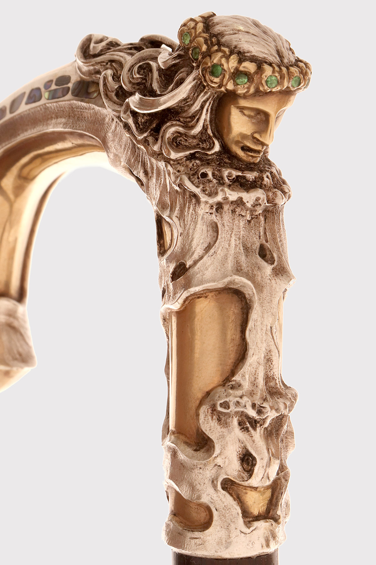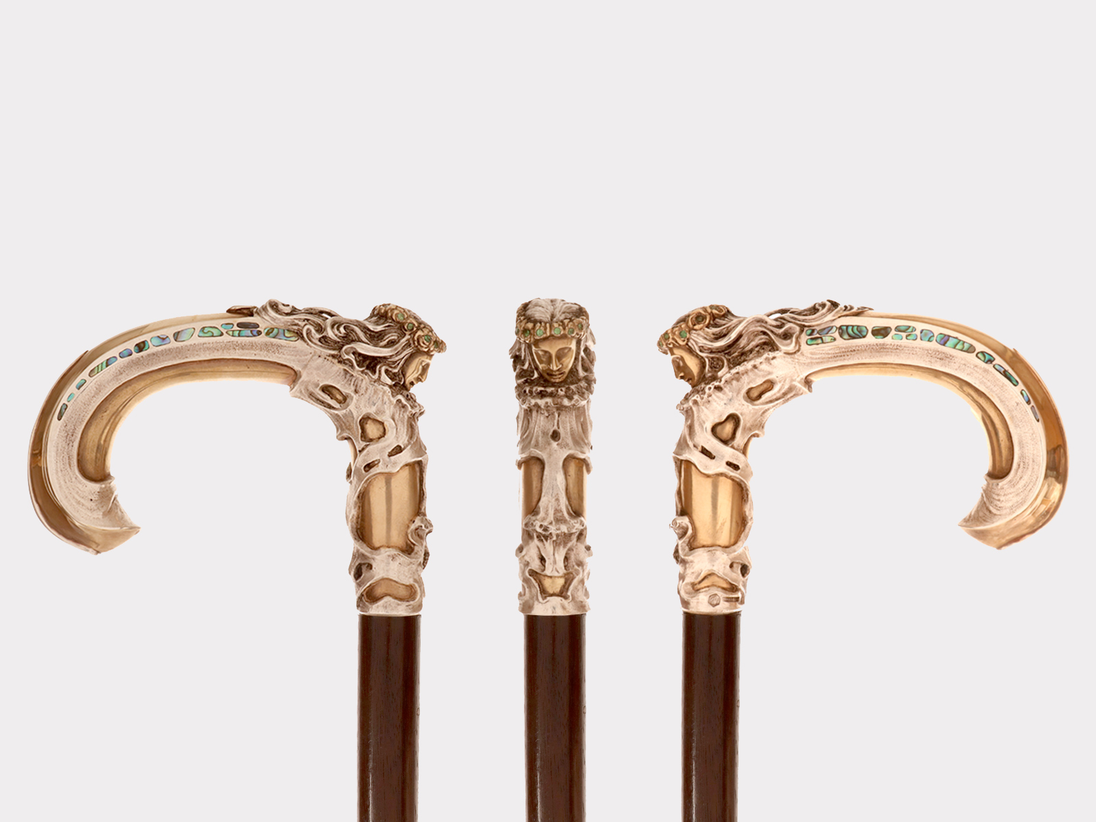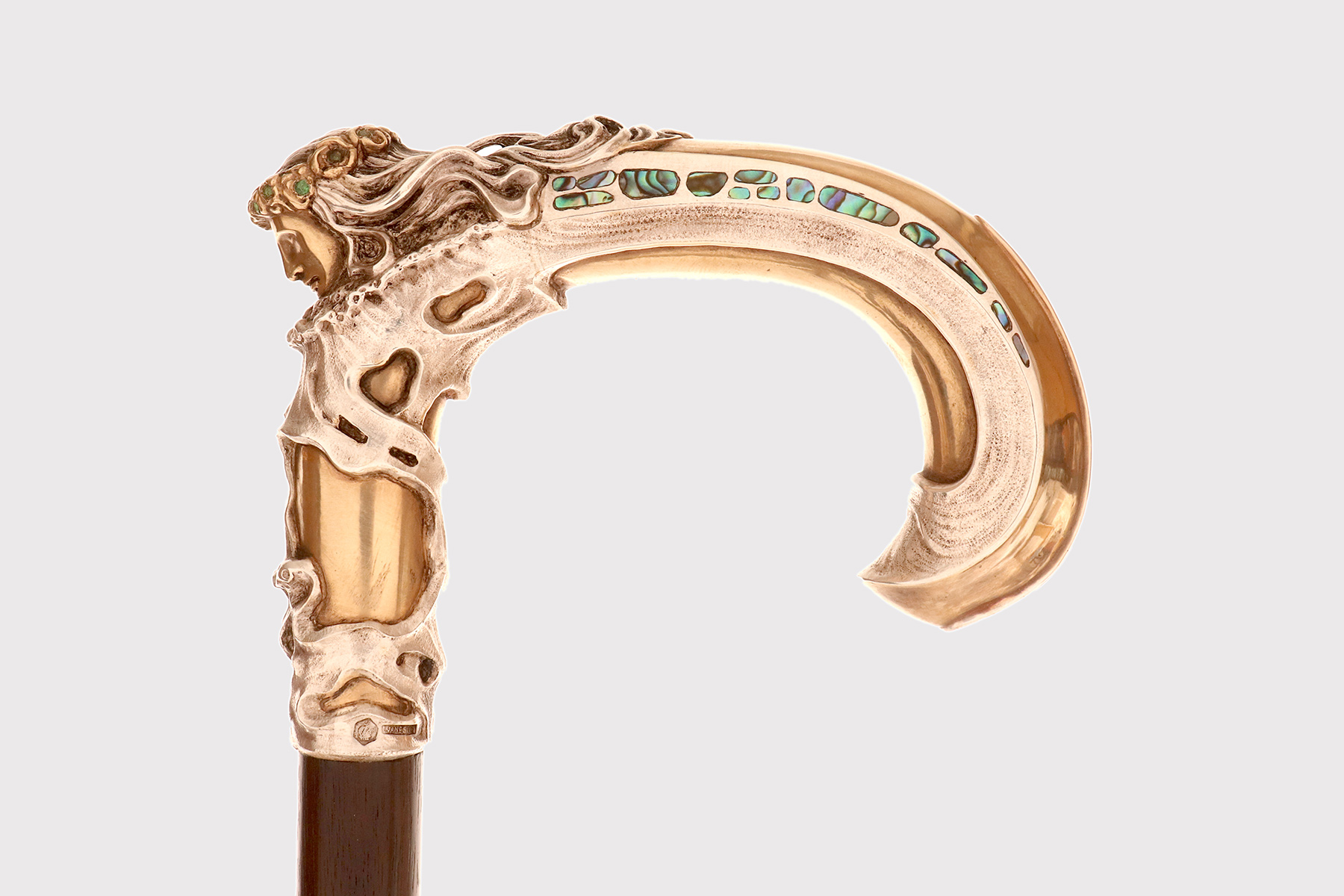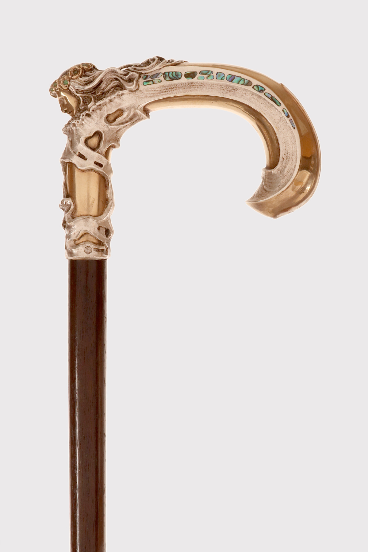 Art Nouveau walking stick: curved handle, designed and crafted by Leopoldo Janesich, in silver with gilded reliefs. An imposing and deeply carved stick. Thick ribbons in pure Art Nouveau style cover the first part of the handle, from the shaft to the end of the stick. At the center, on the curved part of the handle, is a finely carved woman’s face, with long hair and a crown of roses flowers with faceted emeralds in the center, from which two long wings emerge, resembling a cicada. Small pieces of paua mother-of-pearl (sea opal) are embedded along the wings. The cane is made of ebony wood with a metal ferrule. Signed Leopold Janesich, Trieste, Austro-Hungarian Empire, early 1900s. Originally from Dalmatia, Leopold Janesich (1802–1880) founded his business in 1835 in prosperous Trieste, then part of the Austro-Hungarian Empire, on the Adriatic Sea. Janesich created high-quality jewelry and silverware for a distinguished clientele, and his choice of Trieste made his luxury products accessible to the European affluent. Upon his death, his son Giovanni (1826–1927) took over the business and opened a branch in Paris in 1900, continuing to run the Trieste business. The house collaborated with leading jewelers such as Bulgari, Maison Vever, Boucheron, Chaumet, and Daum.