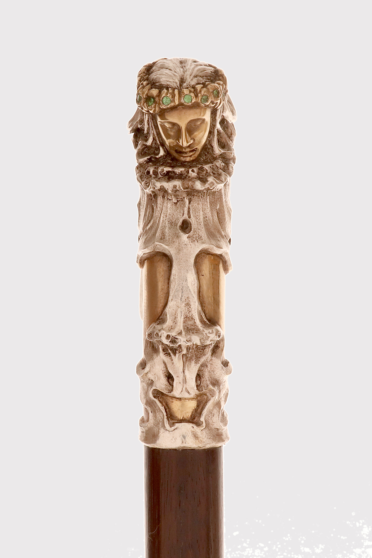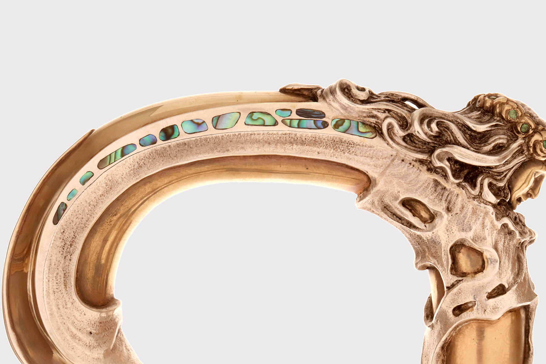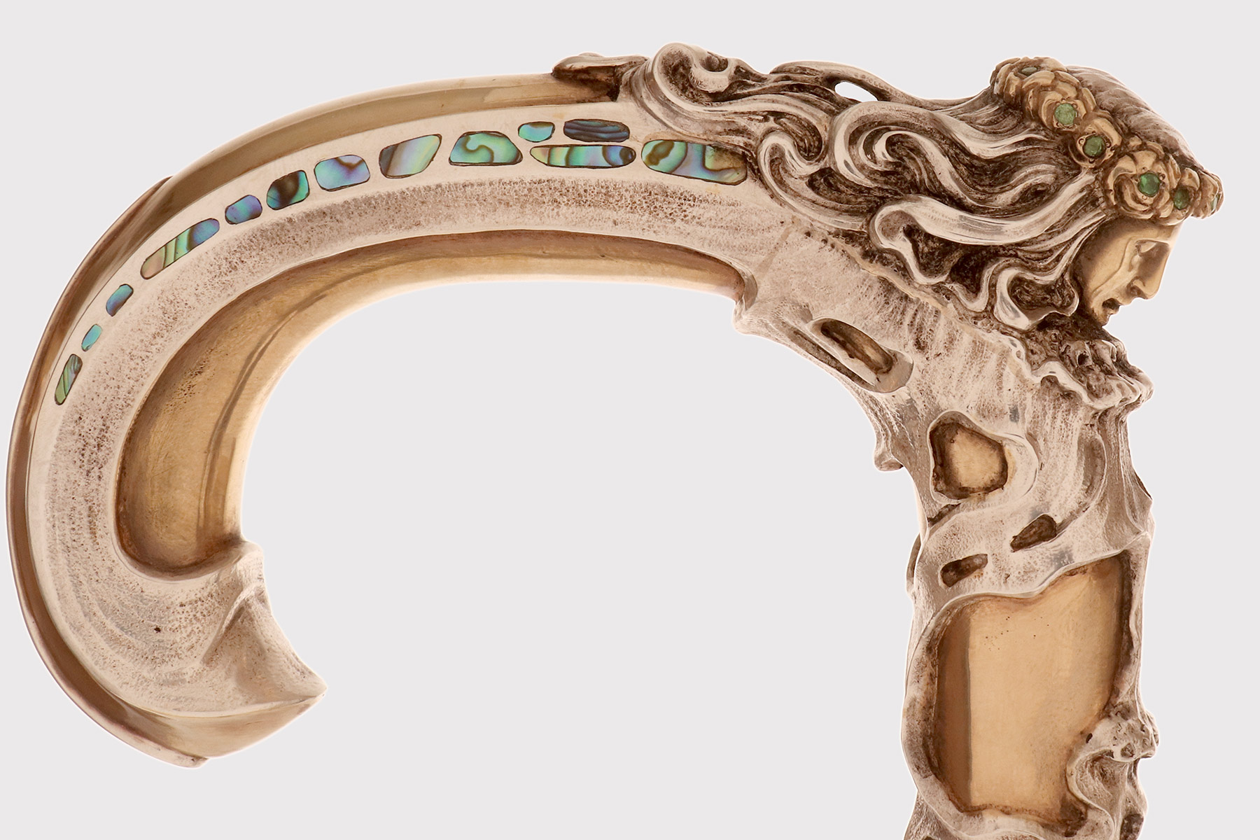 Art Nouveau walking stick: curved handle, designed and crafted by Leopoldo Janesich, in silver with gilded reliefs. An imposing and deeply carved stick. Thick ribbons in pure Art Nouveau style cover the first part of the handle, from the shaft to the end of the stick. At the center, on the curved part of the handle, is a finely carved woman’s face, with long hair and a crown of roses flowers with faceted emeralds in the center, from which two long wings emerge, resembling a cicada. Small pieces of paua mother-of-pearl (sea opal) are embedded along the wings. The cane is made of ebony wood with a metal ferrule. Signed Leopold Janesich, Trieste, Austro-Hungarian Empire, early 1900s. Originally from Dalmatia, Leopold Janesich (1802–1880) founded his business in 1835 in prosperous Trieste, then part of the Austro-Hungarian Empire, on the Adriatic Sea. Janesich created high-quality jewelry and silverware for a distinguished clientele, and his choice of Trieste made his luxury products accessible to the European affluent. Upon his death, his son Giovanni (1826–1927) took over the business and opened a branch in Paris in 1900, continuing to run the Trieste business. The house collaborated with leading jewelers such as Bulgari, Maison Vever, Boucheron, Chaumet, and Daum.