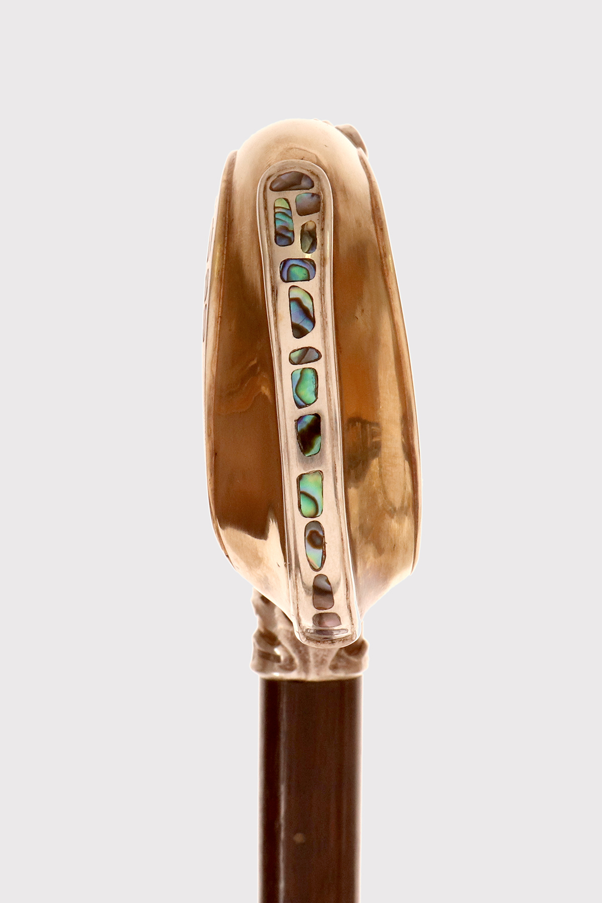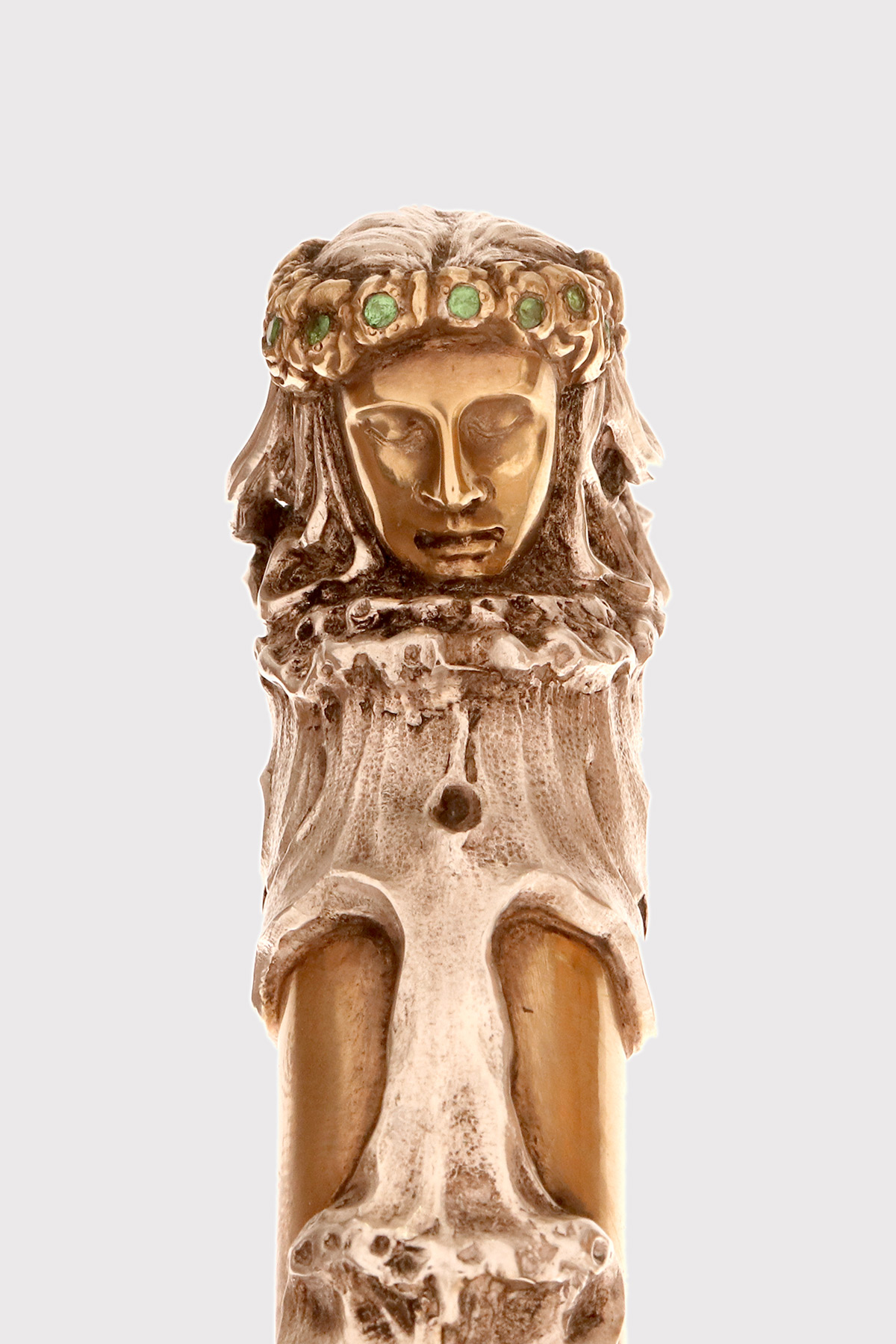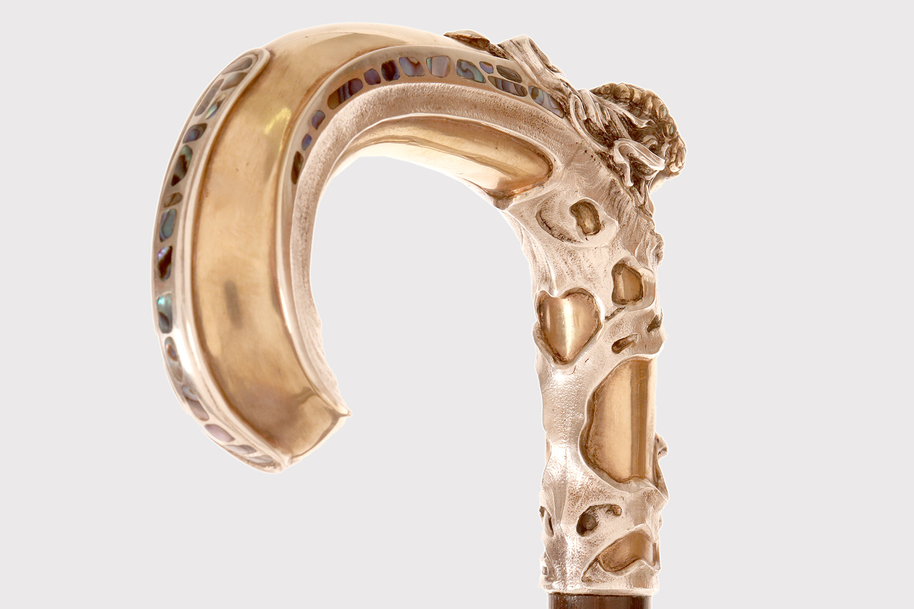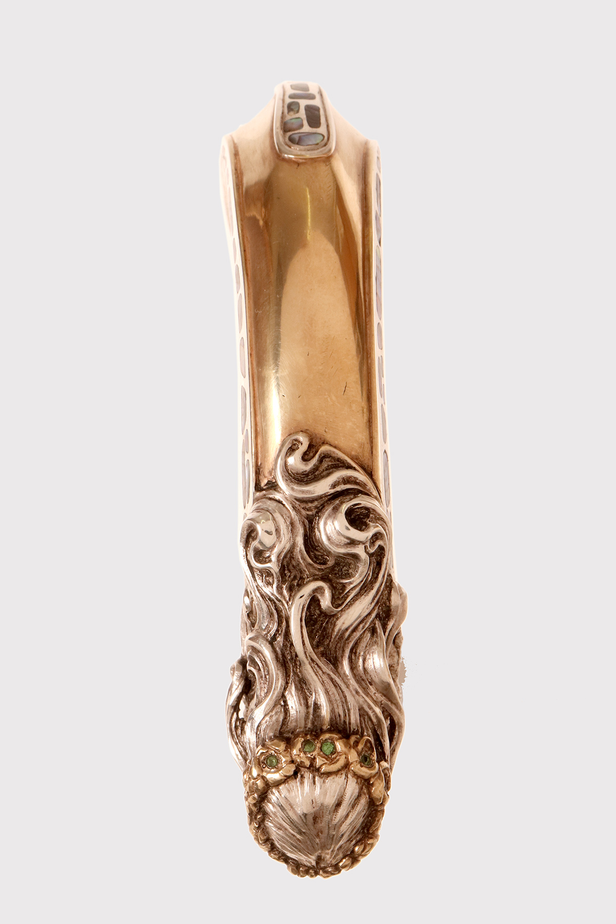 Art Nouveau walking stick: curved handle, designed and crafted by Leopoldo Janesich, in silver with gilded reliefs. An imposing and deeply carved stick. Thick ribbons in pure Art Nouveau style cover the first part of the handle, from the shaft to the end of the stick. At the center, on the curved part of the handle, is a finely carved woman’s face, with long hair and a crown of roses flowers with faceted emeralds in the center, from which two long wings emerge, resembling a cicada. Small pieces of paua mother-of-pearl (sea opal) are embedded along the wings. The cane is made of ebony wood with a metal ferrule. Signed Leopold Janesich, Trieste, Austro-Hungarian Empire, early 1900s. Originally from Dalmatia, Leopold Janesich (1802–1880) founded his business in 1835 in prosperous Trieste, then part of the Austro-Hungarian Empire, on the Adriatic Sea. Janesich created high-quality jewelry and silverware for a distinguished clientele, and his choice of Trieste made his luxury products accessible to the European affluent. Upon his death, his son Giovanni (1826–1927) took over the business and opened a branch in Paris in 1900, continuing to run the Trieste business. The house collaborated with leading jewelers such as Bulgari, Maison Vever, Boucheron, Chaumet, and Daum.