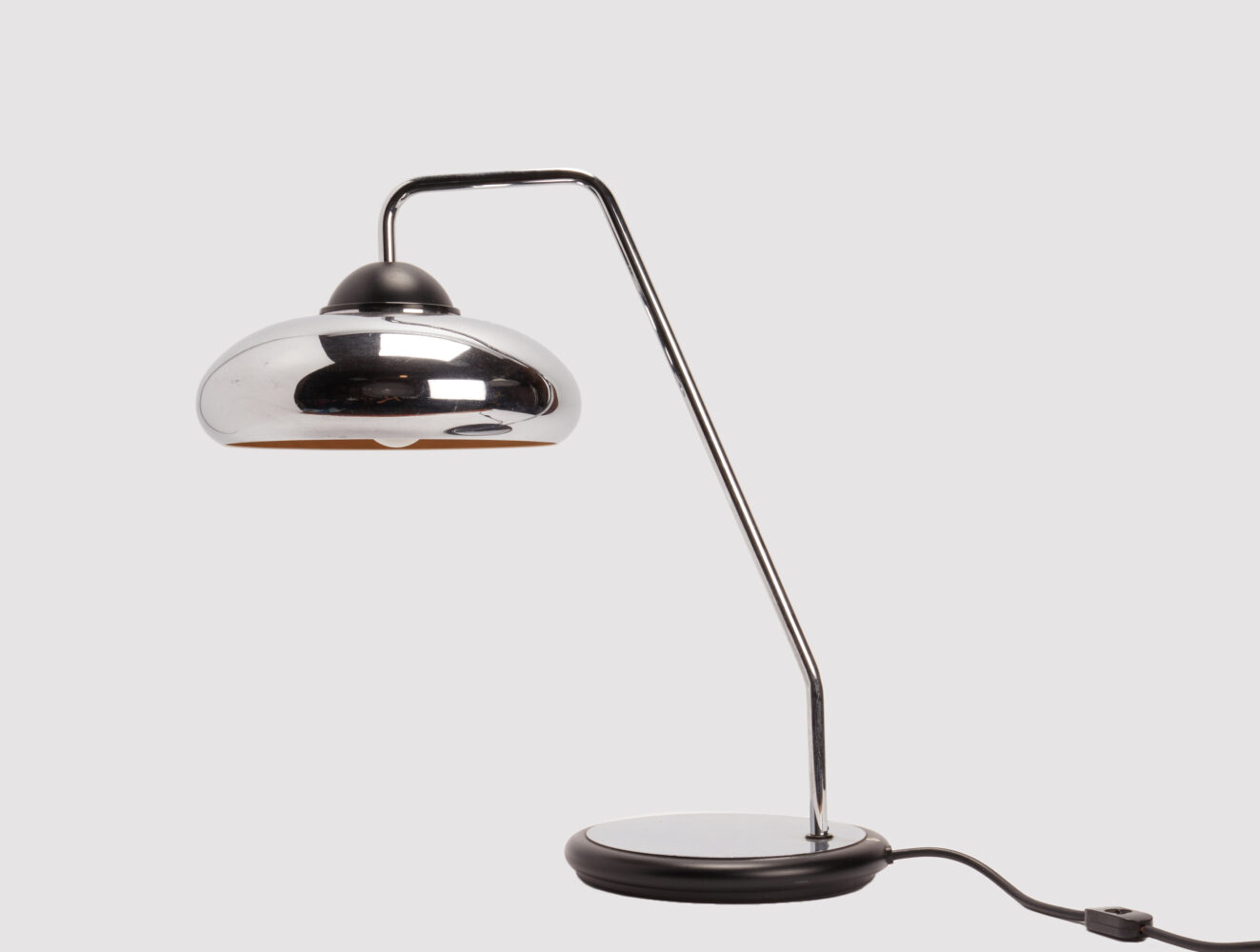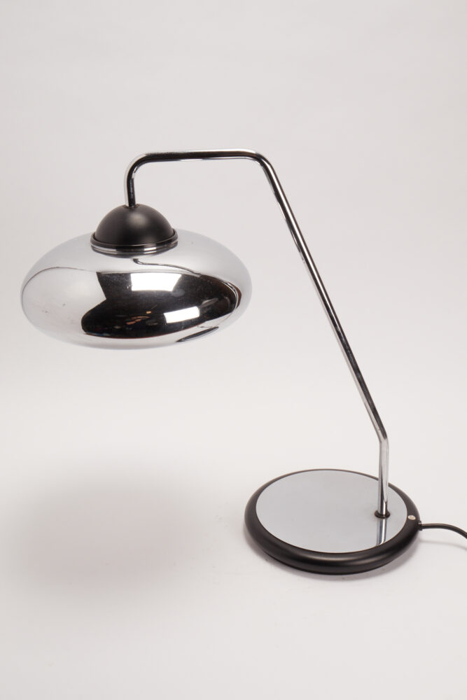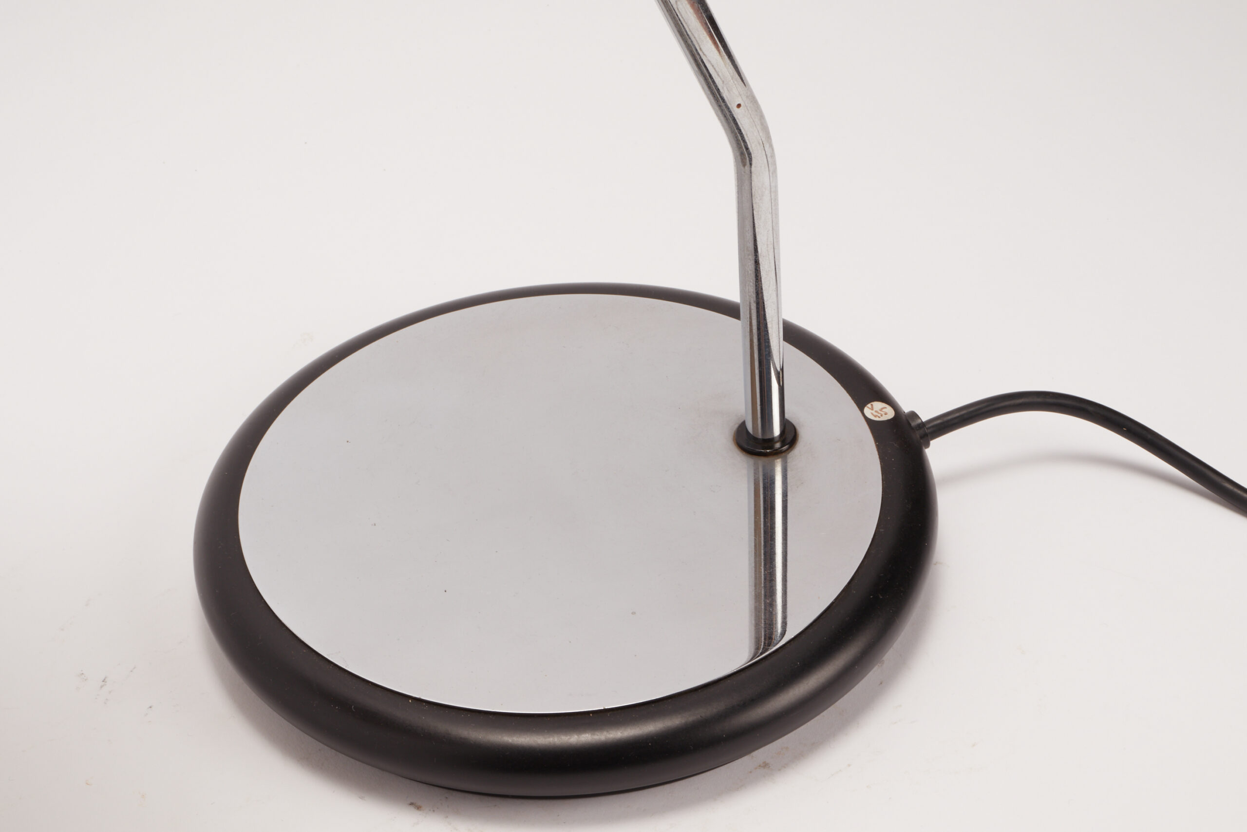 Desk office lamp, round black plastic base and steinless steel tube and shade, maker Stilnovo. Milan, Italy 1980 ca.