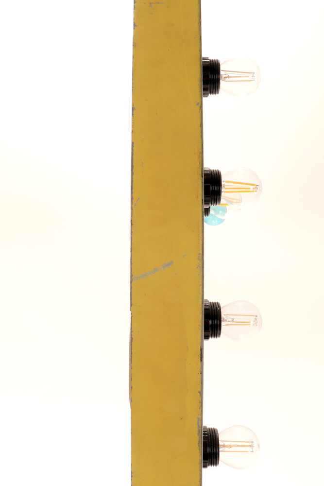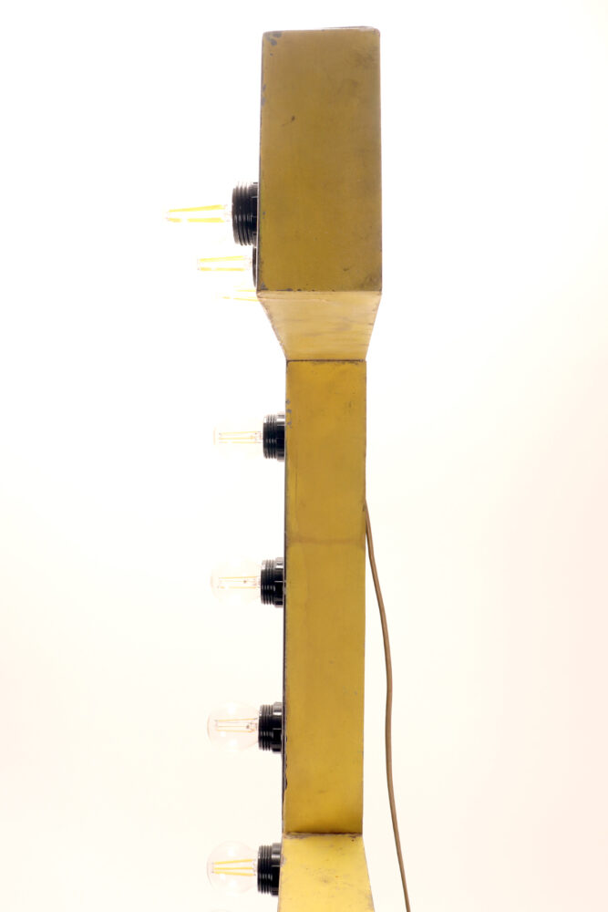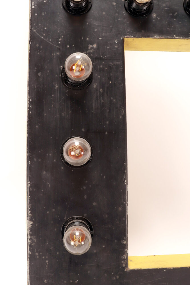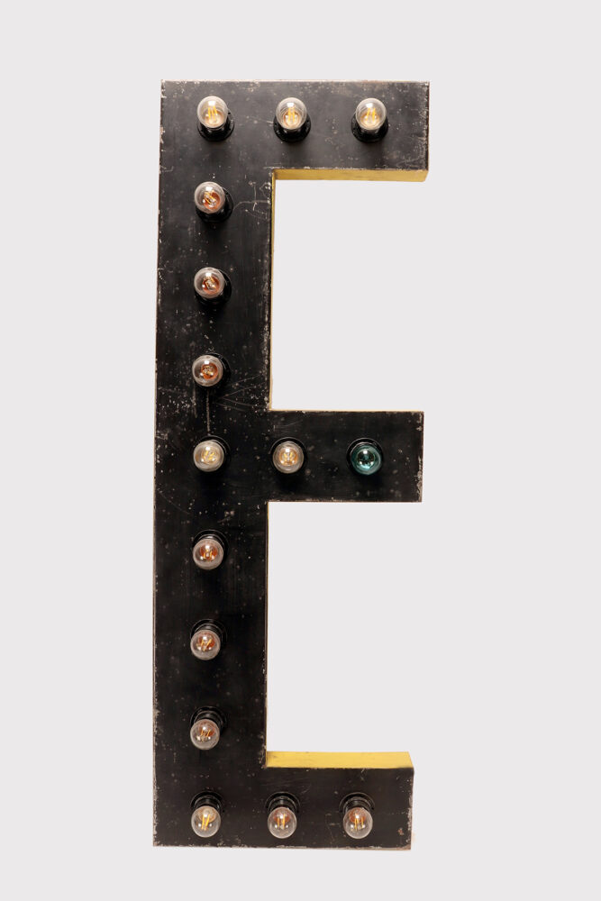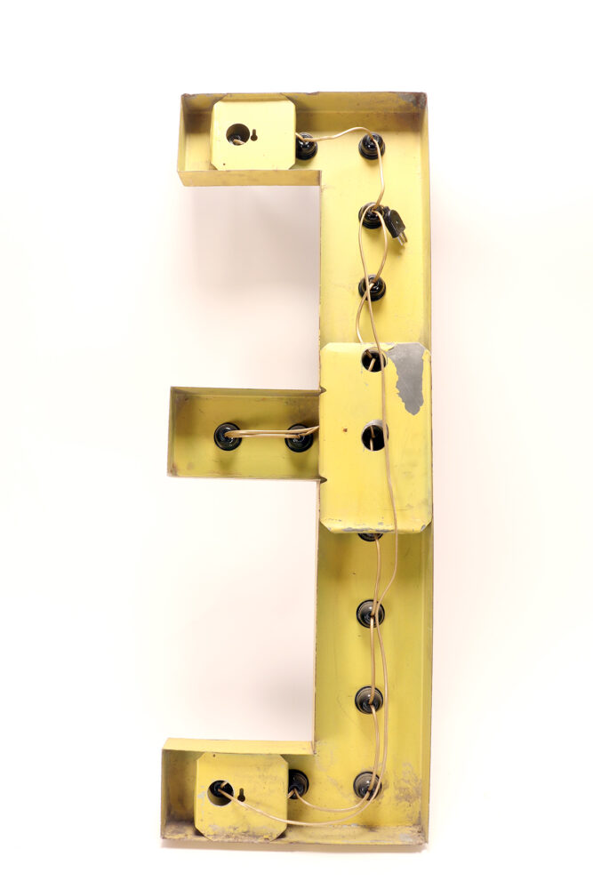 Large painted tin letter E, black on the front, yellow on the sides, re-electrified and illuminated with light bulbs, used as a circus sign. USA circa 1930.